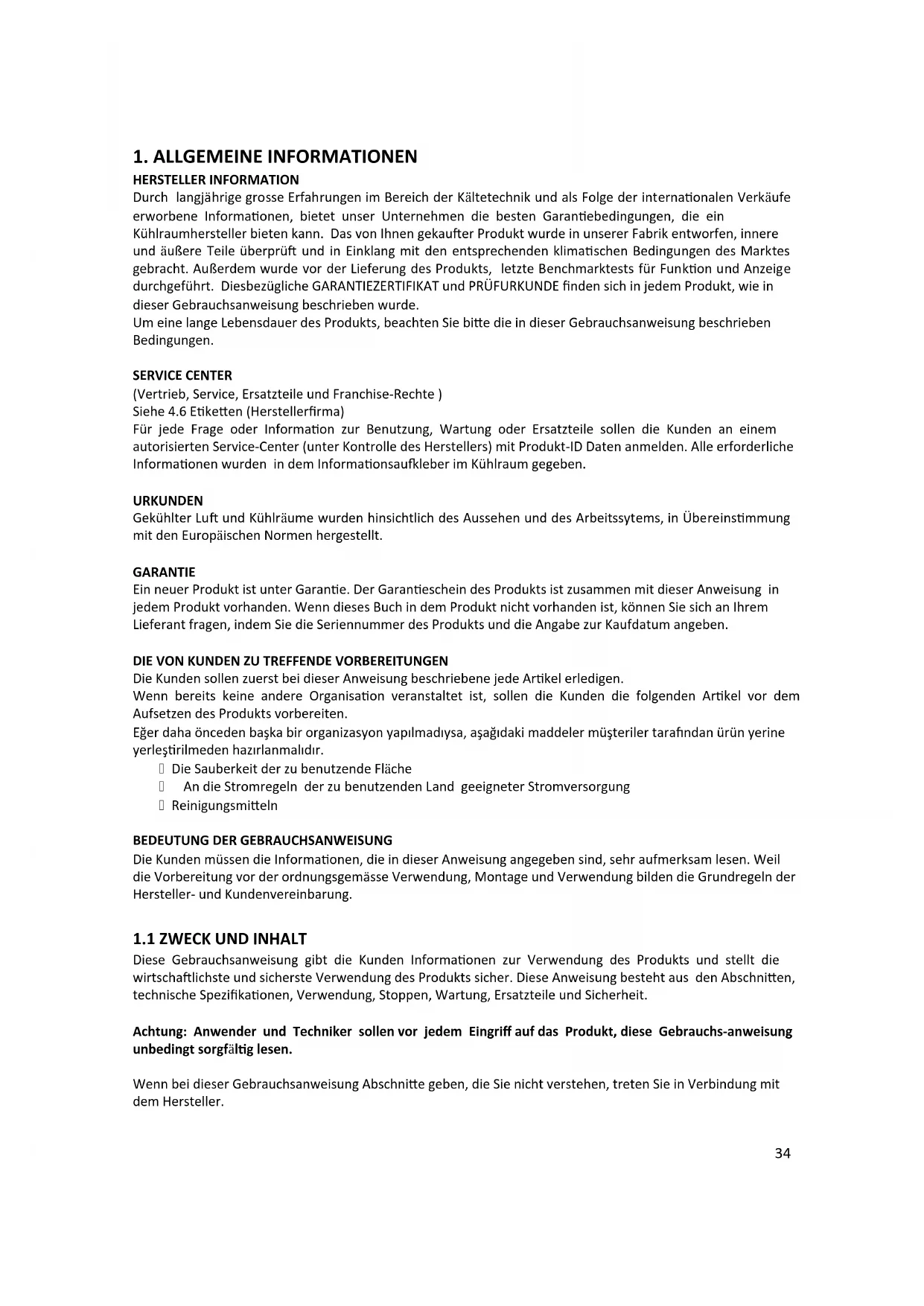 HERSTELLER INFORMATION Durch langjӓhrige grosse Erfahrungen im Bereich der Kӓltetechnik und als Folge der internationalen Verkӓufe erworbene Informationen, bietet unser Unternehmen die besten Garantiebedingungen, die ein Kühlraumhersteller bieten kann. Das von Ihnen gekaufter Produkt wurde in unserer Fabrik entworfen, innere und äußere Teile überprüft und in Einklang mit den entsprechenden klimatischen Bedingungen des Marktes gebracht. Außerdem wurde vor der Lieferung des Produkts, letzte Benchmarktests für Funktion und Anzeige durchgeführt. Diesbezügliche GARANTIEZERTIFIKAT und PRÜFURKUNDE finden sich in jedem Produkt, wie in dieser Gebrauchsanweisung beschrieben wurde. Um eine lange Lebensdauer des Produkts, beachten Sie bitte die in dieser Gebrauchsanweisung beschrieben Bedingungen. SERVICE CENTER (Vertrieb, Service, Ersatzteile und Franchise-Rechte ) Siehe 4.6 Etiketten (Herstellerfirma) Für jede Frage oder Information zur Benutzung, Wartung oder Ersatzteile sollen die Kunden an einem autorisierten Service-Center (unter Kontrolle des Herstellers) mit Produkt-ID Daten anmelden. Alle erforderliche Informationen wurden in dem Informationsaufkleber im Kühlraum gegeben. URKUNDEN Gekühlter Luft und Kühlräume wurden hinsichtlich des Aussehen und des Arbeitssytems, in Übereinstimmung mit den Europäischen Normen hergestellt. GARANTIE Ein neuer Produkt ist unter Garantie. Der Garantieschein des Produkts ist zusammen mit dieser Anweisung in jedem Produkt vorhanden. Wenn dieses Buch in dem Produkt nicht vorhanden ist, können Sie sich an Ihrem Lieferant fragen, indem Sie die Seriennummer des Produkts und die Angabe zur Kaufdatum angeben.