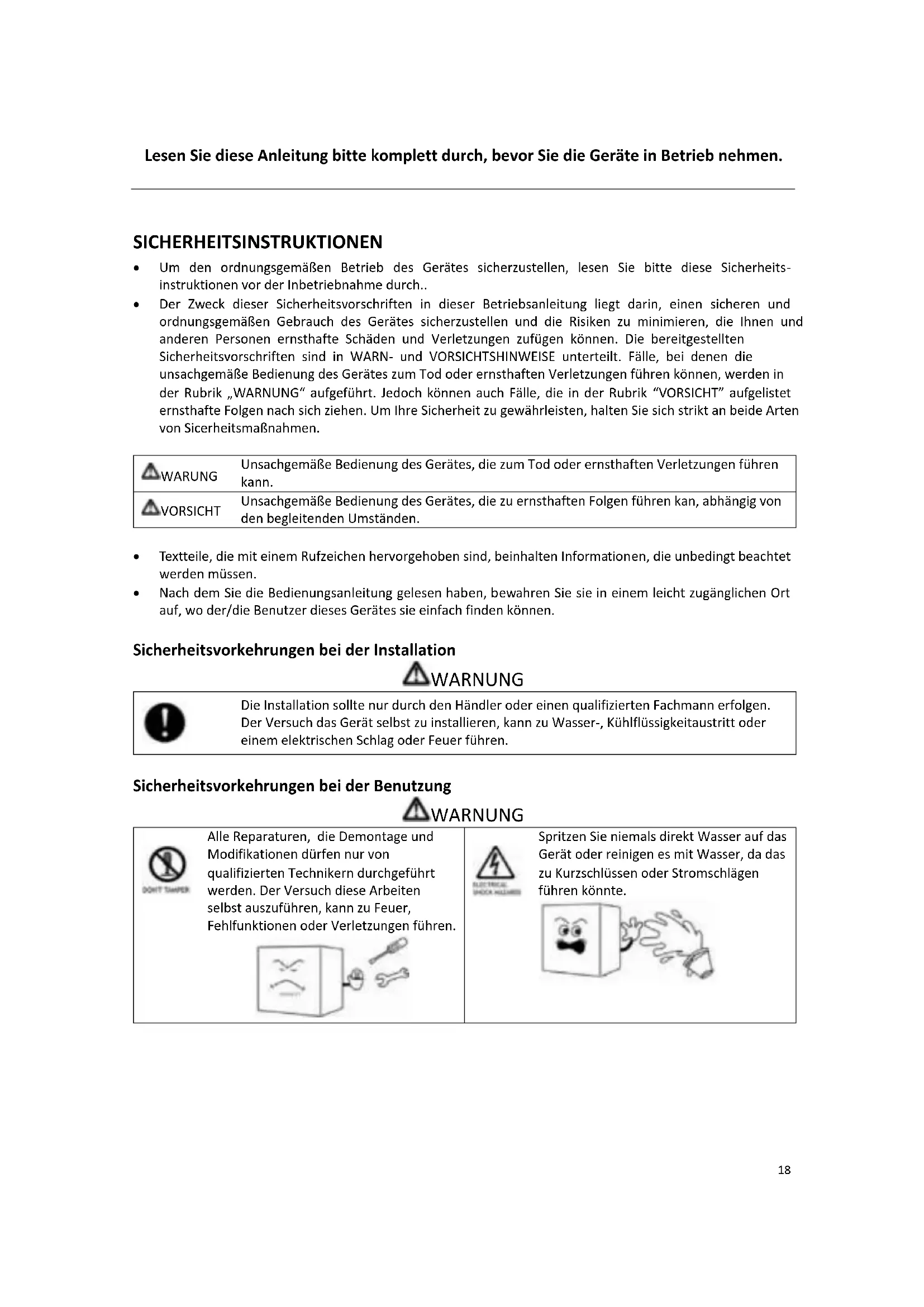 SICHERHEITSINSTRUKTIONEN Um den ordnungsgemäßen Betrieb des Gerätes sicherzustellen, lesen Sie bitte diese Sicherheits- instruktionen vor der Inbetriebnahme durch.. Der Zweck dieser Sicherheitsvorschriften in dieser Betriebsanleitung liegt darin, einen sicheren und ordnungsgemäßen Gebrauch des Gerätes sicherzustellen und die Risiken zu minimieren, die Ihnen und anderen Personen ernsthafte Schäden und Verletzungen zufügen können. Die bereitgestellten Sicherheitsvorschriften sind in WARN- und VORSICHTSHINWEISE unterteilt. Fälle, bei denen die unsachgemäße Bedienung des Gerätes zum Tod oder ernsthaften Verletzungen führen können, werden in der Rubrik „WARNUNG“ aufgeführt. Jedoch können auch Fälle, die in der Rubrik “VORSICHT” aufgelistet ernsthafte Folgen nach sich ziehen. Um Ihre Sicherheit zu gewährleisten, halten Sie sich strikt an beide Arten von Sicerheitsmaßnahmen. WARUNG Unsachgemäße Bedienung des Gerätes, die zum Tod oder ernsthaften Verletzungen führen kann. VORSICHT Unsachgemäße Bedienung des Gerätes, die zu ernsthaften Folgen führen kan, abhängig von den begleitenden Umständen.