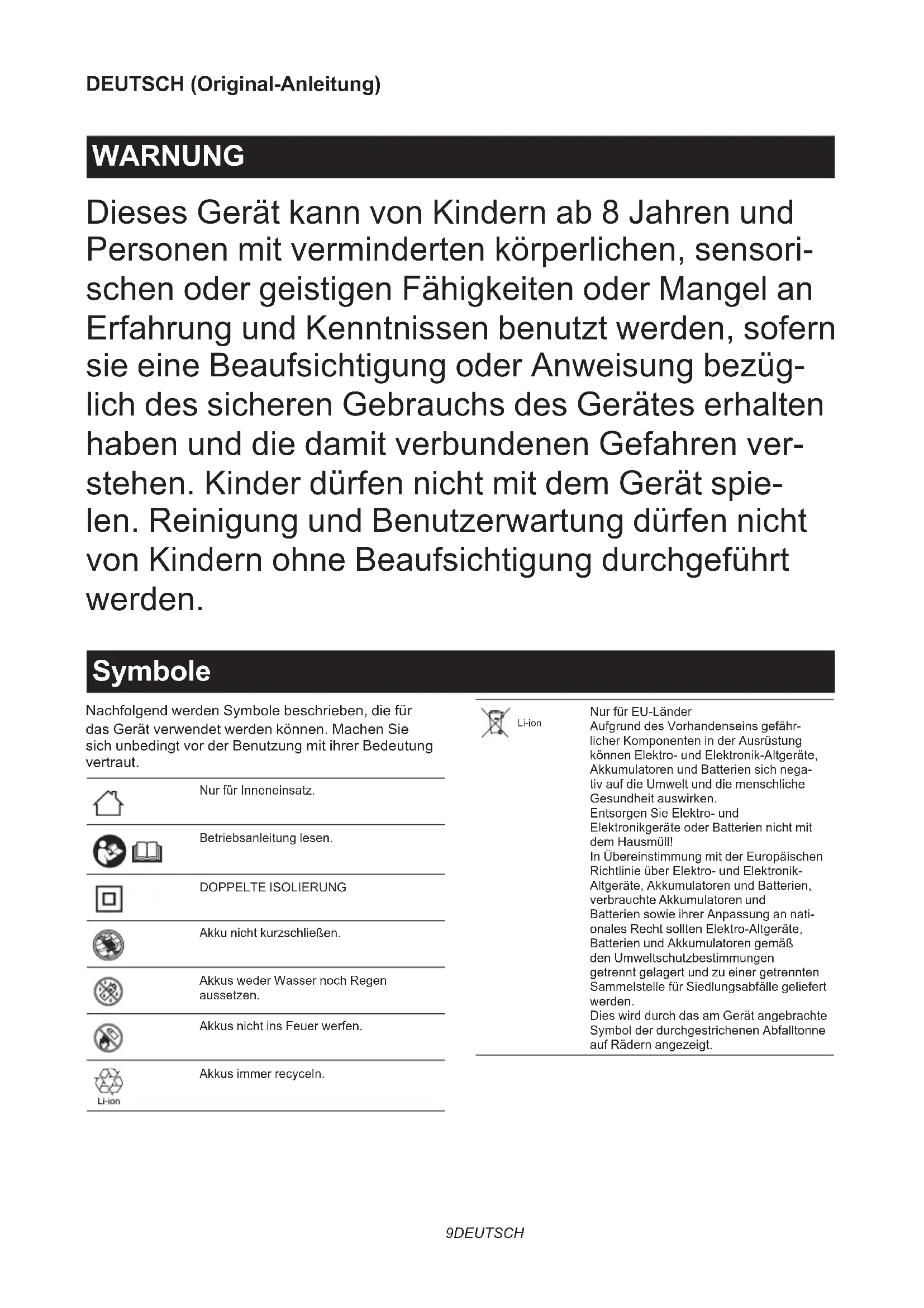 Waschbenzin, Verdünner, Alkohol oder derglei- chen zum Reinigen des Ladegerätes. Solche Mittel können Verfärbung, Verformung oder Rissbildung verursachen.11 DEUTSCH Auaden