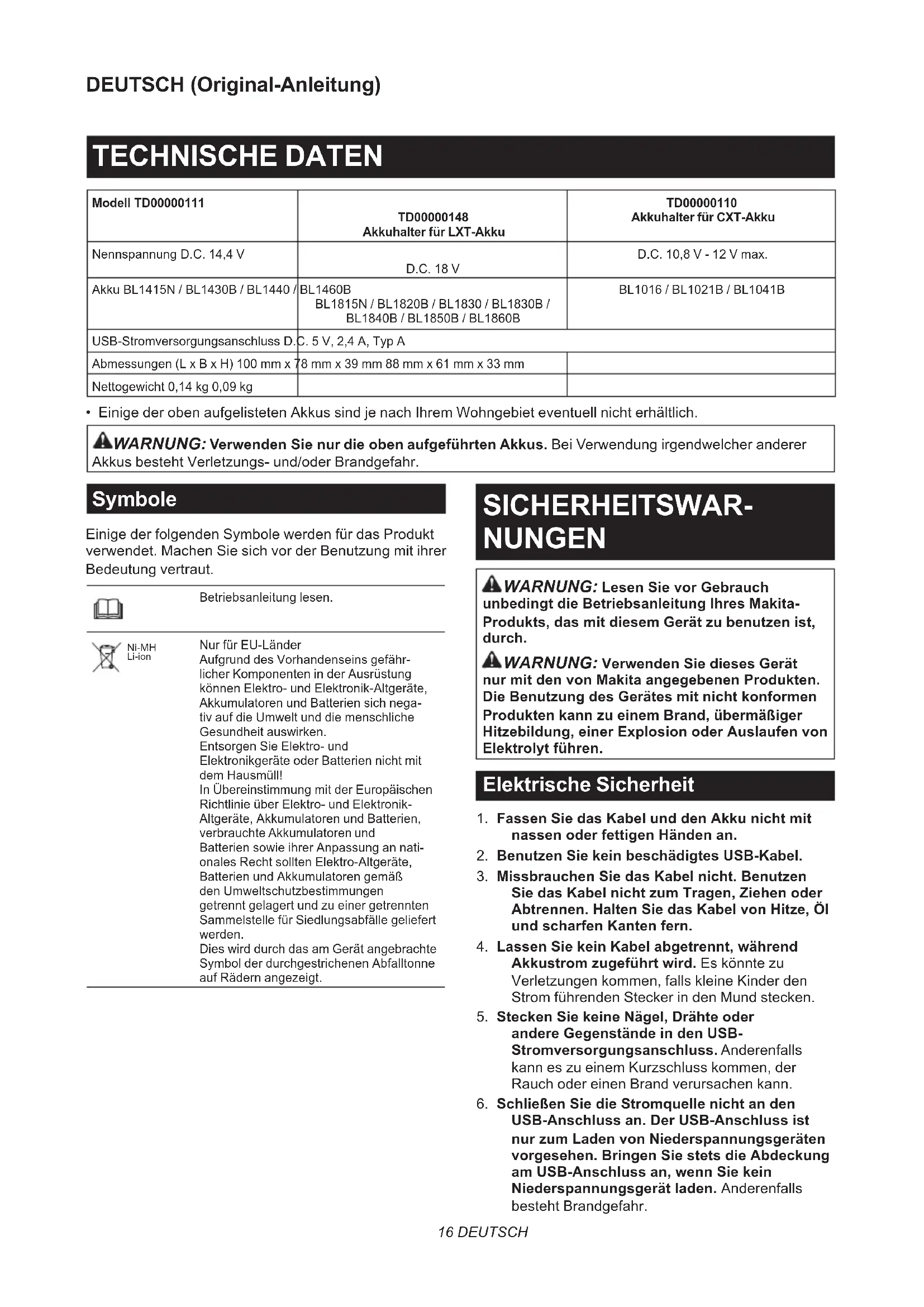 Um den Akku anzubringen, richten Sie die Feder am Akku auf die Führungsnut im Gehäuse aus, und schieben Sie den Akku hinein. Schieben Sie den Akku vollständig ein, bis er mit einem leisen Klicken einrastet. Falls die rote Anzeige an der Oberseite des Knopfes sichtbar ist, ist der Akku nicht vollständig verriegelt. Ziehen Sie den Akku zum Abnehmen vom Akkuhalter ab, während Sie den Knopf an der Vorderseite des Akkus drücken. VORSICHT: Schieben Sie den Akku stets bis zum Anschlag ein, bis die rote Anzeige nicht mehr sichtbar ist. Anderenfalls kann der Akku versehent- lich aus dem Akkuhalter herausfallen und Sie oder umstehende Personen verletzen. VORSICHT: Unterlassen Sie Gewaltanwendung beim Anbringen des Akkus. Falls der Akku nicht reibungslos hinein gleitet, ist er nicht richtig ausgerichtet. Anbringen des Akkuhalters Sie können den Akkuhalter an Ihren Hüftgurt hängen. Um versehentliches Herunterfallen des Akkuhalters zu verhindern, ziehen Sie einen Riemen durch die Riemenöse, und sichern Sie ihn. ► Abb.3: 1. Riemenöse Der Akkuhalter hat eine Fallschutzfunktion. Wenn Sie den Akkuhalter vom Gürtel entfernen, ziehen Sie den Akkuhalter hoch, während Sie den Entriegelungsknopf drücken. ► Abb.4: 1. Entriegelungsknopf Anschließen von USB-Geräten VORSICHT: Schließen Sie nur Geräte an, die mit dem USB-Stromversorgungsanschluss kompatibel sind. Anderenfalls kann eine Funktionsstörung des Akkuhalters verursacht werden. ANMERKUNG: Bevor Sie ein USB-Gerät an den Akkuhalter (mit dem Akku) anschließen, sichern Sie stets die Daten im USB-Gerät. Anderenfalls kann es zu einem Verlust Ihrer Daten kommen. ANMERKUNG: Manche USB-Geräte können u. U. nicht über den Akkuhalter mit Strom versorgt werden. ANMERKUNG: Wenn das Gerät nicht benutzt wird oder der Ladevorgang beendet ist, entfer- nen Sie das USB-Kabel, und schließen Sie die Abdeckung. Der Akkuhalter (mit dem Akku) kann als externe Stromquelle für USB-Geräte fungieren. Önen Sie die Abdeckung, und schließen Sie ein USB-Kabel (nicht mitgeliefert) an den USB-Anschluss des Akkuhalters an. Schließen Sie dann das andere Ende des Kabels an das Gerät an. Zum Starten des Ladevorgangs halten Sie die Ein-Aus-Taste gedrückt, bis die Leistungsstufenanzeige aueuchtet. Zum Stoppen des Ladevorgangs halten Sie die Ein-Aus- Taste gedrückt, bis die Leistungsstufenanzeige erlischt. ► Abb.5: 1. Abdeckung 2. USB-Anschluss HINWEIS: Der tatsächliche Ausgangsstrom ist je nach dem anzuschließenden USB-Gerät unterschiedlich. HINWEIS: Bei eingeschalteter Ein-Aus-Taste wird Akkustrom verbraucht. Schalten Sie den Schalter bei Nichtgebrauch stets aus. HINWEIS: Wenn Sie mehrere USB-Geräte nachein- ander laden, warten Sie etwa 10 Sekunden, nachdem der Ladevorgang des vorherigen Gerätes abge- schlossen worden ist, bevor Sie mit dem Laden des nächsten Gerätes beginnen.20 DEUTSCH WARTUNG ANMERKUNG: Verwenden Sie auf keinen Fall Benzin, Waschbenzin, Verdünner, Alkohol oder dergleichen. Solche Mittel können Verfärbung, Verformung oder Rissbildung verursachen. ANMERKUNG: Waschen Sie den Akkuhalter nicht mit Wasser. — Wischen Sie Schmutz, Staub, Öl, Fett usw. auf dem Gehäuse mit einem sauberen trocke- nen Lappen oder einem Lappen, den Sie in Seifenwasser getaucht und gut ausgewrungen haben, ab. — Bewahren Sie das Gerät an einem Ort auf, der nicht extrem heiß, kalt oder feucht ist. Um die SICHERHEIT und ZUVERLÄSSIGKEIT dieses Produkts zu gewährleisten, sollten Reparaturen und andere Wartungs- oder Einstellarbeiten nur von Makita- Vertragswerkstätten oder Makita-Kundendienstzentren unter ausschließlicher Verwendung von Makita- Originalersatzteilen ausgeführt werden.21 ITALIANO ITALIANO (Istruzioni originali) DATI TECNICI Modello TD00000111 TD00000148 Portabatteria per cartuccia della batteria LXT TD00000110 Portabatteria per cartuccia della batteria CXT Tensione nominale CC 14,4 V CC 18 V CC Da 10,8 V a 12 V max Cartuccia della batteria BL1415N / BL1430B / BL1440 / BL1460B BL1815N / BL1820B / BL1830 / BL1830B / BL1840B / BL1850B / BL1860B BL1016 / BL1021B / BL1041B Porta di alimentazione USB CC 5 V, 2,4 A, Tipo A Dimensioni (L x P x A) 100 mm x 78 mm x 39 mm 88 mm x 61 mm x 33 mm Peso netto 0,14 kg 0,09 kg