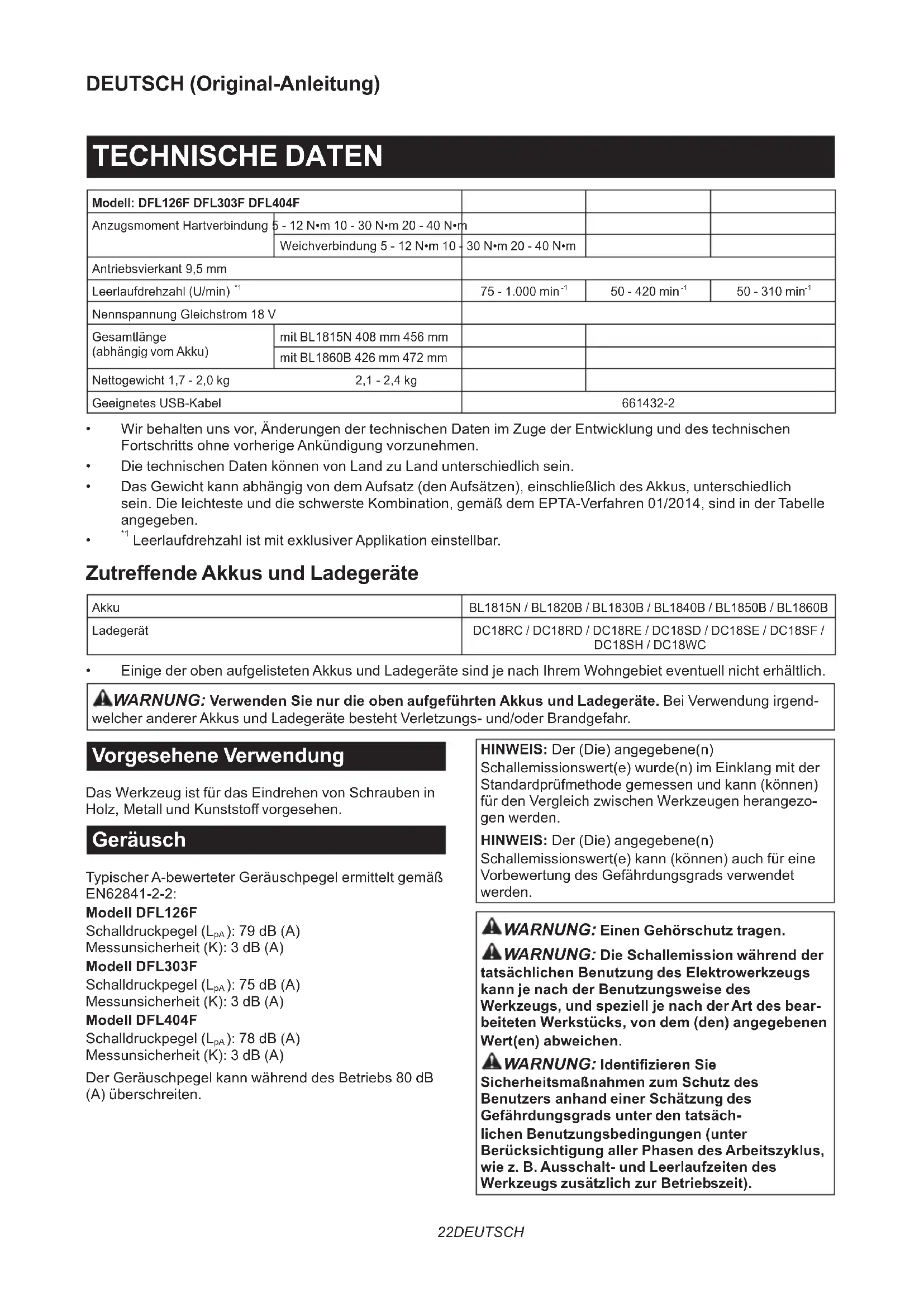 - Einige der oben aufgelisteten Akkus und Ladegeräte sind je nach Ihrem Wohngebiet eventuell nicht erhältlich. WARNUNG: Verwenden Sie nur die oben aufgeführten Akkus und Ladegeräte. Bei Verwendung irgend- welcher anderer Akkus und Ladegeräte besteht Verletzungs- und/oder Brandgefahr. Vorgesehene Verwendung Das Werkzeug ist für das Eindrehen von Schrauben in Holz,MetallundKunststovorgesehen. Geräusch Typischer A-bewerteter Geräuschpegel ermittelt gemäß EN62841-2-2: Modell DFL126F Schalldruckpegel (L
