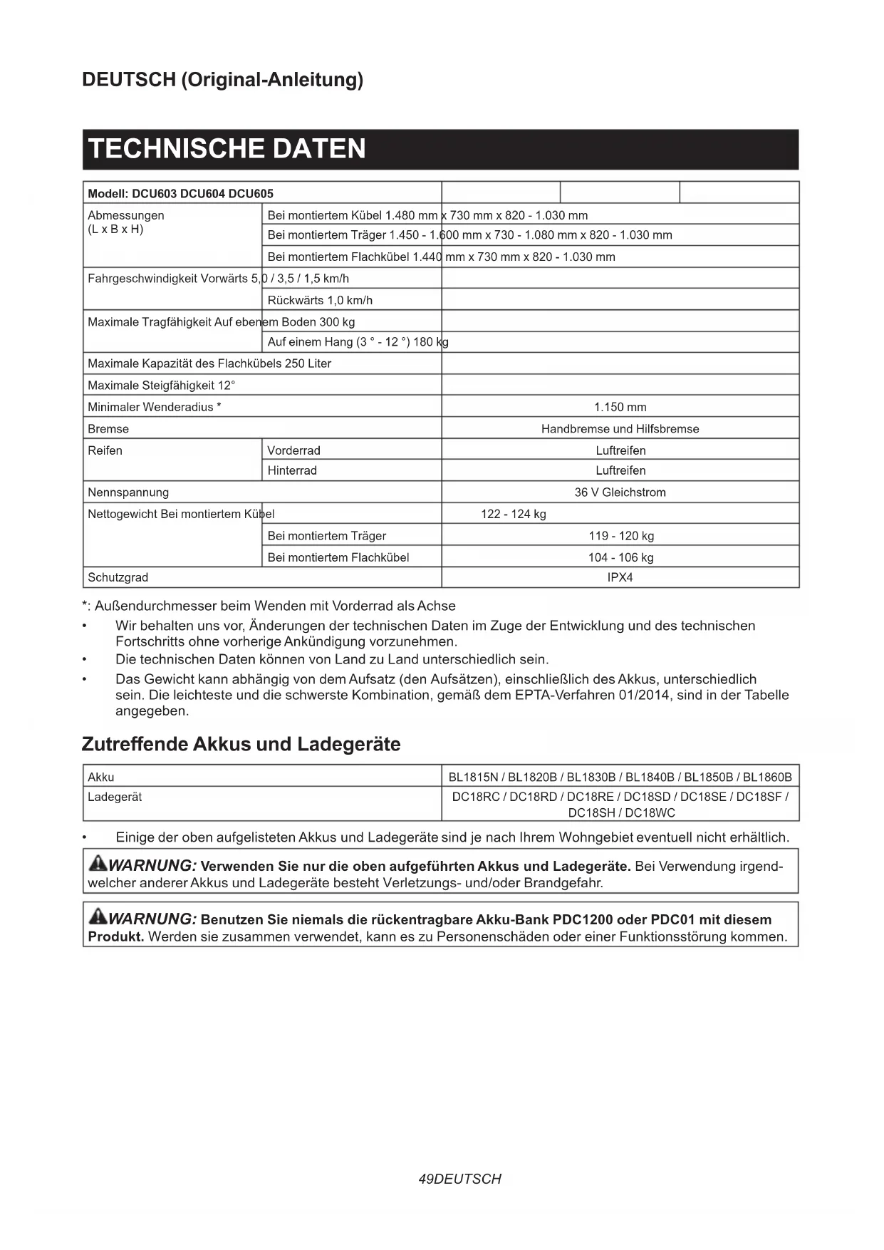 - Batterie et chargeur de marque Makita NOTE : Il se peut que certains éléments de la liste soient compris dans l’emballage de l’outil en tant qu’accessoires standard. Ils peuvent varier d’un pays à l’autre.49 DEUTSCH DEUTSCH (Original-Anleitung) TECHNISCHE DATEN Modell: DCU603 DCU604 DCU605 Abmessungen (L x B x H) Bei montiertem Kübel 1.480 mm x 730 mm x 820 - 1.030 mm Bei montiertem Träger 1.450 - 1.600 mm x 730 - 1.080 mm x 820 - 1.030 mm Bei montiertem Flachkübel 1.440 mm x 730 mm x 820 - 1.030 mm Fahrgeschwindigkeit Vorwärts 5,0 / 3,5 / 1,5 km/h Rückwärts 1,0 km/h Maximale Tragfähigkeit Auf ebenem Boden 300 kg Auf einem Hang (3 ° - 12 °) 180 kg Maximale Kapazität des Flachkübels 250 Liter Maximale Steigfähigkeit 12° Minimaler Wenderadius * 1.150 mm Bremse Handbremse und Hilfsbremse Reifen Vorderrad Luftreifen Hinterrad Luftreifen Nennspannung 36 V Gleichstrom Nettogewicht Bei montiertem Kübel 122 - 124 kg Bei montiertem Träger 119 - 120 kg Bei montiertem Flachkübel 104 - 106 kg Schutzgrad IPX4 *: Außendurchmesser beim Wenden mit Vorderrad als Achse