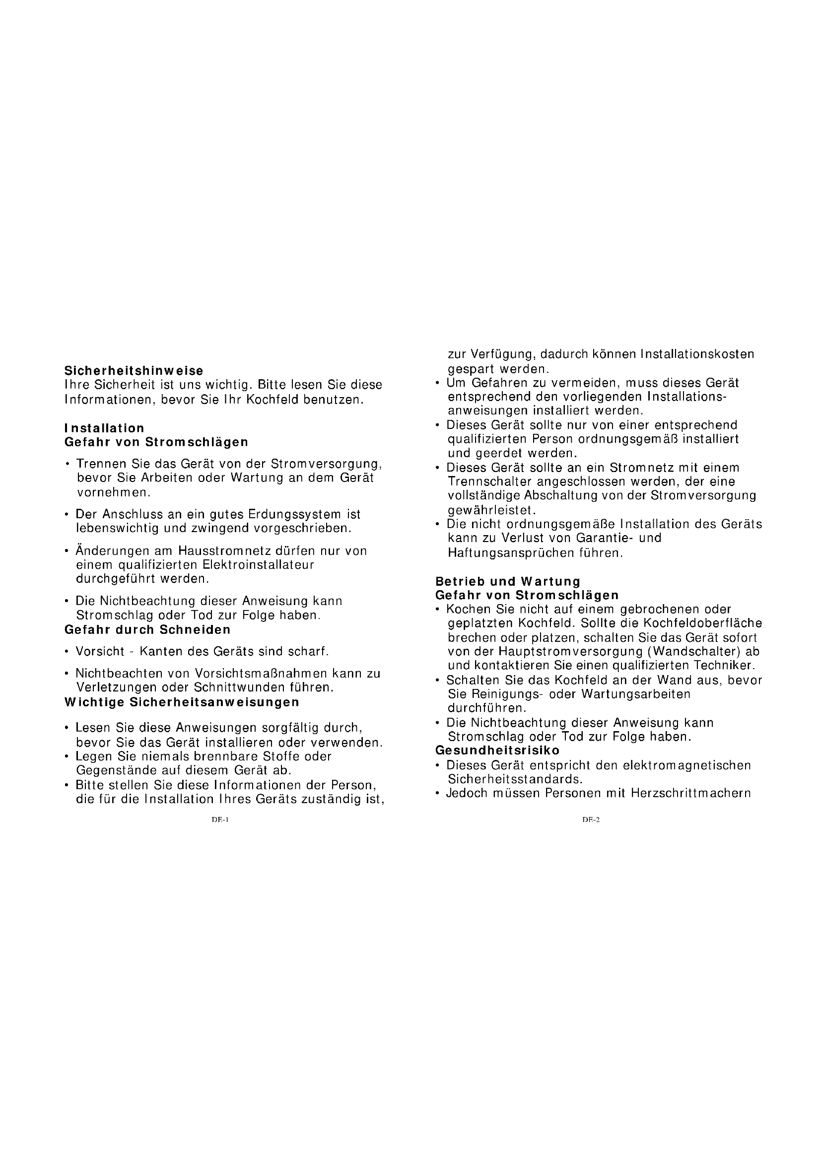 - Bitte stellen Sie diese Informationen der Person, die für die Installation Ihres Geräts zuständig ist, DE-1 Sicherheitshinweise Ihre Sicherheit ist uns wichtig. Bitte lesen Sie diese Informationen, bevor Sie Ihr Kochfeld benutzen. Installation Gefahr von Stromschlägen