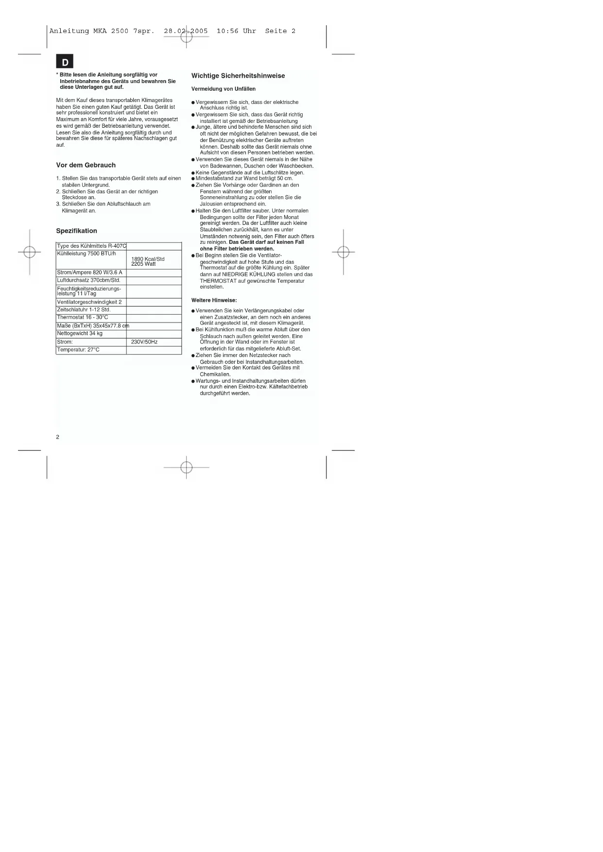 Instrukcja obsługi Klimatyzator MKA 2500 E Anleitung MKA 2500 7spr. 28.02.2005 10:56 Uhr Seite 1* Bitte lesen die Anleitung sorgfältig vor Inbetriebnahme des Geräts und bewahren Sie diese Unterlagen gut auf. Mit dem Kauf dieses transportablen Klimagerätes haben Sie einen guten Kauf getätigt. Das Gerät ist sehr professionell konstruiert und bietet ein Maximum an Komfort für viele Jahre, vorausgesetzt es wird gemäß der Betriebsanleitung verwendet. Lesen Sie also die Anleitung sorgfältig durch und bewahren Sie diese für späteres Nachschlagen gut auf. Vor dem Gebrauch