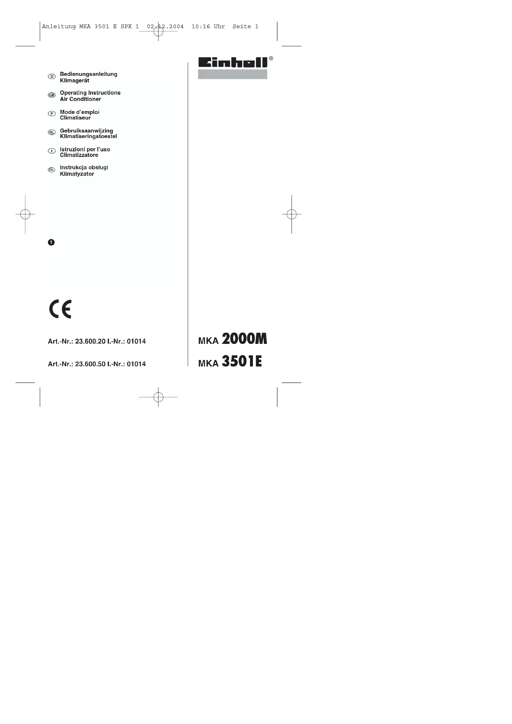 MKA 2000 M - Klimaanlage EINHELL - Kostenlose Bedienungsanleitung