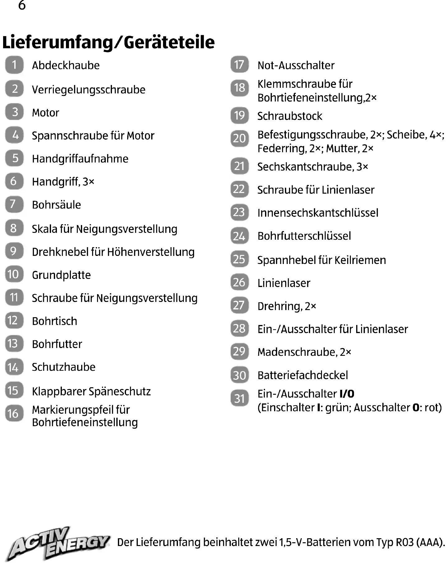 Ein-/Ausschalter I/O (Einschalter I: grün; Ausschalter O: rot) Der Lieferumfang beinhaltet zwei 1,5-V-Batterien vom Typ R03 (AAA).QR-Codes