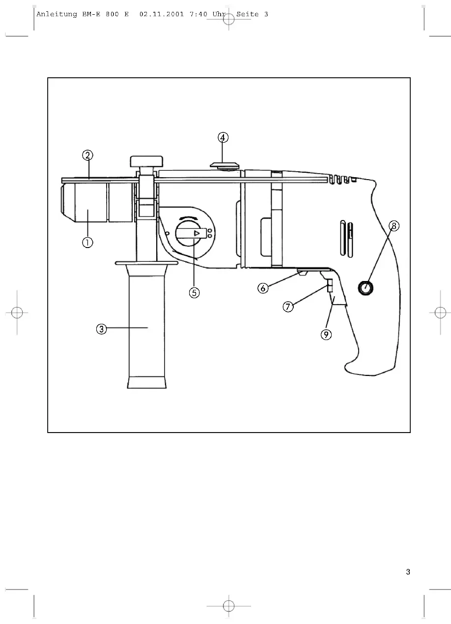 Lieferumfang BME 800 Schnellspannbohrfutter 1,5 - 13 mm, Zusatzhandgriff mit Tiefenanschlag VERWENDUNG Die Bohrmaschine ist zum Bohren von Löchern in Holz, Eisen, Buntmetallen und Gestein unter Ver- wendung des entsprechenden Bohrwerkzeugs ausgelegt. Beschreibung 1 Schnellspannbohrfutter 2 Bohrtiefenanschlag 3 Zusatzgriff 4 Bohren/Schlagbohren-Umschalter 5 Umschalter 1. Gang / 2. Gang 6 Rechts-/Linkslauf-Umschalter 7 Drehzahl-Regler 8 Feststellknopf 9 Betriebsschalter Technische Daten Netzspannung 230 V ~ 50 Hz Aufnahmeleistung 800 W Bohrleistung Beton 16 mm. Stahl 13 mm Holz 25 mm Leerlaufdrehzahl 1. Gang 0 - 920 min