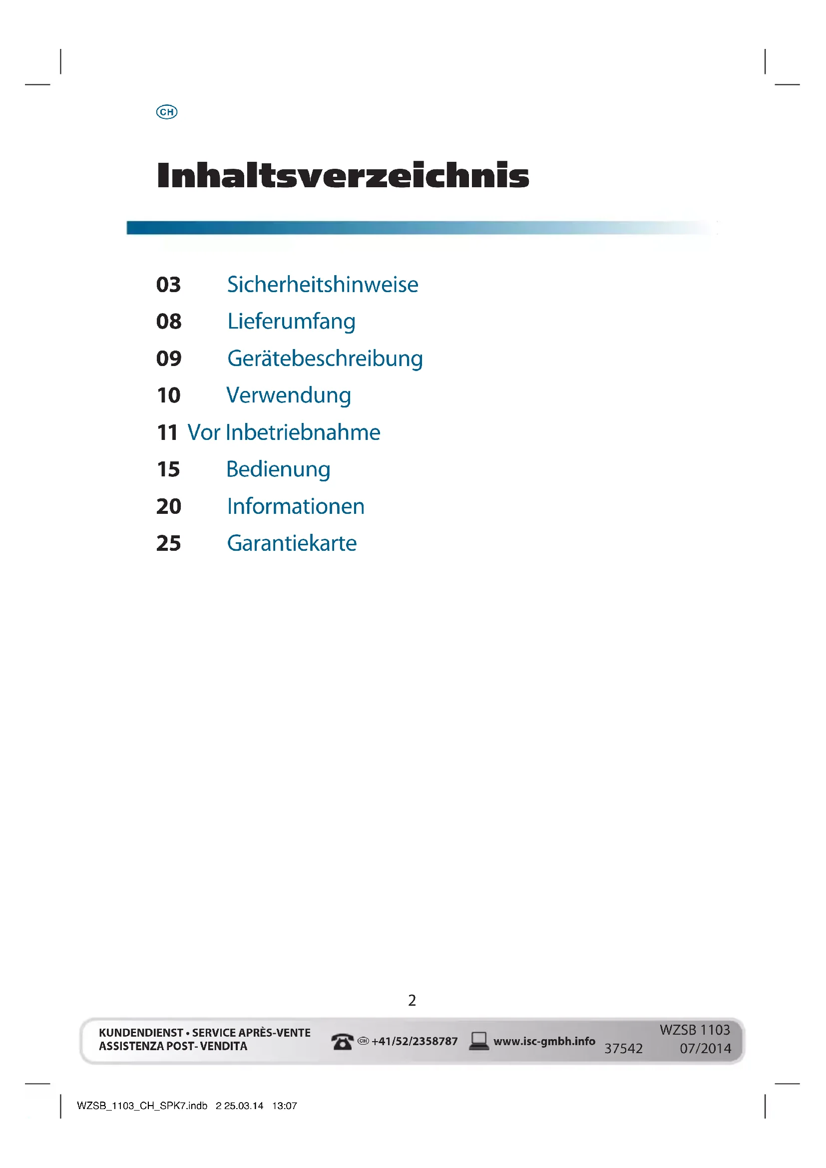 WZSB 1103 07/2014 Inhaltsverzeichnis 03 Sicherheitshinweise 08 Lieferumfang 09 Gerätebeschreibung 10 Verwendung 11 Vor Inbetriebnahme 15 Bedienung 20 Informationen 25 Garantiekarte WZSB_1103_CH_SPK7.indb 2 25.03.14 13:073 KUNDENDIENST • SERVICE APRÈS-VENTE ASSISTENZA POST- VENDITA +41/52/2358787www.isc-gmbh.info 37542WZSB 110307/2014 Allgemeine Sicherheitshinweise für Elektrowerkzeuge m Achtung! Beim Benutzen von Geräten müssen einige Sicherheitsvorkehrungen eingehalten werden, um Verletzungen und Schäden zu verhindern. Lesen Sie diese Bedienungsanleitung / Sicherheitshinweise deshalb sorgfältig durch. Bewahren Sie diese gut auf, damit Ihnen die Informationen jeder- zeit zur Verfügung stehen. Falls Sie das Gerät an andere Personen überge- ben sollten, händigen Sie diese Bedienungsanleitung / Sicherheitshinwei- se bitte mit aus. Wir übernehmen keine Haftung für Unfälle oder Schäden, die durch Nichtbeachten dieser Anleitung und den Sicherheitshinweisen entstehen. m WARNUNG Lesen Sie alle Sicherheitshinweise und Anweisungen. Versäumnis- se bei der Einhaltung der Sicherheitshinweise und Anweisungen können elektrischen Schlag, Brand und/oder schwere Verletzungen verursachen. Bewahren Sie alle Sicherheitshinweise und Anweisungen für die Zukunft auf. Der in den Sicherheitshinweisen verwendete Begriff „Elektrowerkzeug“ bezieht sich auf netzbetriebene Elektrowerkzeuge (mit Netzkabel) und auf akkubetriebene Elektrowerkzeuge (ohne Netzkabel).