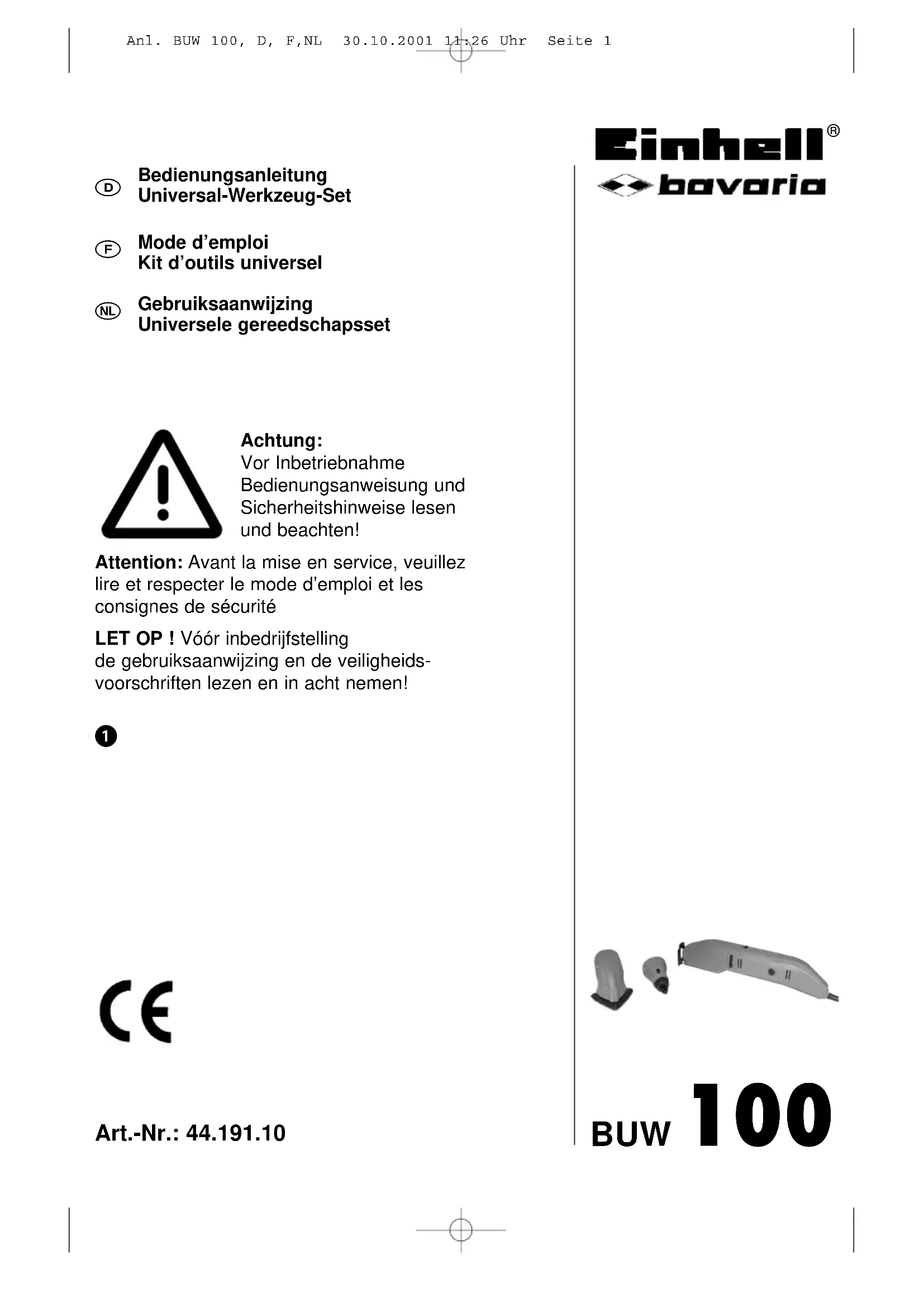 Achtung: Vor Inbetriebnahme Bedienungsanweisung und Sicherheitshinweise lesen und beachten! Attention: Avant la mise en service, veuillez lire et respecter le mode d’emploi et les consignes de sécurité LET OP ! Vóór inbedrijfstelling de gebruiksaanwijzing en de veiligheids- voorschriften lezen en in acht nemen! Anl. BUW 100, D, F,NL 30.10.2001 11:26 Uhr Seite 1SICHERHEITSHINWEISE Achtung! Beim Gebrauch von Elektrowerkzeugen sind zum Schutz gegen elektrischen Schlag, Verlet- zungs- und Brandgefahr folgende grundsätzlichen Sicherheitsmaßnahmen zu beachten. Lesen und beachten Sie diese Hinweise, bevor Sie das Gerät benutzen.