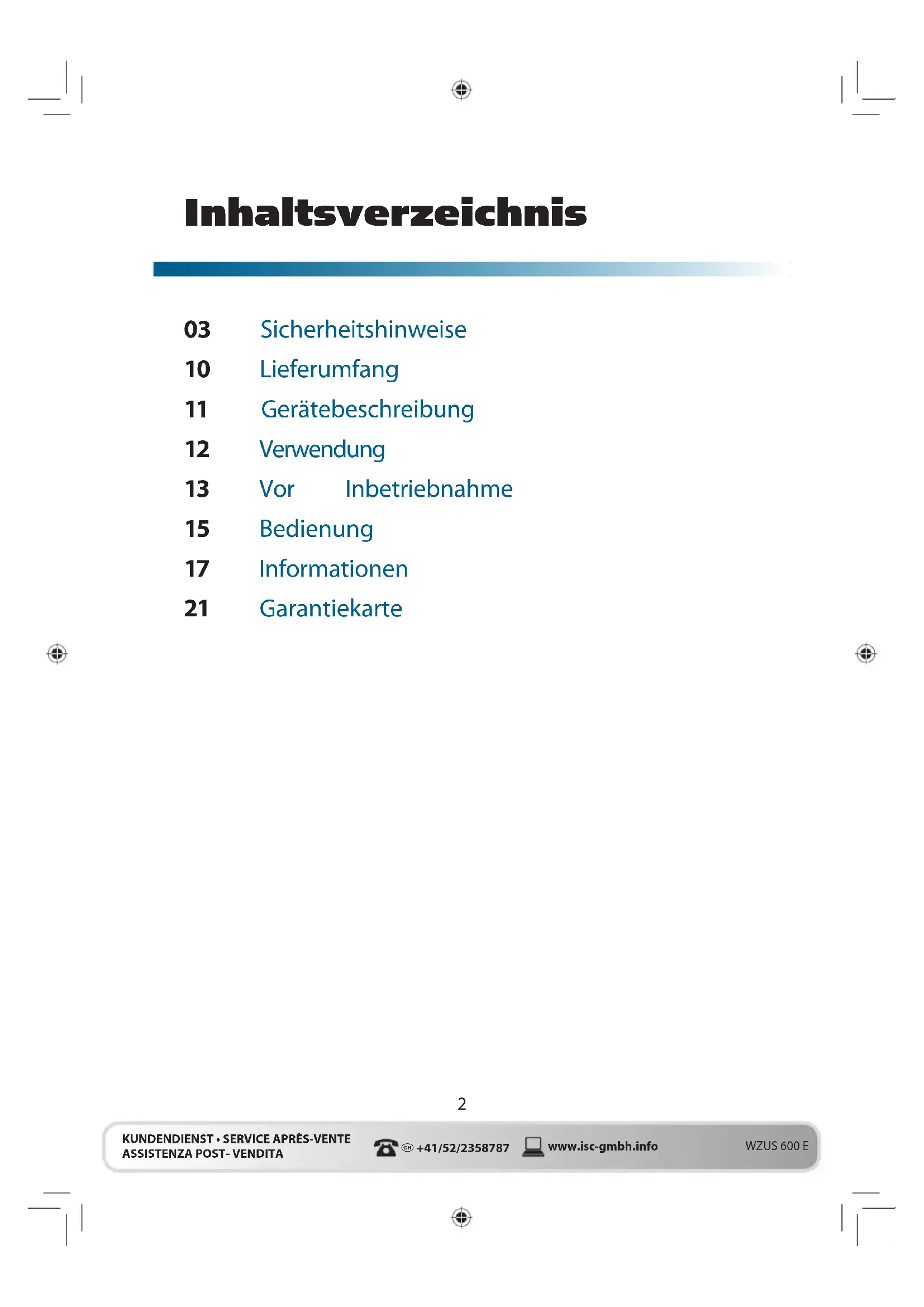 +41/52/2358787 www.isc-gmbh.info WZUS 600 E Inhaltsverzeichnis 03 Sicherheitshinweise 10 Lieferumfang 11 Gerätebeschreibung 12 Verwendung 13 Vor Inbetriebnahme 15 Bedienung 17 Informationen 21 Garantiekarte3