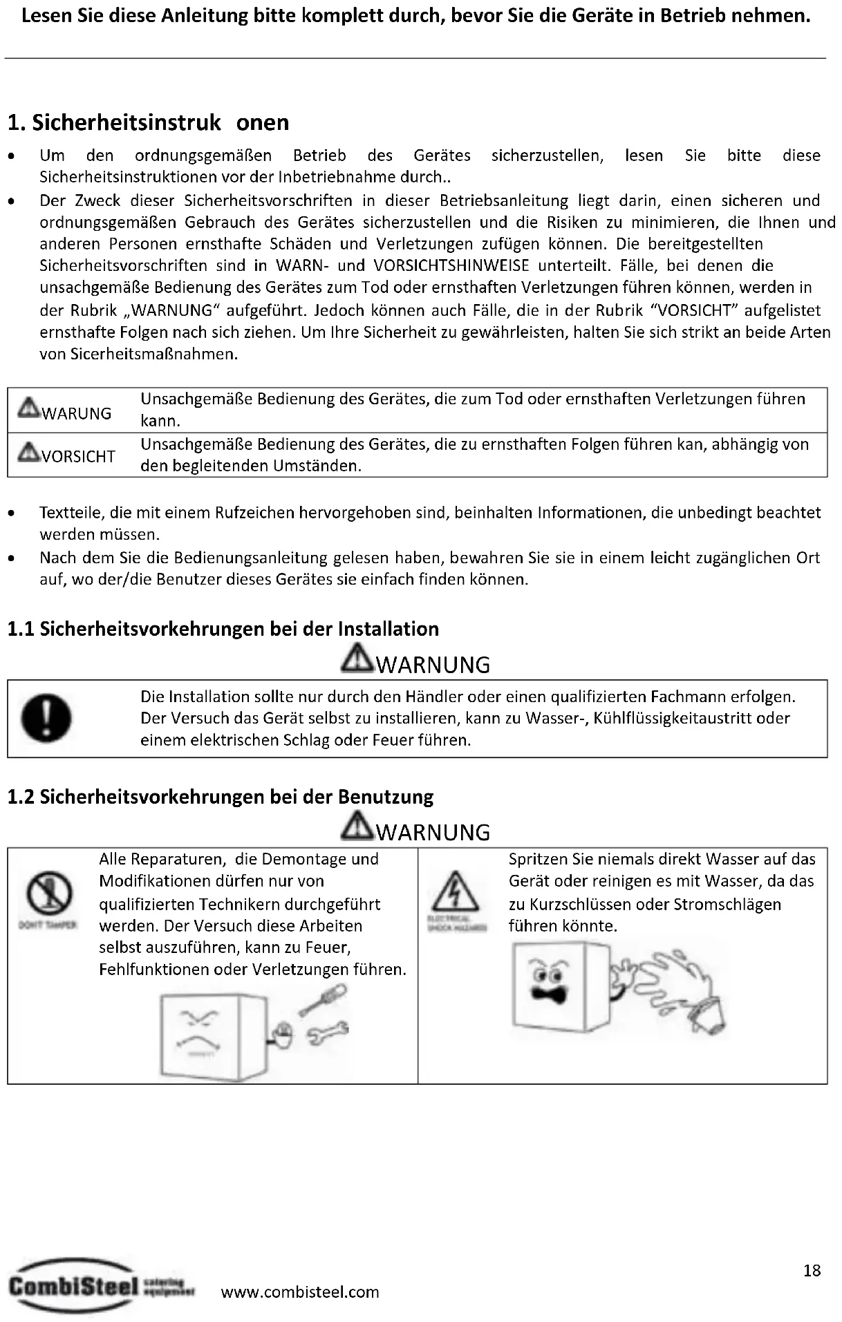 Spritzen Sie niemals direkt Wasser auf das Gerät oder reinigen es mit Wasser, da das zu Kurzschlüssen oder Stromschlägen führen könnte.19 www.combisteel.com