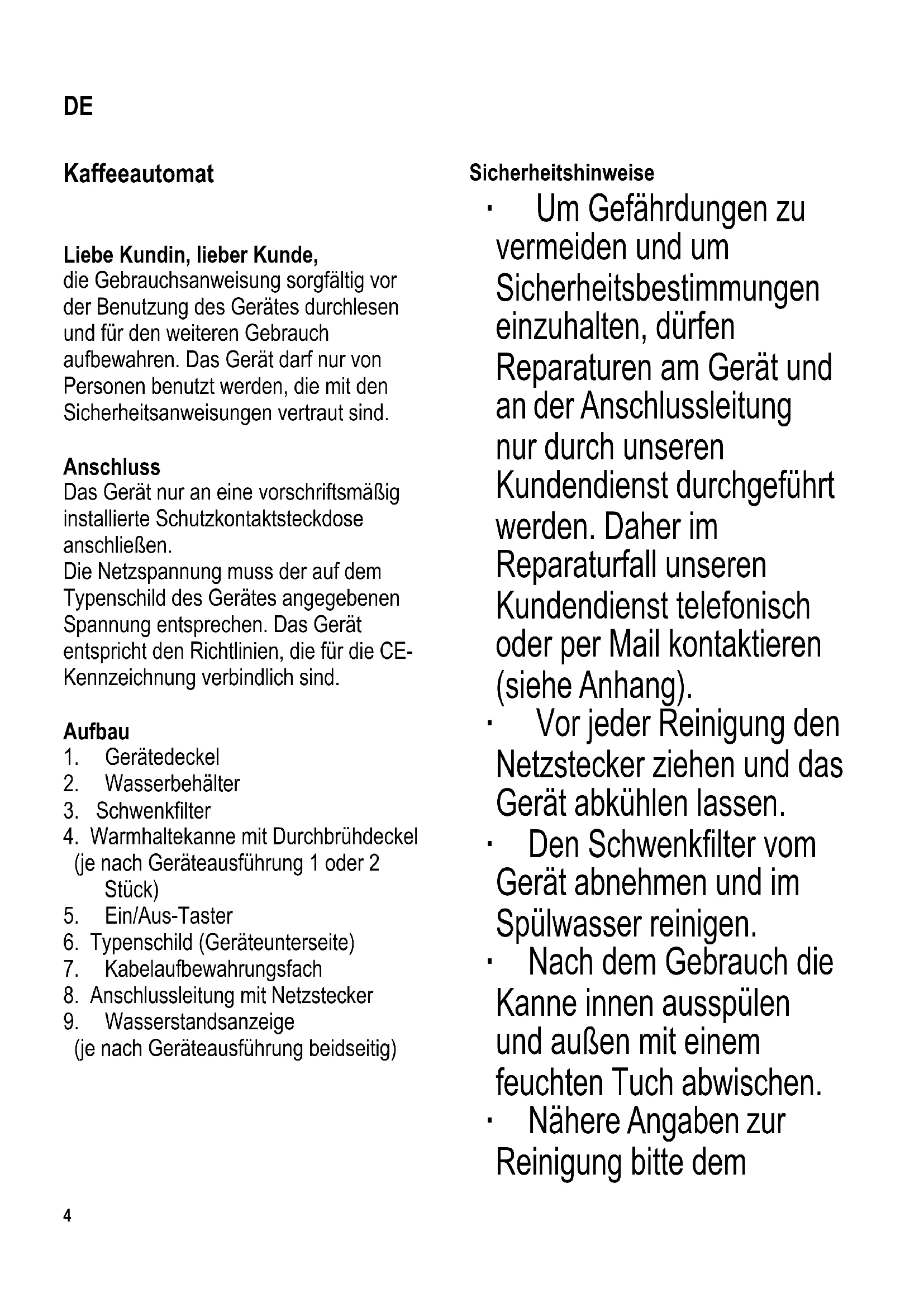 104 x 142 mm Kaffeeautomat Liebe Kundin, lieber Kunde, die Gebrauchsanweisung sorgfältig vor der Benutzung des Gerätes durchlesen und für den weiteren Gebrauch aufbewahren. Das Gerät darf nur von Personen benutzt werden, die mit den Sicherheitsanweisungen vertraut sind. Anschluss Das Gerät nur an eine vorschriftsmäßig installierte Schutzkontaktsteckdose anschließen. Die Netzspannung muss der auf dem Typenschild des Gerätes angegebenen Spannung entsprechen. Das Gerät entspricht den Richtlinien, die für die CE- Kennzeichnung verbindlich sind. Aufbau