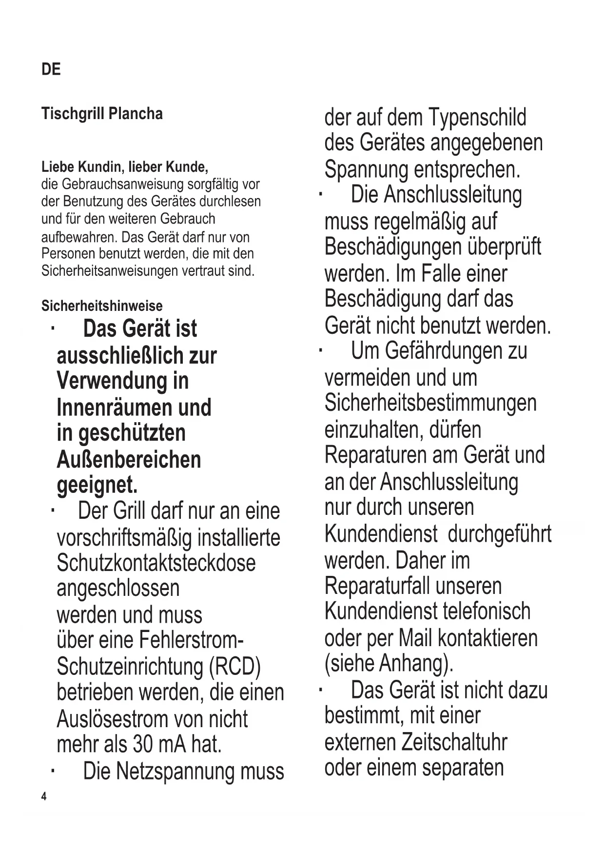 50 x 30 cm Maße Gerät (B X T X H) / Appliance dimensions (W x D x H) / Dimensions de l’appareil (L x P x H) / Afmetingen apparaat (B X D X H) / Dimensiones del aparato (an. x p. x al.) / Dimensioni del dispositivo (L X P X H) / Apparatets mål (B X D X H) / Apparatens mått (B x D x H) / Laitteen mitat (L x S x K) / Dimensões do aparelho (L x P x A) / Wymiary urządzenia (szer. × gł. × wys.) / Διαστάσεις συσκευής (Π X Β X Υ) 61 x 40 x 12,5 cm Stromkabellänge / Power cable length / Longueur du câble d’alimentation / Netsnoerlengte / Longitud del cable de alimentación / Lunghezza cavo di alimentazione / Ledningslængde / Strömkabellängd / Virtajohdon pituus / Comprimento do cabo de alimentação / Długość kabla zasilającego / Μήκος καλωδίου τροφοδοσίας ~ 2,0 m4 104 x 142 mm Tischgrill Plancha Liebe Kundin, lieber Kunde, die Gebrauchsanweisung sorgfältig vor der Benutzung des Gerätes durchlesen und für den weiteren Gebrauch aufbewahren. Das Gerät darf nur von Personen benutzt werden, die mit den Sicherheitsanweisungen vertraut sind. Sicherheitshinweise ∙ Das Gerät ist ausschließlich zur Verwendung in Innenräumen und in geschützten Außenbereichen geeignet. ∙ Der Grill darf nur an eine vorschriftsmäßig installierte Schutzkontaktsteckdose angeschlossen werden und muss über eine Fehlerstrom- Schutzeinrichtung (RCD) betrieben werden, die einen Auslösestrom von nicht mehr als 30 mA hat. ∙ Die Netzspannung muss der auf dem Typenschild des Gerätes angegebenen Spannung entsprechen. ∙ Die Anschlussleitung muss regelmäßig auf Beschädigungen überprüft werden. Im Falle einer Beschädigung darf das Gerät nicht benutzt werden. ∙ Um Gefährdungen zu vermeiden und um Sicherheitsbestimmungen einzuhalten, dürfen Reparaturen am Gerät und an der Anschlussleitung nur durch unseren Kundendienst durchgeführt werden. Daher im Reparaturfall unseren Kundendienst telefonisch oder per Mail kontaktieren (siehe Anhang). ∙ Das Gerät ist nicht dazu bestimmt, mit einer externen Zeitschaltuhr oder einem separaten DE104 x 142 mm