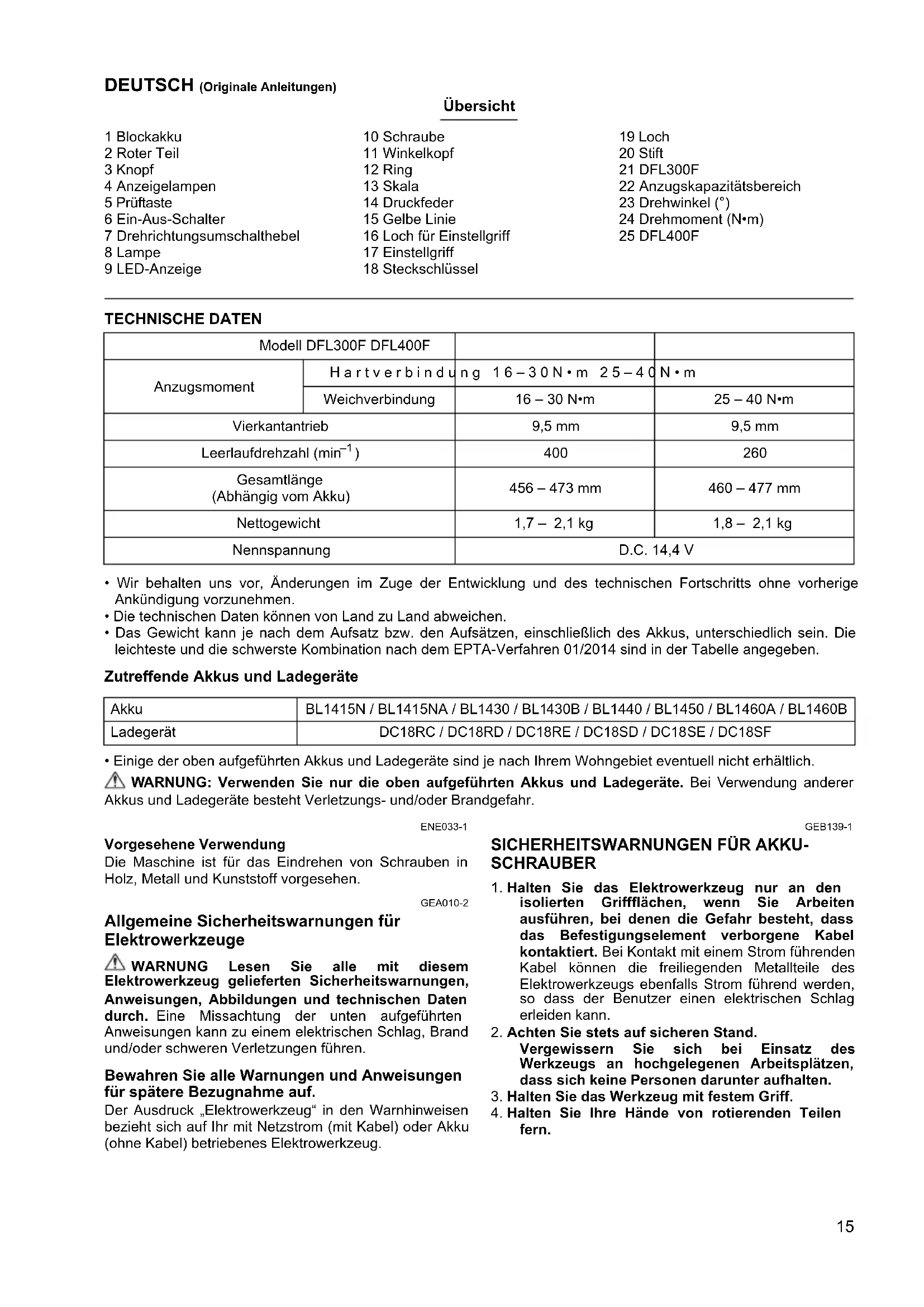 Pour les pays d’Europe uniquement La déclaration de conformité CE est fournie en Annexe A à ce mode d’emploi.15 DEUTSCH (Originale Anleitungen) Übersicht 1 Blockakku 2 Roter Teil 3 Knopf 4 Anzeigelampen 5 Prüftaste 6 Ein-Aus-Schalter 7 Drehrichtungsumschalthebel 8 Lampe 9 LED-Anzeige 10 Schraube 11 Winkelkopf 12 Ring 13 Skala 14 Druckfeder 15 Gelbe Linie 16 Loch für Einstellgriff 17 Einstellgriff 18 Steckschlüssel 19 Loch 20 Stift 21 DFL300F 22 Anzugskapazitätsbereich 23 Drehwinkel (°) 24 Drehmoment (N•m) 25 DFL400F TECHNISCHE DATEN