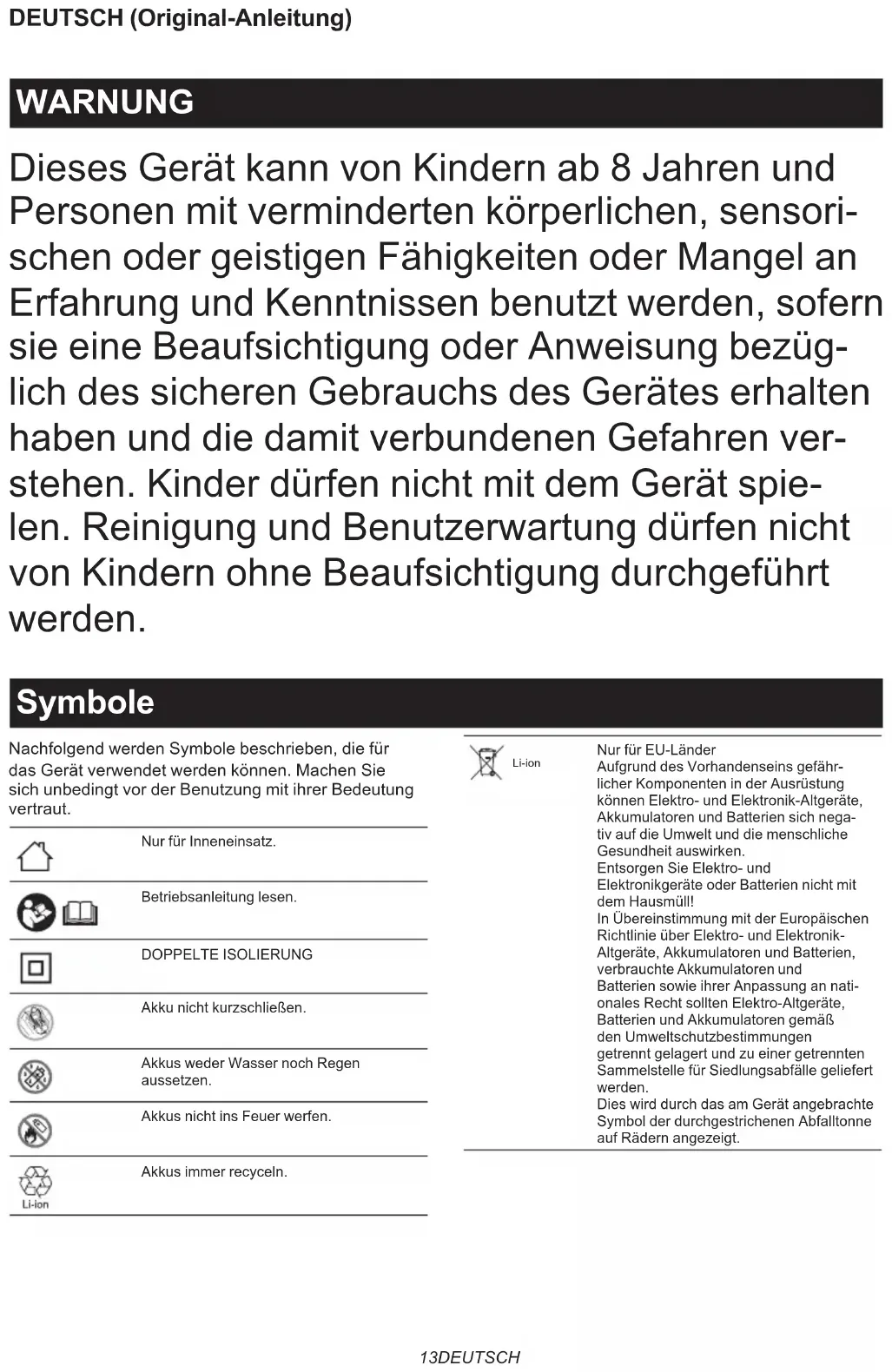 DEUTSCH (Original-Anleitung) WARNUNG Dieses Gerät kann von Kindern ab 8 Jahren und Personen mit verminderten körperlichen, sensori- schen oder geistigen Fähigkeiten oder Mangel an Erfahrung und Kenntnissen benutzt werden, sofern sie eine Beaufsichtigung oder Anweisung bezüg- lich des sicheren Gebrauchs des Gerätes erhalten haben und die damit verbundenen Gefahren ver- stehen. Kinder dürfen nicht mit dem Gerät spie- len. Reinigung und Benutzerwartung dürfen nicht von Kindern ohne Beaufsichtigung durchgeführt werden. Symbole Nachfolgend werden Symbole beschrieben, die für das Gerät verwendet werden können. Machen Sie sich unbedingt vor der Benutzung mit ihrer Bedeutung vertraut. Nur für Inneneinsatz. Betriebsanleitung lesen. DOPPELTE ISOLIERUNG Akku nicht kurzschließen. Akkus weder Wasser noch Regen aussetzen. Akkus nicht ins Feuer werfen. Akkus immer recyceln. Li-ion Nur für EU-Länder Aufgrund des Vorhandenseins gefähr- licher Komponenten in der Ausrüstung können Elektro- und Elektronik-Altgeräte, Akkumulatoren und Batterien sich nega- tiv auf die Umwelt und die menschliche Gesundheit auswirken. Entsorgen Sie Elektro- und Elektronikgeräte oder Batterien nicht mit dem Hausmüll! In Übereinstimmung mit der Europäischen Richtlinie über Elektro- und Elektronik- Altgeräte, Akkumulatoren und Batterien, verbrauchte Akkumulatoren und Batterien sowie ihrer Anpassung an nati- onales Recht sollten Elektro-Altgeräte, Batterien und Akkumulatoren gemäß den Umweltschutzbestimmungen getrennt gelagert und zu einer getrennten Sammelstelle für Siedlungsabfälle geliefert werden. Dies wird durch das am Gerät angebrachte Symbol der durchgestrichenen Abfalltonne auf Rädern angezeigt.14 DEUTSCH Bereit zum Laden. Ladeverzögerung (Akkukühlung, Akku zu kalt, oder Warten auf Laden). Ladevorgang (0 - 80 %). Ladevorgang (80 - 100 %). Ladevorgang abgeschlossen. Ladevorgang (Kühlungsstörung). Defekter Akku. VORSICHT