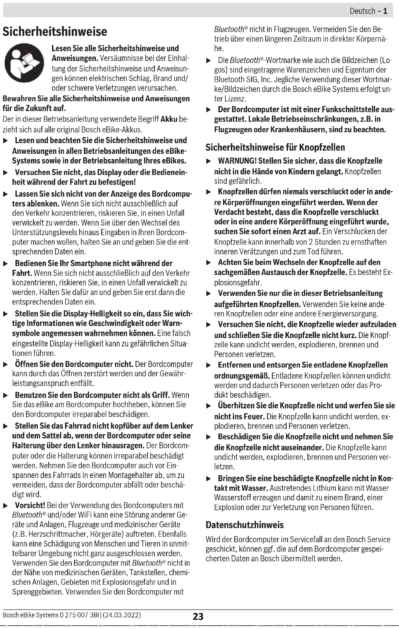 Transport u If you transport your eBike attached to the outside of your car, e.g. on a bike rack, remove the on-board computer and the eBike battery to avoid damaging them. Disposal The drive unit, on-board computer incl. operat- ing unit, battery, speed sensor, accessories and packaging should be disposed of in an en- vironmentally correct manner. Check that your personal data has been deleted from the device. Do not dispose of eBikes and their components with house- hold waste. In accordance with Directive 2012/19/EU and Directive 2006/66/EC respectively, elec- tronic devices that are no longer usable and de- fective/drained batteries must be collected separately and recycled in an environmentally friendly manner. Please return Bosch eBike components that are no longer usable free of charge to an authorised bicycle dealer or to a recycling facility. Subject to change without notice. Bosch eBike Systems 0 275 007 3BI | (24.03.2022) 21English – 6 0 275 007 3BI | (24.03.2022) Bosch eBike Systems 22Deutsch – 1 Sicherheitshinweise Lesen Sie alle Sicherheitshinweise und Anweisungen. Versäumnisse bei der Einhal- tung der Sicherheitshinweise und Anweisun- gen können elektrischen Schlag, Brand und/ oder schwere Verletzungen verursachen. Bewahren Sie alle Sicherheitshinweise und Anweisungen für die Zukunft auf. Der in dieser Betriebsanleitung verwendete Begriff Akku be- zieht sich auf alle original Bosch eBike-Akkus. u Lesen und beachten Sie die Sicherheitshinweise und Anweisungen in allen Betriebsanleitungen des eBike- Systems sowie in der Betriebsanleitung Ihres eBikes. u Versuchen Sie nicht, das Display oder die Bedienein- heit während der Fahrt zu befestigen! u Lassen Sie sich nicht von der Anzeige des Bordcompu- ters ablenken. Wenn Sie sich nicht ausschließlich auf den Verkehr konzentrieren, riskieren Sie, in einen Unfall verwickelt zu werden. Wenn Sie über den Wechsel des Unterstützungslevels hinaus Eingaben in Ihren Bordcom- puter machen wollen, halten Sie an und geben Sie die ent- sprechenden Daten ein. u Bedienen Sie Ihr Smartphone nicht während der Fahrt. Wenn Sie sich nicht ausschließlich auf den Verkehr konzentrieren, riskieren Sie, in einen Unfall verwickelt zu werden. Halten Sie dafür an und geben Sie erst dann die entsprechenden Daten ein. u Stellen Sie die Display-Helligkeit so ein, dass Sie wich- tige Informationen wie Geschwindigkeit oder Warn- symbole angemessen wahrnehmen können. Eine falsch eingestellte Display-Helligkeit kann zu gefährlichen Situa- tionen führen. u Öffnen Sie den Bordcomputer nicht. Der Bordcomputer kann durch das Öffnen zerstört werden und der Gewähr- leistungsanspruch entfällt. u Benutzen Sie den Bordcomputer nicht als Griff. Wenn Sie das eBike am Bordcomputer hochheben, können Sie den Bordcomputer irreparabel beschädigen. u Stellen Sie das Fahrrad nicht kopfüber auf dem Lenker und dem Sattel ab, wenn der Bordcomputer oder seine Halterung über den Lenker hinausragen. Der Bordcom- puter oder die Halterung können irreparabel beschädigt werden. Nehmen Sie den Bordcomputer auch vor Ein- spannen des Fahrrads in einen Montagehalter ab, um zu vermeiden, dass der Bordcomputer abfällt oder beschä- digt wird. u Vorsicht! Bei der Verwendung des Bordcomputers mit Bluetooth® und/oder WiFi kann eine Störung anderer Ge- räte und Anlagen, Flugzeuge und medizinischer Geräte (z.B. Herzschrittmacher, Hörgeräte) auftreten. Ebenfalls kann eine Schädigung von Menschen und Tieren in unmit- telbarer Umgebung nicht ganz ausgeschlossen werden. Verwenden Sie den Bordcomputer mit Bluetooth® nicht in der Nähe von medizinischen Geräten, Tankstellen, chemi- schen Anlagen, Gebieten mit Explosionsgefahr und in Sprenggebieten. Verwenden Sie den Bordcomputer mit Bluetooth® nicht in Flugzeugen. Vermeiden Sie den Be- trieb über einen längeren Zeitraum in direkter Körpernä- he. u Die Bluetooth®-Wortmarke wie auch die Bildzeichen (Lo- gos) sind eingetragene Warenzeichen und Eigentum der Bluetooth SIG, Inc. Jegliche Verwendung dieser Wortmar- ke/Bildzeichen durch die Bosch eBike Systems erfolgt un- ter Lizenz. u Der Bordcomputer ist mit einer Funkschnittstelle aus- gestattet. Lokale Betriebseinschränkungen, z.B. in Flugzeugen oder Krankenhäusern, sind zu beachten. Sicherheitshinweise für Knopfzellen u WARNUNG! Stellen Sie sicher, dass die Knopfzelle nicht in die Hände von Kindern gelangt. Knopfzellen sind gefährlich. u Knopfzellen dürfen niemals verschluckt oder in ande- re Körperöffnungen eingeführt werden. Wenn der Verdacht besteht, dass die Knopfzelle verschluckt oder in eine andere Körperöffnung eingeführt wurde, suchen Sie sofort einen Arzt auf. Ein Verschlucken der Knopfzelle kann innerhalb von 2 Stunden zu ernsthaften inneren Verätzungen und zum Tod führen. u Achten Sie beim Wechseln der Knopfzelle auf den sachgemäßen Austausch der Knopfzelle. Es besteht Ex- plosionsgefahr. u Verwenden Sie nur die in dieser Betriebsanleitung aufgeführten Knopfzellen. Verwenden Sie keine ande- ren Knopfzellen oder eine andere Energieversorgung. u Versuchen Sie nicht, die Knopfzelle wieder aufzuladen und schließen Sie die Knopfzelle nicht kurz. Die Knopf- zelle kann undicht werden, explodieren, brennen und Personen verletzen. u Entfernen und entsorgen Sie entladene Knopfzellen ordnungsgemäß. Entladene Knopfzellen können undicht werden und dadurch Personen verletzen oder das Pro- dukt beschädigen. u Überhitzen Sie die Knopfzelle nicht und werfen Sie sie nicht ins Feuer. Die Knopfzelle kann undicht werden, ex- plodieren, brennen und Personen verletzen. u Beschädigen Sie die Knopfzelle nicht und nehmen Sie die Knopfzelle nicht auseinander. Die Knopfzelle kann undicht werden, explodieren, brennen und Personen ver- letzen. u Bringen Sie eine beschädigte Knopfzelle nicht in Kon- takt mit Wasser. Austretendes Lithium kann mit Wasser Wasserstoff erzeugen und damit zu einem Brand, einer Explosion oder zur Verletzung von Personen führen. Datensc