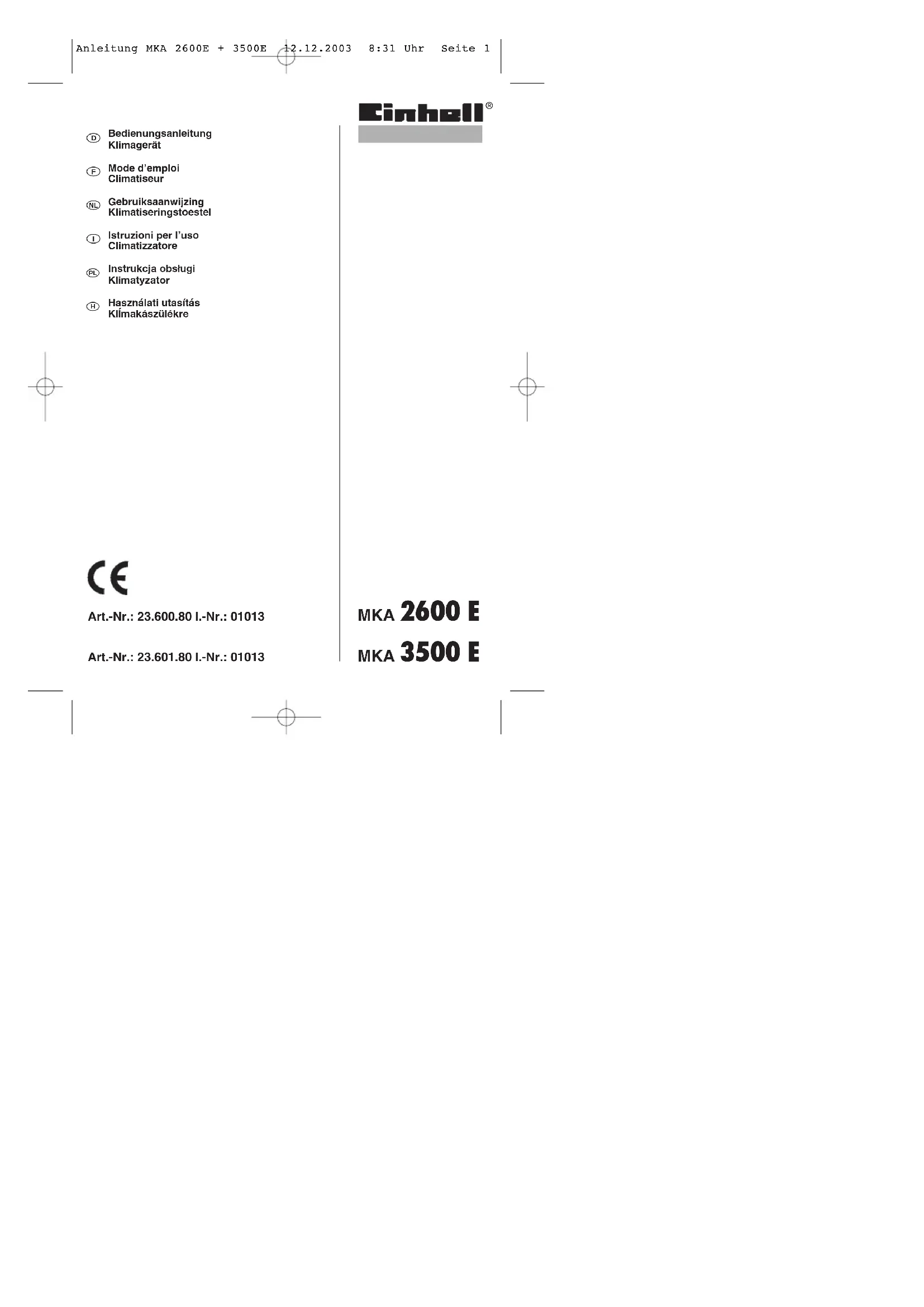 BedienungsanleitungKlimagerät Mode d’emploiClimatiseur GebruiksaanwijzingKlimatiseringstoestel Istruzioni per l’usoClimatizzatore Instrukcja obsługiKlimatyzator Használati utasításKlĺmakászülékre MKA 3500 E MKA 2600 E Anleitung MKA 2600E + 3500E 12.12.2003 8:31 Uhr Seite 1Bitte lesen die Anleitung sorgfältig vor Inbetriebnahme des Geräts und bewahren Sie diese Unterlagen gut auf. Vor dem Gebrauch