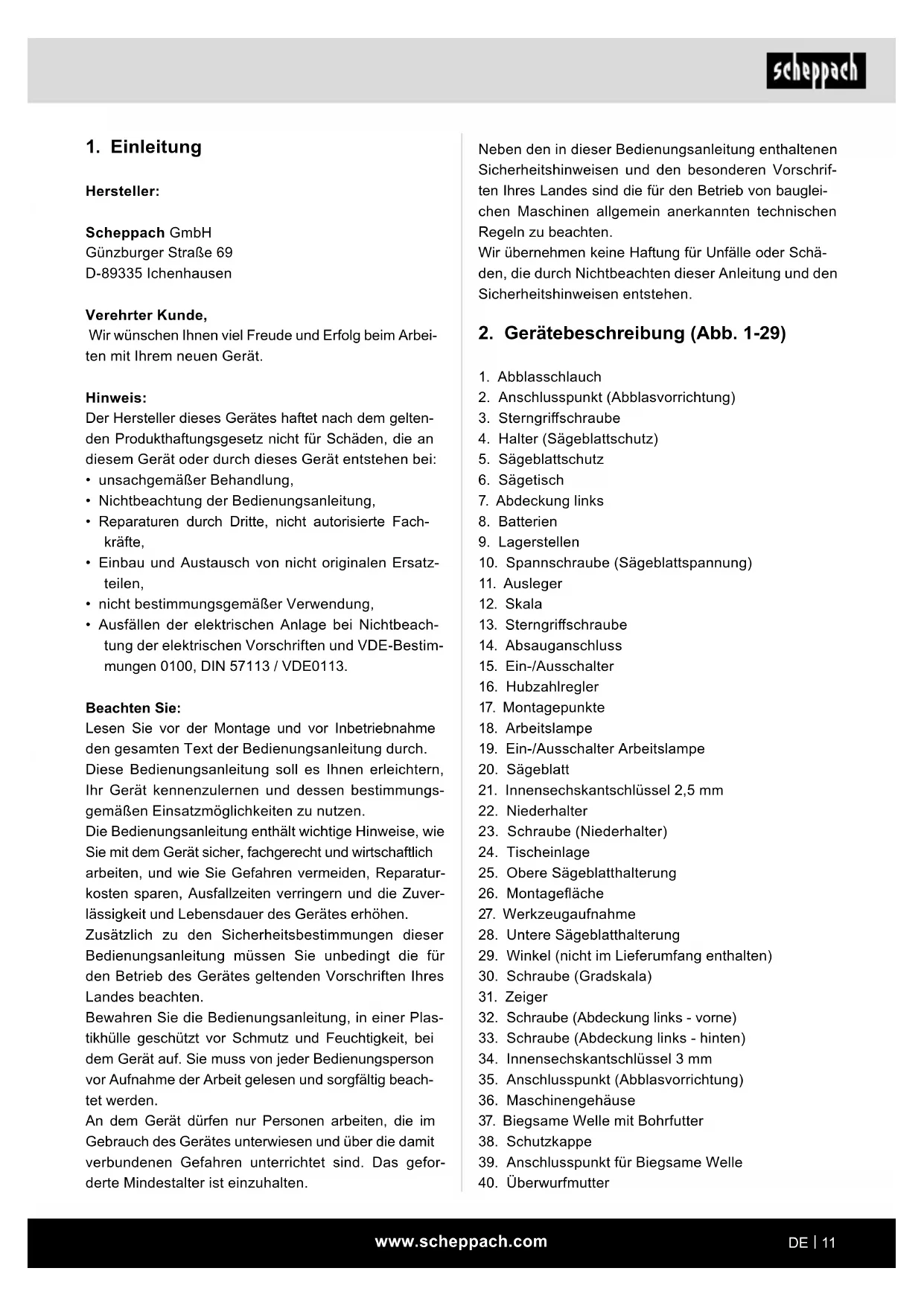 Hersteller: Scheppach GmbH Günzburger Straße 69 D-89335 Ichenhausen Verehrter Kunde, Wir wünschen Ihnen viel Freude und Erfolg beim Arbei- ten mit Ihrem neuen Gerät. Hinweis: Der Hersteller dieses Gerätes haftet nach dem gelten- den Produkthaftungsgesetz nicht für Schäden, die an diesem Gerät oder durch dieses Gerät entstehen bei: