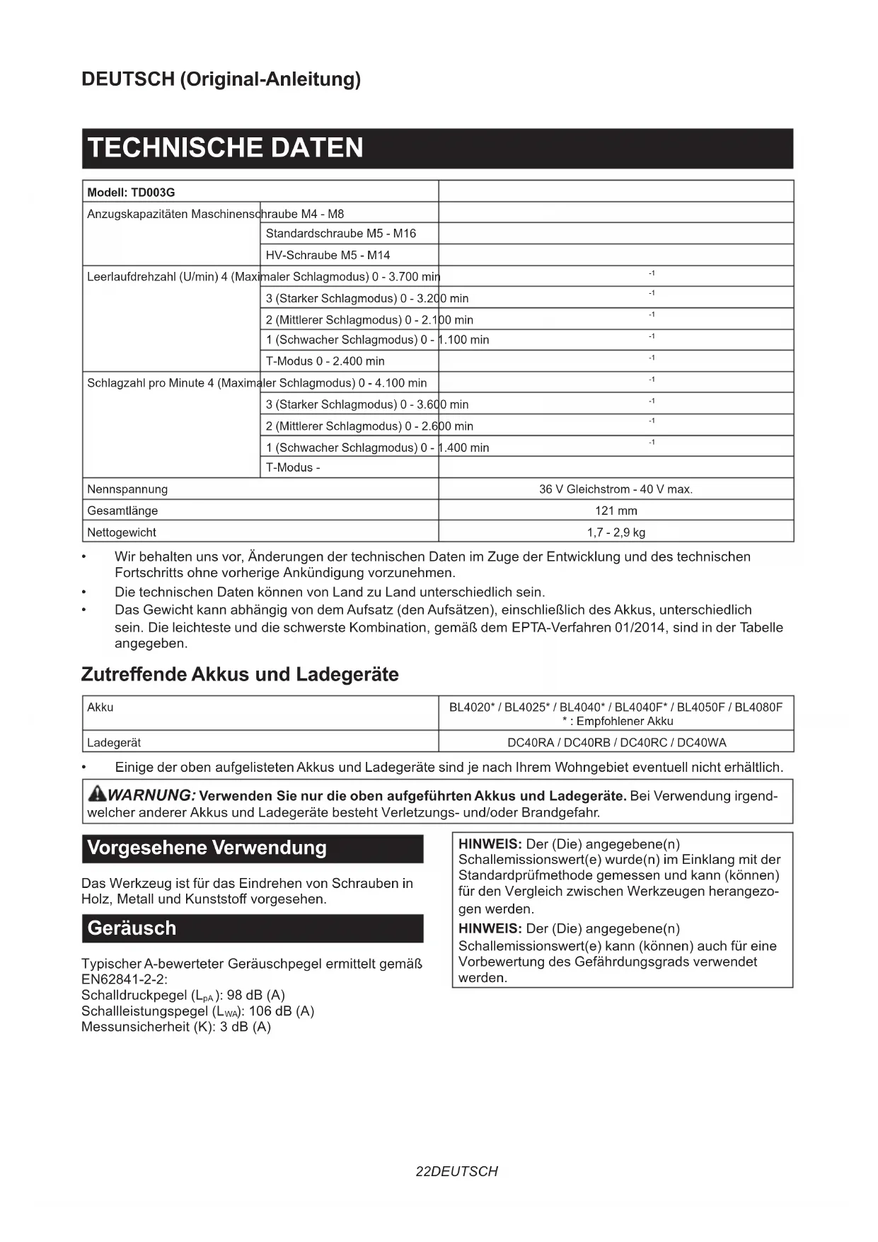 - EinigederobenaufgelistetenAkkusundLadegerätesindjenachIhremWohngebieteventuellnichterhältlich. WARNUNG: Verwenden Sie nur die oben aufgeführten Akkus und Ladegeräte. Bei Verwendung irgend- welcher anderer Akkus und Ladegeräte besteht Verletzungs- und/oder Brandgefahr. Vorgesehene Verwendung Das Werkzeug ist für das Eindrehen von Schrauben in Holz,MetallundKunststovorgesehen. Geräusch TypischerA-bewerteterGeräuschpegelermitteltgemäß EN62841-2-2: Schalldruckpegel (L