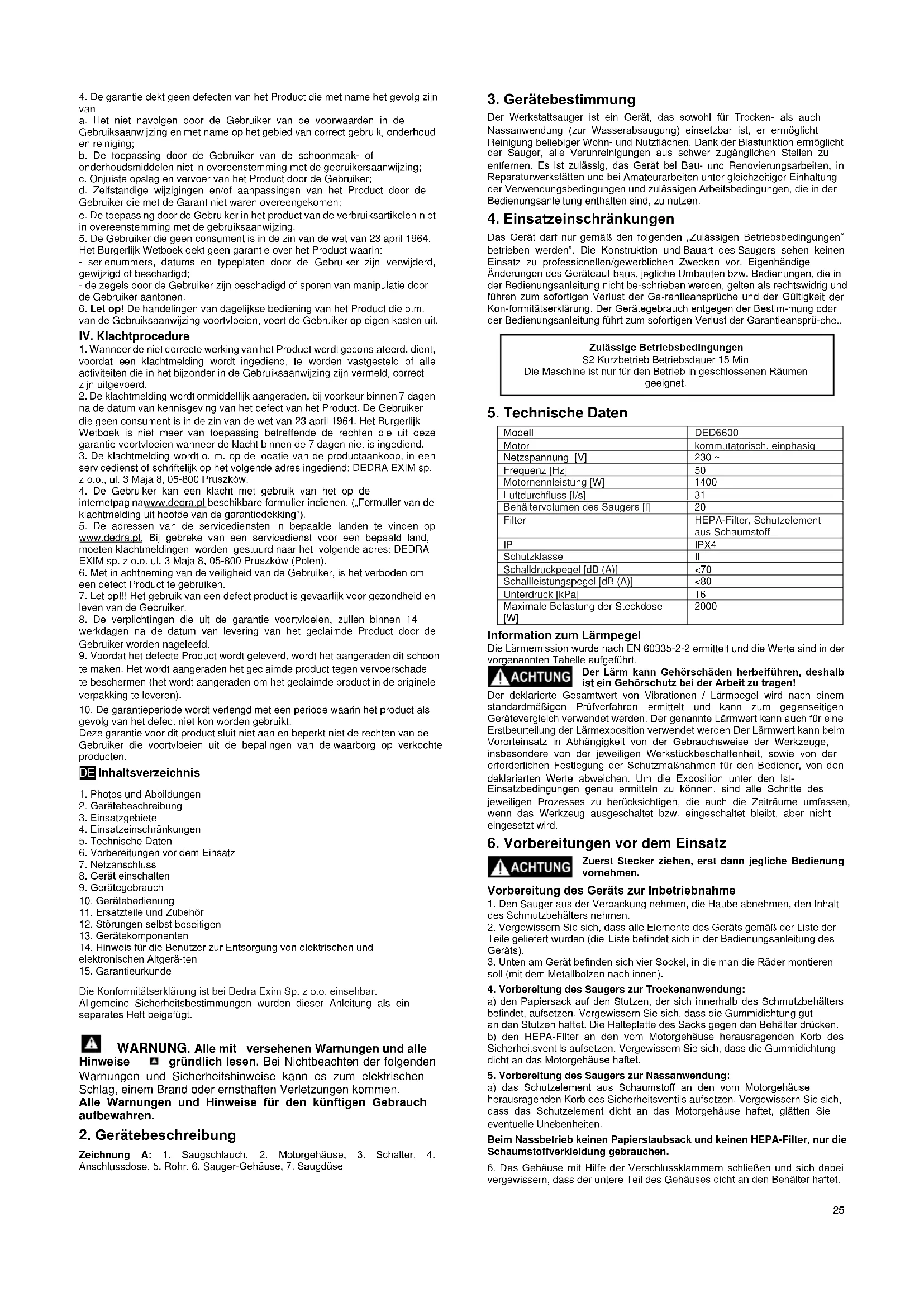 gebrauchten elektro- und elektronik-altgeräten ( betrifft Haushalte) Das hier abgebildete Symbol auf Produkten oder auf der beigefügten Dokumentation informiert, dass man gebrauchte Elektro- und Elektronik-Altgeräte nicht mit dem Haushaltsmüll wegwerfen darf. Das richtige Verhalten im Falle von Beseitigung, erneuter Benutzung oder Recycling von Unterbauelementen besteht in der Übergabe von gebrauchten Elektro- und Elektronik-Altgeräten an Fachabnahmepunkte, wo sie kostenlos abgenommen werden. Informationen über die Fachabnahmepunkte bekommen Sie bei der lokalen Behörde. Die richtige Verwertung der Geräte erlaubt wichtige Rohstoffe zu behalten und die negative Einwirkung auf die Gesundheit und die Umwelt zu vermeiden. Die unsachgemäße Verwertung wird mit Strafen laut den entsprechenden Lokalvorschriften bestraft. Nutzer in den EU-Ländern Wenn Sie die Elektro- und Elektronische Geräte abgeben möchten, melden Sie sich bitte einem nächst gelegenen Verkaufspunkt oder bei dem Lieferanten, der Ihnen weitere Informationen erteilt. Das Entsorgen von Abfällen in Ländern außerhalb der EU Dieses Symbol betrifft nur EU-Länder. Wenn Sie die Elektro- und Elektronische Geräte abgeben möchten, melden Sie sich bitte einem nächst gelegenen Verkaufspunkt oder bei dem Lieferanten, der Ihnen weitere Informationen erteilt. Garantiekarte für Werkstattsauger Katalognummer: DED6600 Lotnummer: .......................... (im Weiteren Produkt genannt) Kaufdatum des Produkts: .............27 Stempel des Verkäufers Datum und Unterschrift des Verkäufers: ................................. Erklärung des Benutzers: Ich bestätige, dass ich über die Bedingungen der Garantie sowie Folgen der Nichtbeachtung von den in der Bedienungsanleitung und Garantiekarte enthaltenen Anweisungen informiert wurde. Die Bedingungen dieser Garantie sind mir bekannt, was ich mit meiner eigenhändigen Unterschrift bestätige: