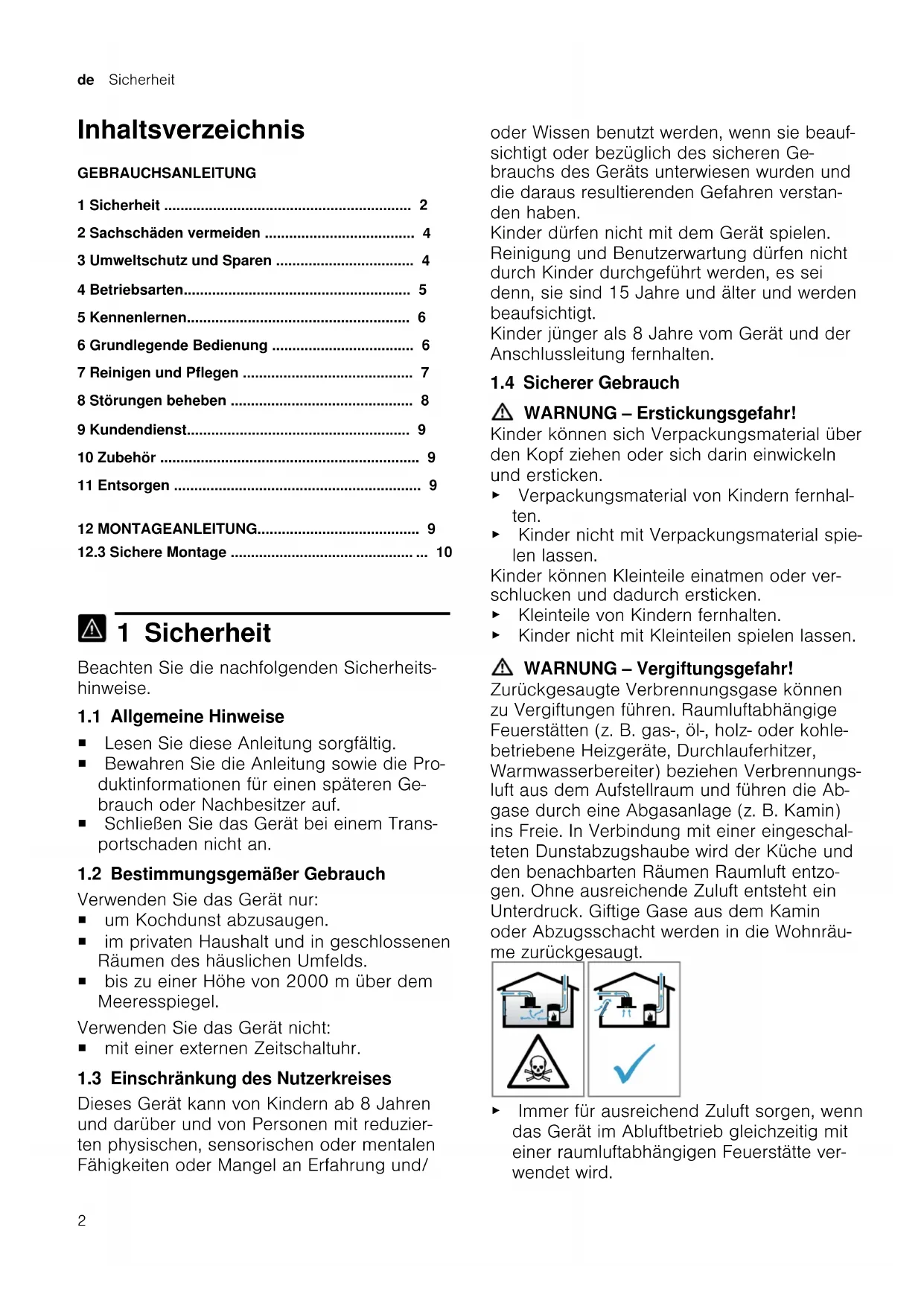 1 Sicherheit Beachten Sie die nachfolgenden Sicherheits- hinweise. 1.1 Allgemeine Hinweise ¡ Lesen Sie diese Anleitung sorgfältig. ¡ Bewahren Sie die Anleitung sowie die Pro- duktinformationen für einen späteren Ge- brauch oder Nachbesitzer auf. ¡ Schließen Sie das Gerät bei einem Trans- portschaden nicht an. 1.2 Bestimmungsgemäßer Gebrauch Verwenden Sie das Gerät nur: ¡ um Kochdunst abzusaugen. ¡ im privaten Haushalt und in geschlossenen Räumen des häuslichen Umfelds. ¡ bis zu einer Höhe von 2000m über dem Meeresspiegel. Verwenden Sie das Gerät nicht: ¡ mit einer externen Zeitschaltuhr. 1.3 Einschränkung des Nutzerkreises Dieses Gerät kann von Kindern ab 8 Jahren und darüber und von Personen mit reduzier- ten physischen, sensorischen oder mentalen Fähigkeiten oder Mangel an Erfahrung und/ oder Wissen benutzt werden, wenn sie beauf- sichtigt oder bezüglich des sicheren Ge- brauchs des Geräts unterwiesen wurden und die daraus resultierenden Gefahren verstan- den haben. Kinder dürfen nicht mit dem Gerät spielen. Reinigung und Benutzerwartung dürfen nicht durch Kinder durchgeführt werden, es sei denn, sie sind 15 Jahre und älter und werden beaufsichtigt. Kinder jünger als 8 Jahre vom Gerät und der Anschlussleitung fernhalten. 1.4 Sicherer Gebrauch WARNUNG‒Erstickungsgefahr! Kinder können sich Verpackungsmaterial über den Kopf ziehen oder sich darin einwickeln und ersticken. ▶ Verpackungsmaterial von Kindern fernhal- ten. ▶ Kinder nicht mit Verpackungsmaterial spie- len lassen. Kinder können Kleinteile einatmen oder ver- schlucken und dadurch ersticken. ▶ Kleinteile von Kindern fernhalten. ▶ Kinder nicht mit Kleinteilen spielen lassen. WARNUNG‒Vergiftungsgefahr! Zurückgesaugte Verbrennungsgase können zu Vergiftungen führen. Raumluftabhängige Feuerstätten (z. B. gas-, öl-, holz- oder kohle- betriebene Heizgeräte, Durchlauferhitzer, Warmwasserbereiter) beziehen Verbrennungs- luft aus dem Aufstellraum und führen die Ab- gase durch eine Abgasanlage (z. B. Kamin) ins Freie. In Verbindung mit einer eingeschal- teten Dunstabzugshaube wird der Küche und den benachbarten Räumen Raumluft entzo- gen. Ohne ausreichende Zuluft entsteht ein Unterdruck. Giftige Gase aus dem Kamin oder Abzugsschacht werden in die Wohnräu- me zurückgesaugt. ▶ Immer für ausreichend Zuluft sorgen, wenn das Gerät im Abluftbetrieb gleichzeitig mit einer raumluftabhängigen Feuerstätte ver- wendet wird.Sicherheit de