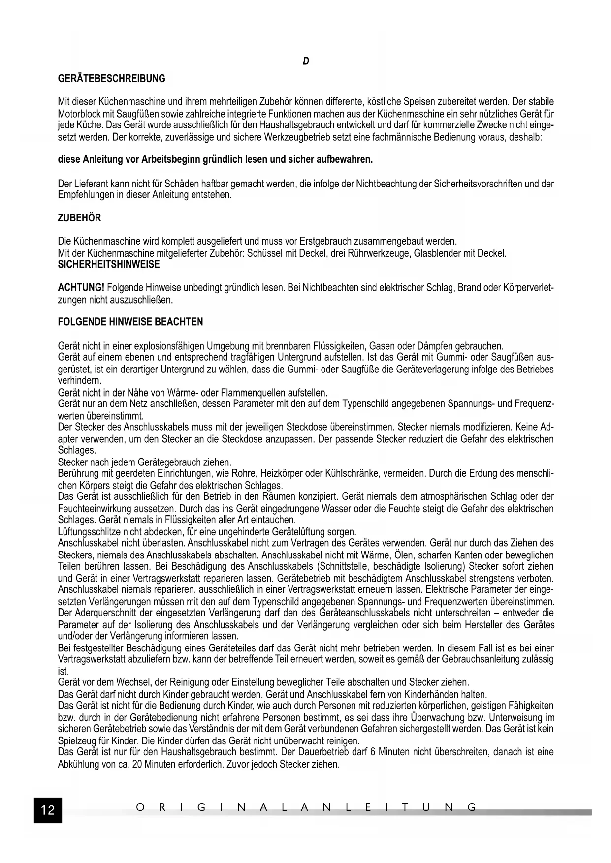 Gerät nicht in einer explosionsfähigen Umgebung mit brennbaren Flüssigkeiten, Gasen oder Dämpfen gebrauchen. Gerät auf einem ebenen und entsprechend tragfähigen Untergrund aufstellen. Ist das Gerät mit Gummi- oder Saugfüßen aus- gerüstet, ist ein derartiger Untergrund zu wählen, dass die Gummi- oder Saugfüße die Geräteverlagerung infolge des Betriebes verhindern. Gerät nicht in der Nähe von Wärme- oder Flammenquellen aufstellen. Gerät nur an dem Netz anschließen, dessen Parameter mit den auf dem Typenschild angegebenen Spannungs- und Frequenz- werten übereinstimmt. Der Stecker des Anschlusskabels muss mit der jeweiligen Steckdose übereinstimmen. Stecker niemals modifizieren. Keine Ad- apter verwenden, um den Stecker an die Steckdose anzupassen. Der passende Stecker reduziert die Gefahr des elektrischen Schlages. Stecker nach jedem Gerätegebrauch ziehen. Berührung mit geerdeten Einrichtungen, wie Rohre, Heizkörper oder Kühlschränke, vermeiden. Durch die Erdung des menschli- chen Körpers steigt die Gefahr des elektrischen Schlages. Das Gerät ist ausschließlich für den Betrieb in den Räumen konzipiert. Gerät niemals dem atmosphärischen Schlag oder der Feuchteeinwirkung aussetzen. Durch das ins Gerät eingedrungene Wasser oder die Feuchte steigt die Gefahr des elektrischen Schlages. Gerät niemals in Flüssigkeiten aller Art eintauchen. Lüftungsschlitze nicht abdecken, für eine ungehinderte Gerätelüftung sorgen. Anschlusskabel nicht überlasten. Anschlusskabel nicht zum Vertragen des Gerätes verwenden. Gerät nur durch das Ziehen des Steckers, niemals des Anschlusskabels abschalten. Anschlusskabel nicht mit Wärme, Ölen, scharfen Kanten oder beweglichen Teilen berühren lassen. Bei Beschädigung des Anschlusskabels (Schnittstelle, beschädigte Isolierung) Stecker sofort ziehen und Gerät in einer Vertragswerkstatt reparieren lassen. Gerätebetrieb mit beschädigtem Anschlusskabel strengstens verboten. Anschlusskabel niemals reparieren, ausschließlich in einer Vertragswerkstatt erneuern lassen. Elektrische Parameter der einge- setzten Verlängerungen müssen mit den auf dem Typenschild angegebenen Spannungs- und Frequenzwerten übereinstimmen. Der Aderquerschnitt der eingesetzten Verlängerung darf den des Geräteanschlusskabels nicht unterschreiten – entweder die Parameter auf der Isolierung des Anschlusskabels und der Verlängerung vergleichen oder sich beim Hersteller des Gerätes und/oder der Verlängerung informieren lassen. Bei festgestellter Beschädigung eines Geräteteiles darf das Gerät nicht mehr betrieben werden. In diesem Fall ist es bei einer Vertragswerkstatt abzuliefern bzw. kann der betreffende Teil erneuert werden, soweit es gemäß der Gebrauchsanleitung zulässig ist. Gerät vor dem Wechsel, der Reinigung oder Einstellung beweglicher Teile abschalten und Stecker ziehen. Das Gerät darf nicht durch Kinder gebraucht werden. Gerät und Anschlusskabel fern von Kinderhänden halten. Das Gerät ist nicht für die Bedienung durch Kinder, wie auch durch Personen mit reduzierten körperlichen, geistigen Fähigkeiten bzw. durch in der Gerätebedienung nicht erfahrene Personen bestimmt, es sei dass ihre Überwachung bzw. Unterweisung im sicheren Gerätebetrieb sowie das Verständnis der mit dem Gerät verbundenen Gefahren sichergestellt werden. Das Gerät ist kein Spielzeug für Kinder. Die Kinder dürfen das Gerät nicht unüberwacht reinigen. Das Gerät ist nur für den Haushaltsgebrauch bestimmt. Der Dauerbetrieb darf 6 Minuten nicht überschreiten, danach ist eine Abkühlung von ca. 20 Minuten erforderlich. Zuvor jedoch Stecker ziehen.13 ORIGINALANLEITUNG