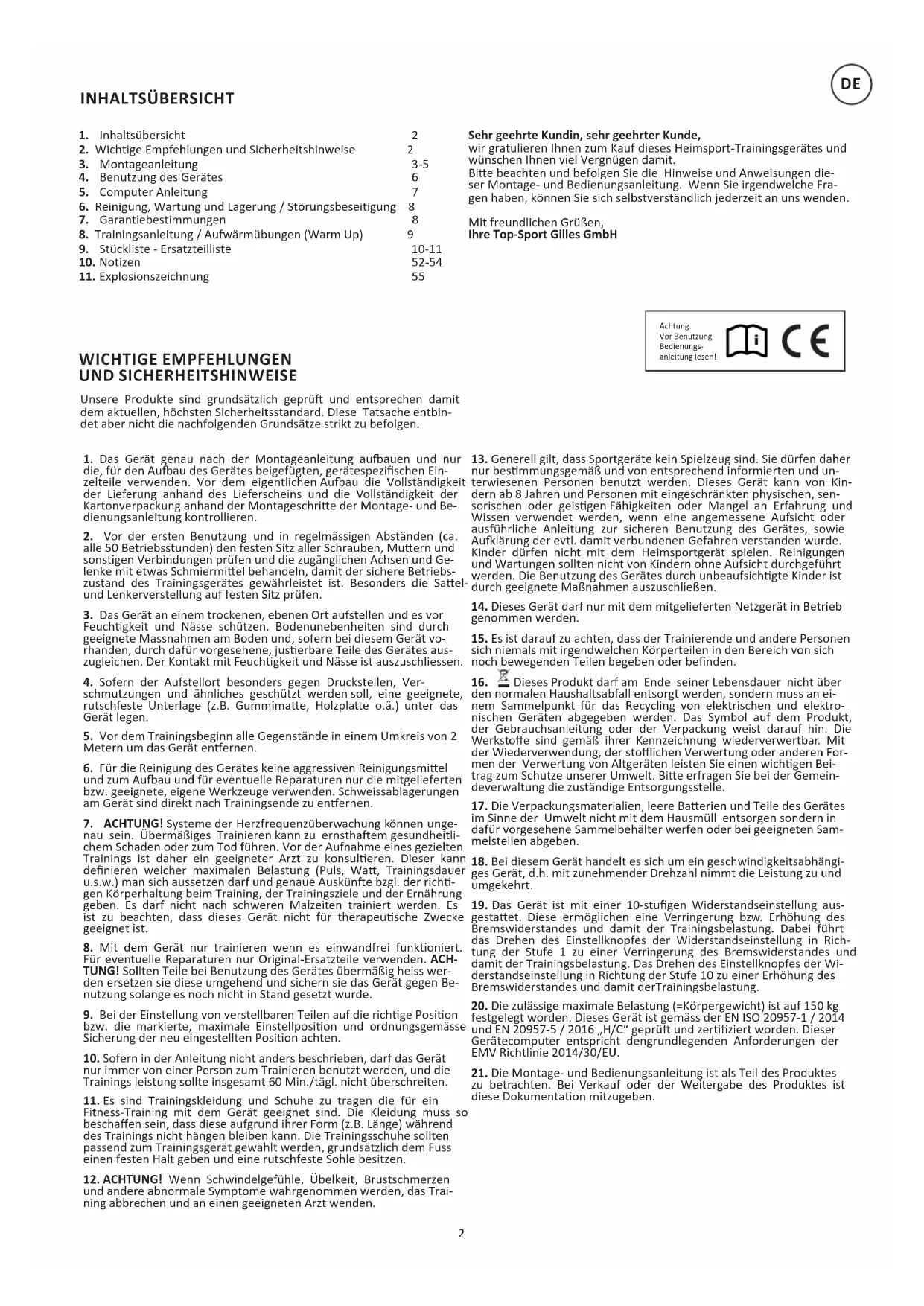 INHALTSÜBERSICHT WICHTIGE EMPFEHLUNGEN UND SICHERHEITSHINWEISE Sehr geehrte Kundin, sehr geehrter Kunde, wir gratulieren Ihnen zum Kauf dieses Heimsport-Trainingsgerätes und wünschen Ihnen viel Vergnügen damit. Bie beachten und befolgen Sie die Hinweise und Anweisungen die- ser Montage- und Bedienungsanleitung. Wenn Sie irgendwelche Fra- gen haben, können Sie sich selbstverständlich jederzeit an uns wenden. Mit freundlichen Grüßen, Ihre Top-Sport Gilles GmbH Unsere Produkte sind grundsätzlich geprü und entsprechen damit dem aktuellen, höchsten Sicherheitsstandard. Diese Tatsache entbin- det aber nicht die nachfolgenden Grundsätze strikt zu befolgen.
