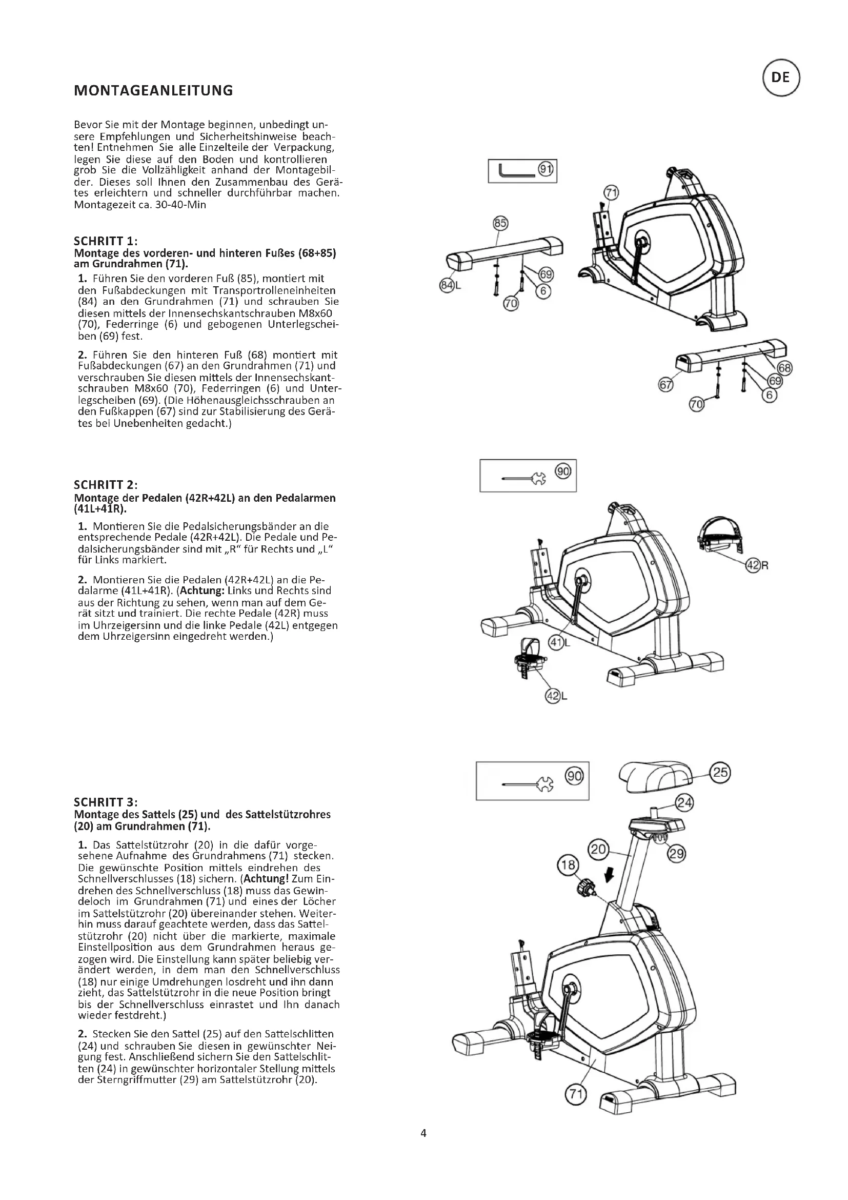 (24) und schrauben Sie diesen in gewünschter Nei- gung fest. Anschließend sichern Sie den Saelschlit- ten (24) in gewünschter horizontaler Stellung miels der Sterngrimuer (29) am Saelstützrohr (20). Montage des vorderen- und hinteren Fußes (68+85) am Grundrahmen (71). Montage der Pedalen (42R+42L) an den Pedalarmen (41L+41R). Montage des Saels (25) und des Saelstützrohres (20) am Grundrahmen (71). SCHRITT 1: SCHRITT 2: SCHRITT 3:5
