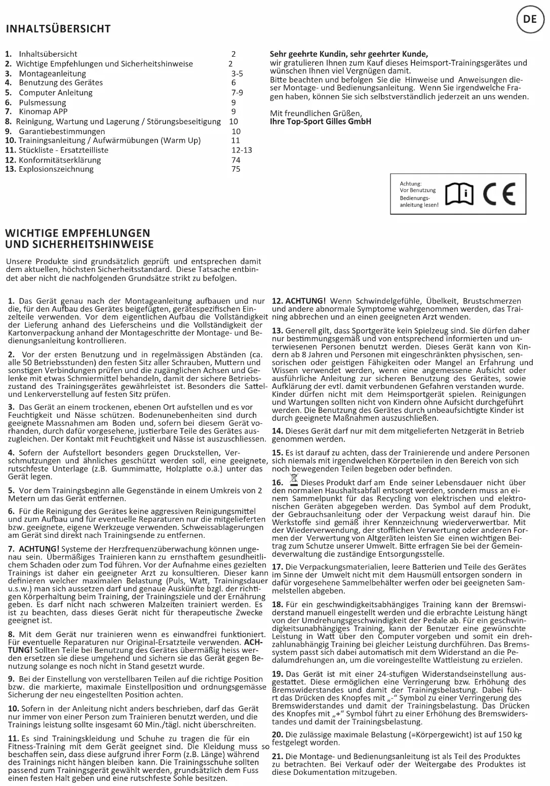 INHALTSÜBERSICHT WICHTIGE EMPFEHLUNGEN UND SICHERHEITSHINWEISE Sehr geehrte Kundin, sehr geehrter Kunde, wir gratulieren Ihnen zum Kauf dieses Heimsport-Trainingsgerätes und wünschen Ihnen viel Vergnügen damit. Bie beachten und befolgen Sie die Hinweise und Anweisungen die- ser Montage- und Bedienungsanleitung. Wenn Sie irgendwelche Fra- gen haben, können Sie sich selbstverständlich jederzeit an uns wenden. Mit freundlichen Grüßen, Ihre Top-Sport Gilles GmbH Unsere Produkte sind grundsätzlich geprü und entsprechen damit dem aktuellen, höchsten Sicherheitsstandard. Diese Tatsache entbin- det aber nicht die nachfolgenden Grundsätze strikt zu befolgen.