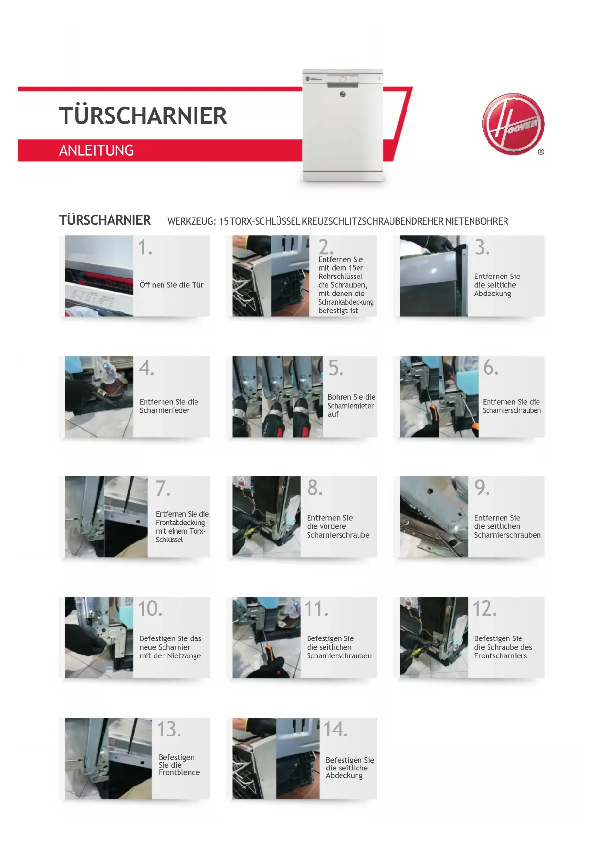 Befestigen Sie die seitlichen Scharnierschrauben Befestigen Sie die Schraube des Frontscharniers Befestigen Sie die Frontblende Befestigen Sie die seitliche Abdeckung TÜRSCHARNIER WERKZEUG: 15 TORX-SCHLÜSSEL KREUZSCHLITZSCHRAUBENDREHER NIETENBOHRER TÜRSCHARNIERANLEITUNG Öff nen Sie die Tür