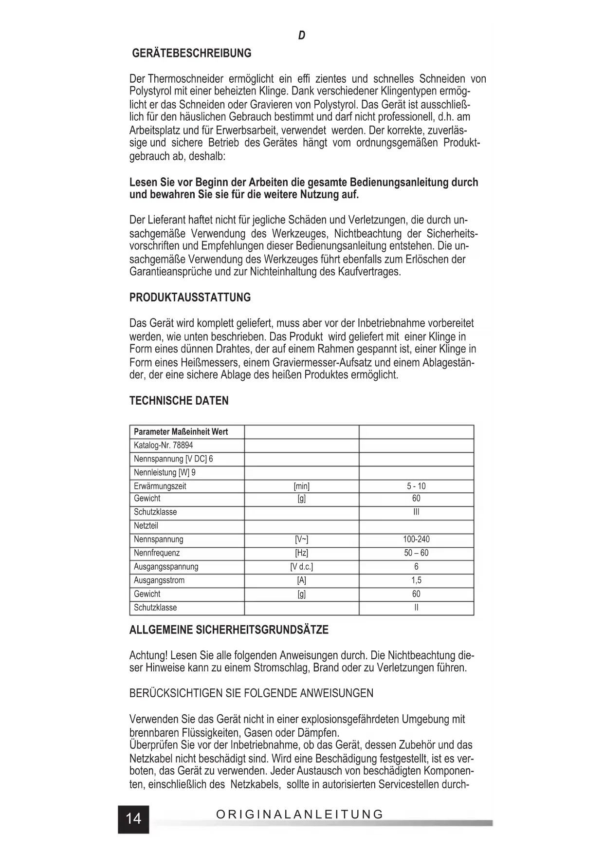 GERÄTEBESCHREIBUNG Der Thermoschneider ermöglicht ein effi zientes und schnelles Schneiden von Polystyrol mit einer beheizten Klinge. Dank verschiedener Klingentypen ermög- licht er das Schneiden oder Gravieren von Polystyrol. Das Gerät ist ausschließ- lich für den häuslichen Gebrauch bestimmt und darf nicht professionell, d.h. am Arbeitsplatz und für Erwerbsarbeit, verwendet werden. Der korrekte, zuverläs- sige und sichere Betrieb des Gerätes hängt vom ordnungsgemäßen Produkt- gebrauch ab, deshalb: Lesen Sie vor Beginn der Arbeiten die gesamte Bedienungsanleitung durch und bewahren Sie sie für die weitere Nutzung auf. Der Lieferant haftet nicht für jegliche Schäden und Verletzungen, die durch un- sachgemäße Verwendung des Werkzeuges, Nichtbeachtung der Sicherheits- vorschriften und Empfehlungen dieser Bedienungsanleitung entstehen. Die un- sachgemäße Verwendung des Werkzeuges führt ebenfalls zum Erlöschen der Garantieansprüche und zur Nichteinhaltung des Kaufvertrages. PRODUKTAUSSTATTUNG Das Gerät wird komplett geliefert, muss aber vor der Inbetriebnahme vorbereitet werden, wie unten beschrieben. Das Produkt wird geliefert mit einer Klinge in Form eines dünnen Drahtes, der auf einem Rahmen gespannt ist, einer Klinge in Form eines Heißmessers, einem Graviermesser-Aufsatz und einem Ablagestän- der, der eine sichere Ablage des heißen Produktes ermöglicht. TECHNISCHE DATEN Parameter Maßeinheit Wert Katalog-Nr. 78894 Nennspannung [V DC] 6 Nennleistung [W] 9 Erwärmungszeit [min] 5 - 10 Gewicht [g] 60 Schutzklasse III Netzteil Nennspannung [V~] 100-240 Nennfrequenz [Hz] 50 – 60 Ausgangsspannung [V d.c.] 6 Ausgangsstrom [A] 1,5 Gewicht [g] 60 Schutzklasse II