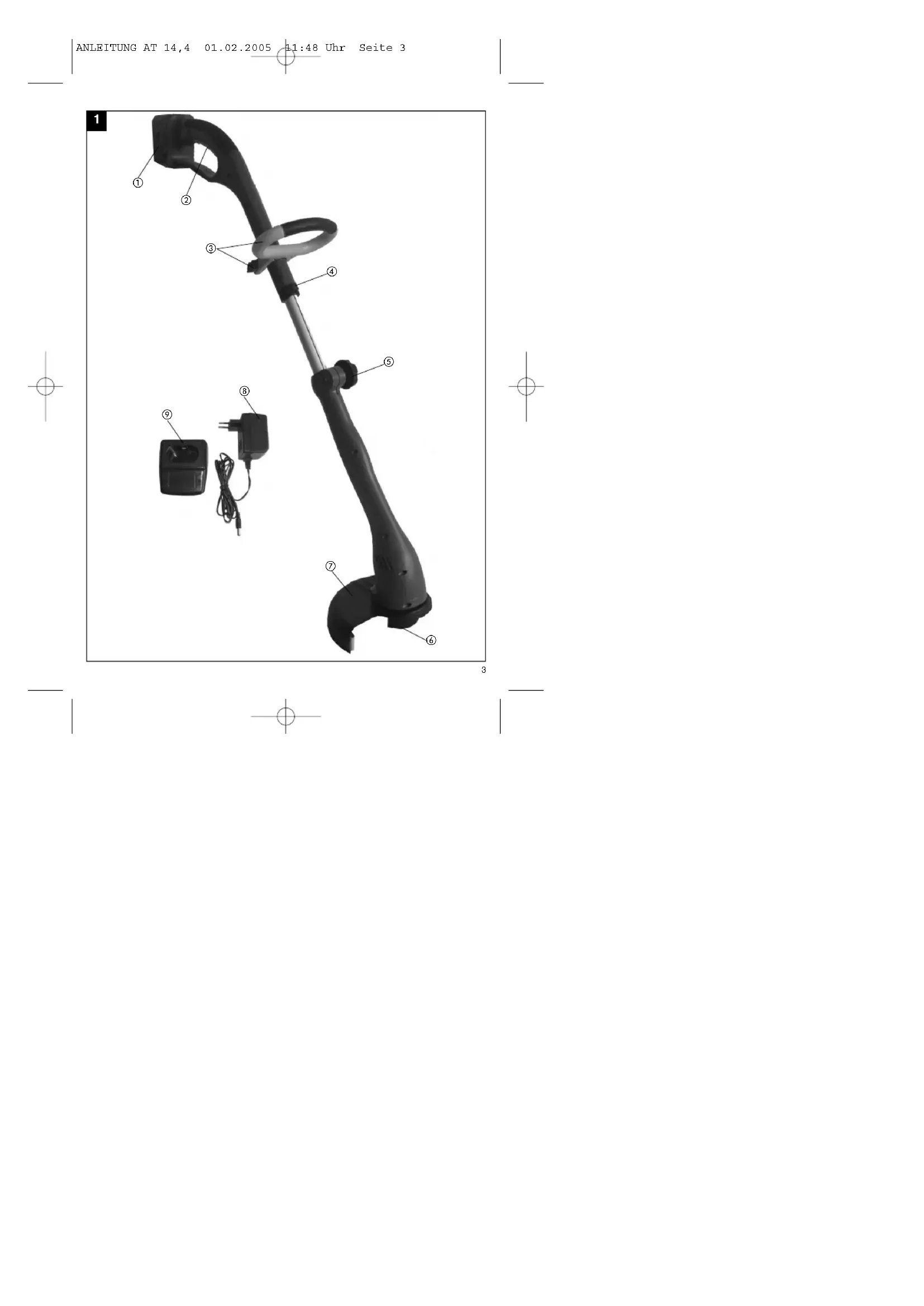 230 V ~ 50 Hz ANLEITUNG AT 14,4 01.02.2005 11:48 Uhr Seite 61. Gerätebeschreibung (Abb. 1) 1. Akku 14,4V2. Ein- Ausschalter 3. Zusatzhandgriff mit Schraube4. Stellknopf zum Zerlegen des Gerätes5. Drehknopf für Höhenverstellung6. Fadenspule7. Schutzabdeckung8. Netzgerät9. Ladeadapter