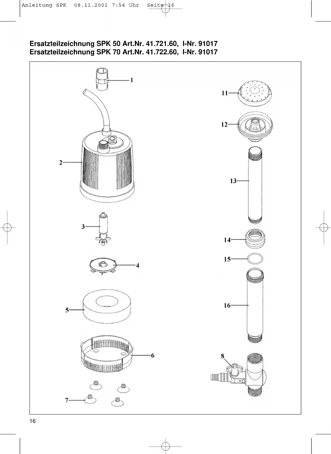 Anleitung SPK 08.11.2001 7:54 Uhr Seite 1516 Ersatzteilzeichnung SPK 50 Art.Nr. 41.721.60, I-Nr. 91017 Ersatzteilzeichnung SPK 70 Art.Nr. 41.722.60, I-Nr. 91017 Anleitung SPK 08.11.2001 7:54 Uhr Seite 1617 Ersatzteilliste SPK 50 Art.Nr. 41.721.60, I-Nr. 91017 Ersatzteilliste SPK 70 Art.Nr. 41.722.60, I-Nr. 91017 Pos. Bezeichnung Ersatzteil-Nr. 01 Fontänenadapter 41.721.60.01 02 Pumpenkörper komplett SPK 50 41.721.60.02 02 Pumpenkörper komplett SPK 70 41.722.60.02 03 Rotor komplett SPK 50 41.721.70.04 03 Rotor komplett SPK 70 41.722.00.04 04 Rotordeckel 41.721.70.03 05 Ansaugfilter 41.721.70.05 06 Ansaugdeckel 41.721.70.02 07 Saugnapf 41.723.60.08 08 Speierhahn 41.723.60.09 11 Fontänendeckel 41.725.55.01 12 Fontänenaufsatz 41.725.55.02 13 Fontänenrohr ø 20 mm 41.725.40.06 14 Arretiermutter 41.725.55.03 15 O-Ring 41.725.55.04 16 Fontänenrohr ø 23,5 mm 41.725.55.05 Anleitung SPK 08.11.2001 7:54 Uhr Seite 1718 Ersatzteilzeichnung SPK 100, Art.Nr. 41.723.60, I-Nr. 91017 Anleitung SPK 08.11.2001 7:54 Uhr Seite 1819 Ersatzteilliste SPK 100, Art.Nr. 41.723.60, I-Nr. 91017 Pos. Bezeichnung Ersatzteil-Nr. 01 Fontänenadapter 41.721.60.01 02 Pumpenkörper komplett 41.723.60.01 03 Keramikscheibe 41.723.60.02 04 Rotor komplett 41.723.60.03 05 Inoxscheibe 41.723.60.04 06 Dichtung 41.723.60.05 07 Gummilager 41.723.60.06 08 Rotordeckel 41.723.60.07 09 Ansaugfilter 41.721.70.05 10 Ansaugdeckel 41.721.70.02 11 Saugnapf 41.723.60.08 12 Speierhahn 41.723.60.09 21 Fontänendeckel 41.725.55.01 22 Fontänenaufsatz 41.725.55.02 23 Fontänenrohr ø 20 mm 41.725.40.06 24 Arretiermutter 41.725.55.03 25 O-Ring 41.725.55.04 26 Fontänenrohr ø 23,5 mm 41.725.55.05 Anleitung SPK 08.11.2001 7:54 Uhr Seite 1920