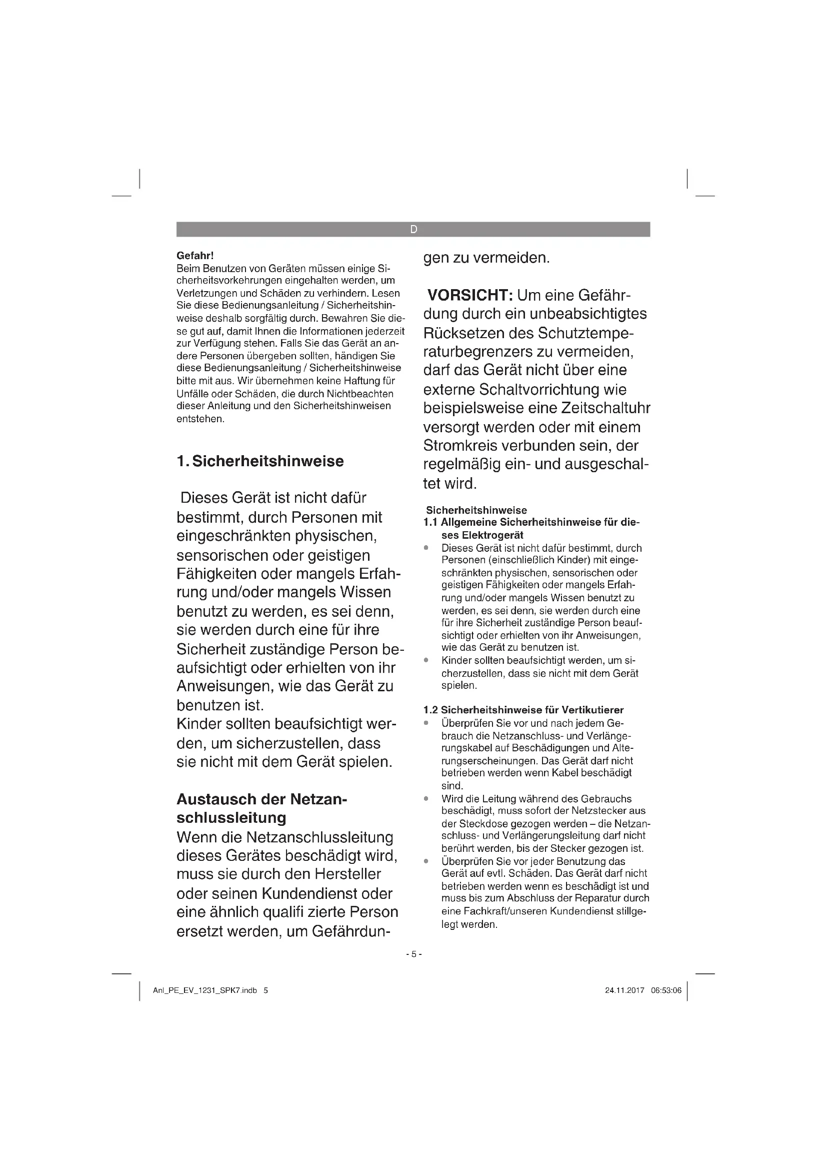 Überprüfen Sie vor jeder Benutzung das Gerät auf evtl. Schäden. Das Gerät darf nicht betrieben werden wenn es beschädigt ist und muss bis zum Abschluss der Reparatur durch eine Fachkraft/unseren Kundendienst stillge- legt werden. Anl_PE_EV_1231_SPK7.indb 5Anl_PE_EV_1231_SPK7.indb 5 24.11.2017 06:53:0624.11.2017 06:53:06D