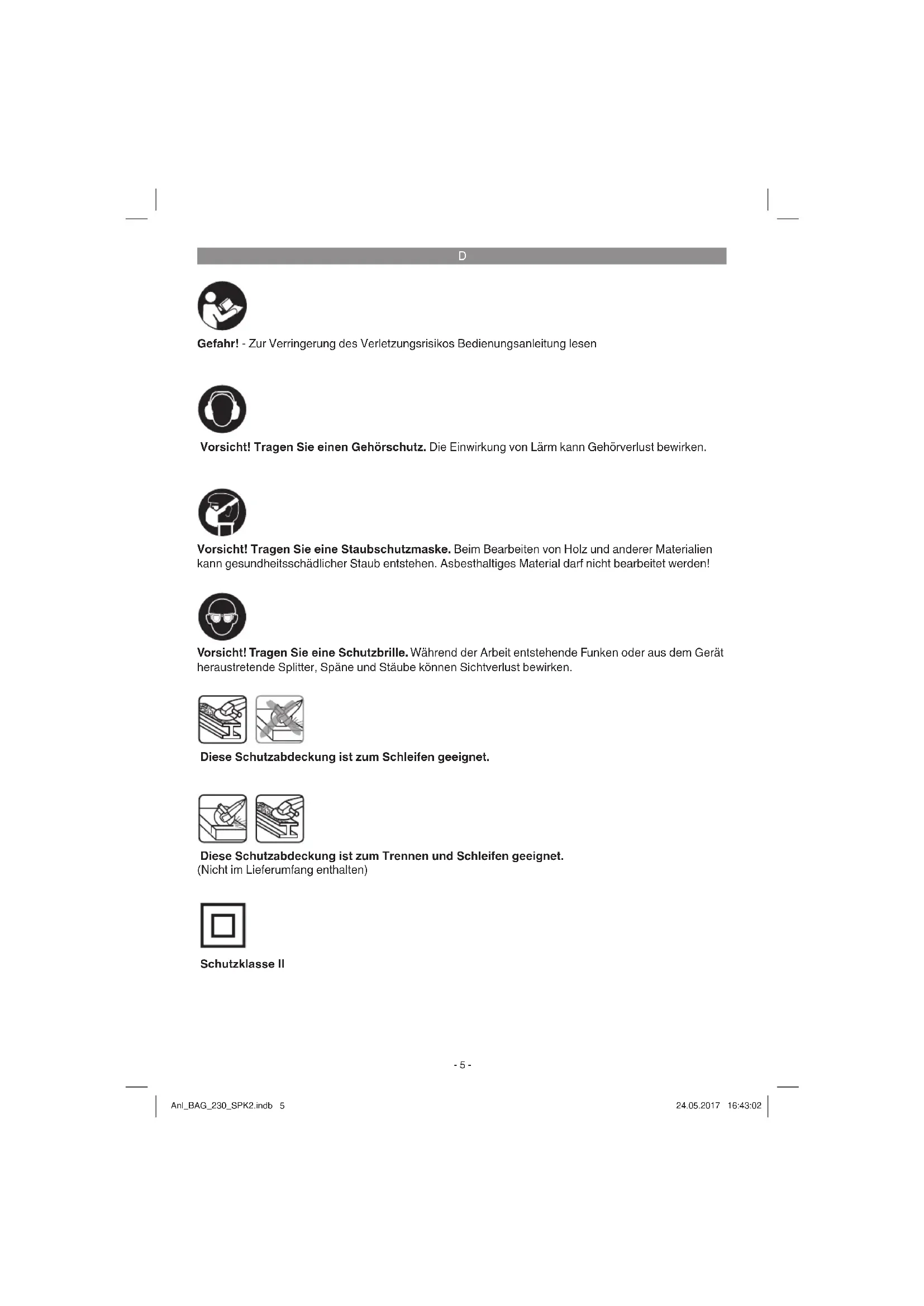 Gefahr! - Zur Verringerung des Verletzungsrisikos Bedienungsanleitung lesen Vorsicht! Tragen Sie einen Gehörschutz. Die Einwirkung von Lärm kann Gehörverlust bewirken. Vorsicht! Tragen Sie eine Schutzbrille. Während der Arbeit entstehende Funken oder aus dem Gerät heraustretende Splitter, Späne und Stäube können Sichtverlust bewirken. Vorsicht! Tragen Sie eine Staubschutzmaske. Beim Bearbeiten von Holz und anderer Materialien kann gesundheitsschädlicher Staub entstehen. Asbesthaltiges Material darf nicht bearbeitet werden! Diese Schutzabdeckung ist zum Trennen und Schleifen geeignet. (Nicht im Lieferumfang enthalten) Diese Schutzabdeckung ist zum Schleifen geeignet. Schutzklasse II Anl_BAG_230_SPK2.indb 5Anl_BAG_230_SPK2.indb 5 24.05.2017 16:43:0224.05.2017 16:43:02D