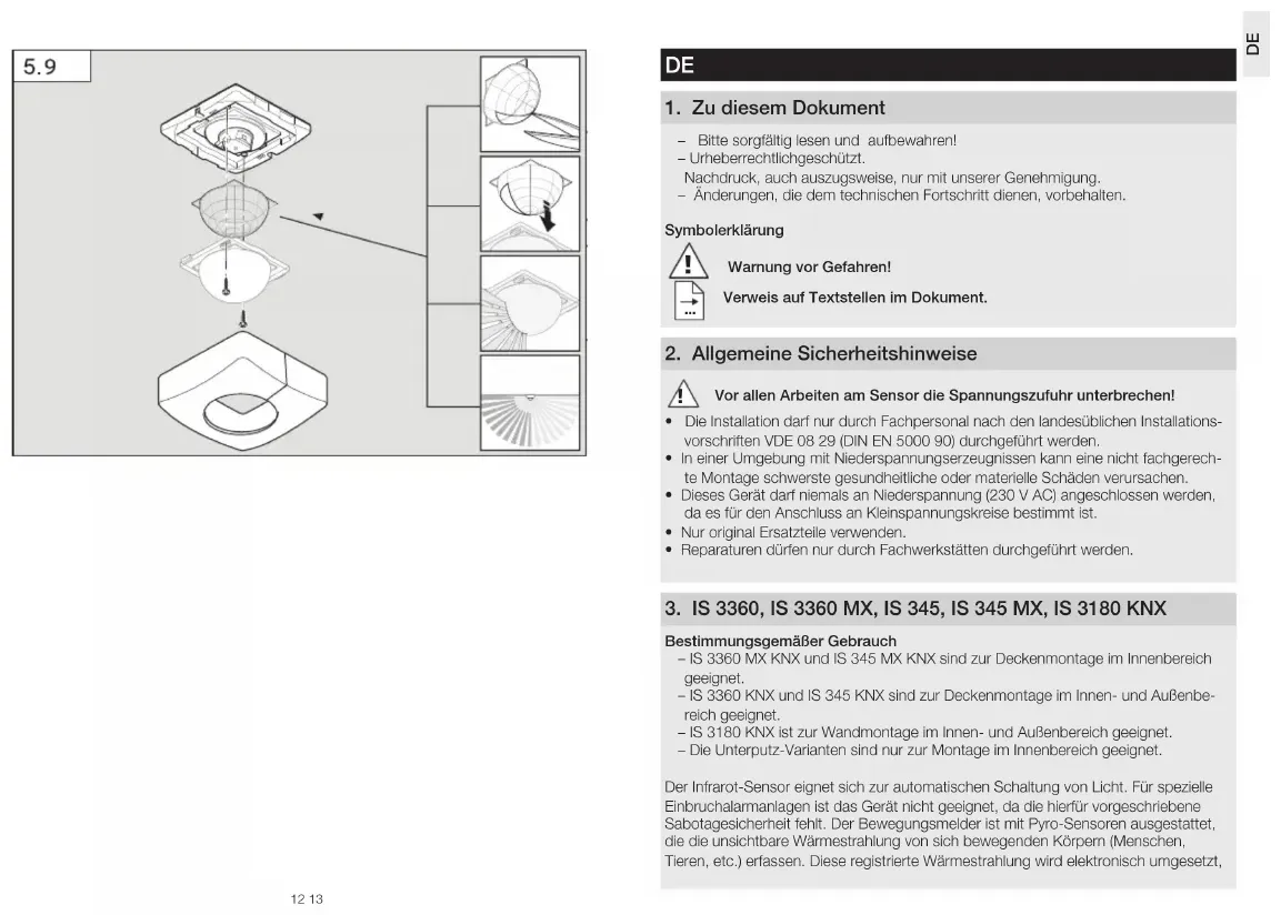 1 Zu diesem Dokument – Bitte sorgfältig lesen und aufbewahren! – Urheberrechtlich geschützt. Nachdruck, auch auszugsweise, nur mit unserer Genehmigung. – Änderungen, die dem technischen Fortschritt dienen, vorbehalten.Symbolerklärung Warnung vor Gefahren! Verweis auf Textstellen im Dokument 2 Allgemeine Sicherheitshinweise Vor allen Arbeiten am Sensor die Spannungszufuhr unterbrechen!• Die Installation darf nur durch Fachpersonal nach den landesüblichen Installations-vorschriften VDE 08 29 (DIN EN 5000 90) durchgeführt werden.• In einer Umgebung mit Niederspannungserzeugnissen kann eine nicht fachgerech-te Montage schwerste gesundheitliche oder materielle Schäden verursachen.• Dieses Gerät darf niemals an Niederspannung (230 V AC) angeschlossen werden, da es für den Anschluss an Kleinspannungskreise bestimmt ist.• Nur original Ersatzteile verwenden.• Reparaturen dürfen nur durch Fachwerkstätten durchgeführt werden. 3 IS3360, IS3360 MX, IS345, IS 345 MX, IS3180 KNX Bestimmungsgemäßer Gebrauch – IS3360MXKNX und IS345MXKNX sind zur Deckenmontage im Innenbereich geeignet. – IS3360KNX und IS345KNX sind zur Deckenmontage im Innen- und Außenbe-reich geeignet. – IS3180KNX ist zur Wandmontage im Innen- und Außenbereich geeignet. – Die Unterputz-Varianten sind nur zur Montage im Innenbereich geeignet.Der Infrarot-Sensor eignet sich zur automatischen Schaltung von Licht. Für spezielle Einbruchalarmanlagen ist das Gerät nicht geeignet, da die hierfür vorgeschriebene Sabotagesicherheit fehlt. Der Bewegungsmelder ist mit Pyro-Sensoren ausgestattet, die die unsichtbare Wärmestrahlung von sich bewegenden Körpern (Menschen, Tieren, etc.) erfassen. Diese registrierte Wärmestrahlung wird elektronisch umgesetzt,