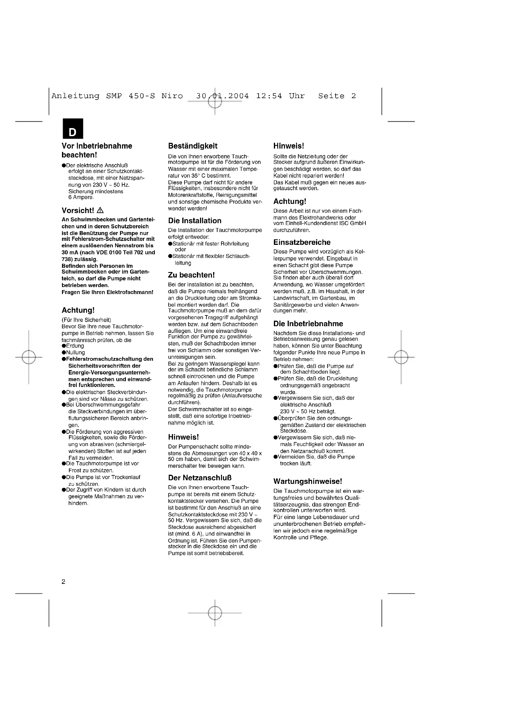 Bedienungsanleitung Schmutzwasserpumpe mit Schwimmschalter Operating InstructionsDirty-water pump with floating switch Mode d’emploiPompe à eau usée avecinterrupteuer à flotteur GebruiksaanwijzingDompelpomp met vlotterschakelaar Manual de instrucciones para Bomba para aguas sucias con interruptorde flotador con interruptor Manual de operaçãoda bomba de água suja com interruptor de flutuador BruksanvisningDränkbar motorpump med flytande brytare KäyttöohjeUimurikytkimellä varustettalikavesipumppu BruksanvisningSpillvannspumpe medvæskesansavbryterSpillvannspumpe √‰ËÁ›· ¯Ú‹Û˘AÓÙÏ›· aÎáıapÙou vÂpo‡ Ì ψÙfi ‰È·ÎfiÙË Istruzioni per l’usoPompa per acqua sporca con interruttoregalleggiante BetjeningsvejledningSpildevandspumpe med væskestandafbryderb SMP 450/1-S NIRO Art.-Nr.: 41.703.30 I.-Nr.: 01024 Anleitung SMP 450-S Niro 30.01.2004 12:54 Uhr Seite 12 Vor Inbetriebnahme beachten! ● Der elektrische Anschluß erfolgt an einer Schutzkontakt-steckdose, mit einer Netzspan-nung von 230 V ~ 50 Hz. Sicherung mindestens 6 Ampere. Vorsicht! An Schwimmbecken und Gartentei-chen und in deren Schutzbereichist die Benützung der Pumpe nurmit Fehlerstrom-Schutzschalter miteinem auslösenden Nennstrom bis30 mA (nach VDE 0100 Teil 702 und738) zulässig.Befinden sich Personen imSchwimmbecken oder im Garten-teich, so darf die Pumpe nichtbetrieben werden.Fragen Sie Ihren Elektrofachmann! Achtung! (Für Ihre Sicherheit) Bevor Sie Ihre neue Tauchmotor-pumpe in Betrieb nehmen, lassen Siefachmännisch prüfen, ob die● Erdung● Nullung● Fehlerstromschutzschaltung denSicherheitsvorschriften derEnergie-Versorgungsunterneh-men entsprechen und einwand-frei funktionieren.● Die elektrischen Steckverbindun-gen sind vor Nässe zu schützen.● Bei Überschwemmungsgefahr die Steckverbindungen im über-flutungssicheren Bereich anbrin- gen. ● Die Förderung von aggressiven Flüssigkeiten, sowie die Förder-ung von abrasiven (schmiergel-wirkenden) Stoffen ist auf jeden Fall zu vermeiden.● Die Tauchmotorpumpe ist vor Frost zu schützen.● Die Pumpe ist vor Trockenlauf zu schützen.● Der Zugriff von Kindern ist durch geeignete Maßnahmen zu ver-hindern. Hinweis! Sollte die Netzleitung oder derStecker aufgrund äußeren Einwirkun-gen beschädigt werden, so darf dasKabel nicht repariert werden!Das Kabel muß gegen ein neues aus-getauscht werden. Achtung! Diese Arbeit ist nur von einem Fach-mann des Elektrohandwerks odervom Einhell-Kundendienst ISC GmbHdurchzuführen. Einsatzbereiche Diese Pumpe wird vorzüglich als Kel-lerpumpe verwendet. Eingebaut ineinen Schacht gibt diese PumpeSicherheit vor Überschwemmungen.Sie finden aber auch überall dortAnwendung, wo Wasser umgefördertwerden muß, z.B. im Haushalt, in derLandwirtschaft, im Gartenbau, imSanitärgewerbe und vielen Anwen-dungen mehr. Die Inbetriebnahme Nachdem Sie diese Installations- undBetriebsanweisung genau gelesenhaben, können Sie unter Beachtungfolgender Punkte Ihre neue Pumpe inBetrieb nehmen:● Prüfen Sie, daß die Pumpe aufdem Schachtboden liegt.● Prüfen Sie, daß die Druckleitungordnungsgemäß angebrachtwurde.● Vergewissern Sie sich, daß derelektrische Anschluß230 V ~ 50 Hz beträgt.● Überprüfen Sie den ordnungs-gemäßen Zustand der elektrischenSteckdose.● Vergewissern Sie sich, daß nie-mals Feuchtigkeit oder Wasser anden Netzanschluß kommt.● Vermeiden Sie, daß die Pumpetrocken läuft. Wartungshinweise! Die Tauchmotorpumpe ist ein war- tungsfreies und bewährtes Quali- tätserzeugnis, das strengen End- kontrollen unterworfen wird. Für eine lange Lebensdauer und ununterbrochenen Betrieb empfeh- len wir jedoch eine regelmäßige Kontrolle und Pflege. Beständigkeit Die von Ihnen erworbene Tauch-motorpumpe ist für die Förderung vonWasser mit einer maximalen Tempe-ratur von 35° C bestimmt.Diese Pumpe darf nicht für andereFlüssigkeiten, insbesondere nicht fürMotorenkraftstoffe, Reinigungsmittelund sonstige chemische Produkte ver-wendet werden! Die Installation Die Installation der Tauchmotorpumpeerfolgt entweder:● Stationär mit fester Rohrleitung oder ● Stationär mit flexibler Schlauch-leitung Zu beachten! Bei der Installation ist zu beachten,daß die Pumpe niemals freihängendan die Druckleitung oder am Stromka-bel montiert werden darf. DieTauchmotorpumpe muß an dem dafürvorgesehenen Tragegriff aufgehängtwerden bzw. auf dem Schachtbodenaufliegen. Um eine einwandfreieFunktion der Pumpe zu gewährlei-sten, muß der Schachtboden immerfrei von Schlamm oder sonstigen Ver-unreinigungen sein. Bei zu geringem Wasserspiegel kannder im Schacht befindliche Schlammschnell eintrocknen und die Pumpeam Anlaufen hindern. Deshalb ist esnotwendig, die Tauchmotorpumperegelmäßig zu prüfen (Anlaufversuchedurchführen).Der Schwimmschalter ist so einge-stellt, daß eine sofortige Inbetrieb-nahme möglich ist. Hinweis! Der Pumpenschacht sollte minde-stens die Abmessungen von 40 x 40 x50 cm haben, damit sich der Schwim-merschalter frei bewegen kann. Der Netzanschluß Die von Ihnen erworbene Tauch-pumpe ist bereits mit einem Schutz-kontaktstecker versehen. Die Pumpeist bestimmt für den Anschluß an eineSchutzkontaktsteckdose mit 230 V ~50 Hz. Vergewissern Sie sich, daß dieSteckdose ausreichend abgesichertist (mind. 6 A), und einwandfrei inOrdnung ist. Führen Sie den Pumpen-stecker in die Steckdose ein und diePumpe ist somit betriebsbereit.