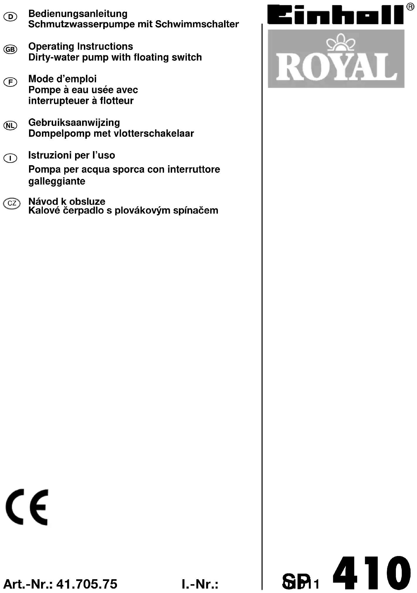 ● Achten Sie auch darauf , daß der Abstand zwischen den Schwimm- schalterkopf und der Schwimm- schalterrasterung nicht zu gering ist. Bei zu geringen Abstand wird die einwandfreie Funktion nicht gewähr- leistet. ● Achten Sie bei der Einstellung des Schwimmschalters darauf, daß der Schwimmschalter nicht vor dem Ausschalten der Pumpe den Boden berührt. Achtung! Gefahr des Trockenlaufes.ROYAL SP 410 Netzanschluß 230V ~ 50 Hz Aufnahmeleistung 400 Watt Fördermenge max. 8.200 l/h Förderhöhe max. 5 m Eintauchtiefe max. 5 m Wassertemperatur max. 35°C Schlauchanschluß 5/4”IG Fremdkörper max.: Ø 30 mm Schaltpunkthöhe: EIN ca. 50 cm Schaltpunkthöhe: AUS ca. 5 cm Art.-Nr.: 41.705.75 Garantiehinweise: Nicht unter die Garantie fallen:● Zerstörung der Gleitringdichtung durch Trockenlaufoder Fremdkörperbeimengungen im Wasser● Verstopfung des Laufrades durch Fremdkörper● Transportschaden● Schäden, verursacht durch Fremdeingriffe Technische Daten