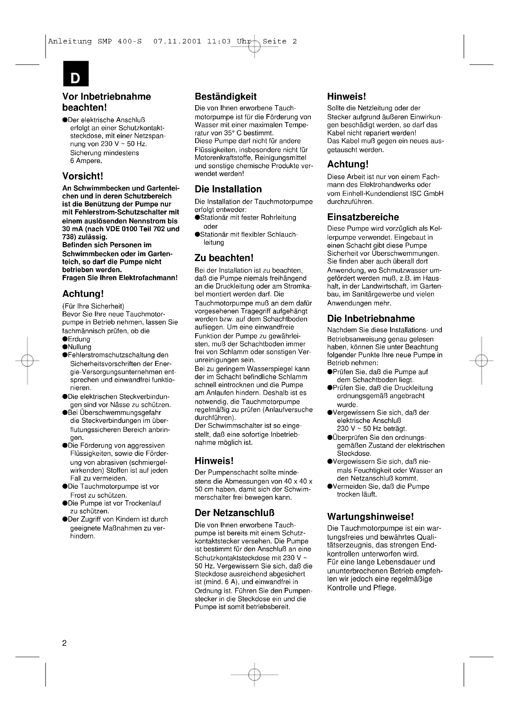 Brugsanvisning Spildevandspumpe med væskestandafbryder Art.-Nr.: 41.708.90 SMP 400-S Anleitung SMP 400-S 07.11.2001 11:03 Uhr Seite 12 Vor Inbetriebnahme beachten! ● Der elektrische Anschluß erfolgt an einer Schutzkontakt- steckdose, mit einer Netzspan- nung von 230 V ~ 50 Hz. Sicherung mindestens 6 Ampere. Vorsicht! An Schwimmbecken und Gartentei- chen und in deren Schutzbereich ist die Benützung der Pumpe nur mit Fehlerstrom-Schutzschalter mit einem auslösenden Nennstrom bis 30 mA (nach VDE 0100 Teil 702 und