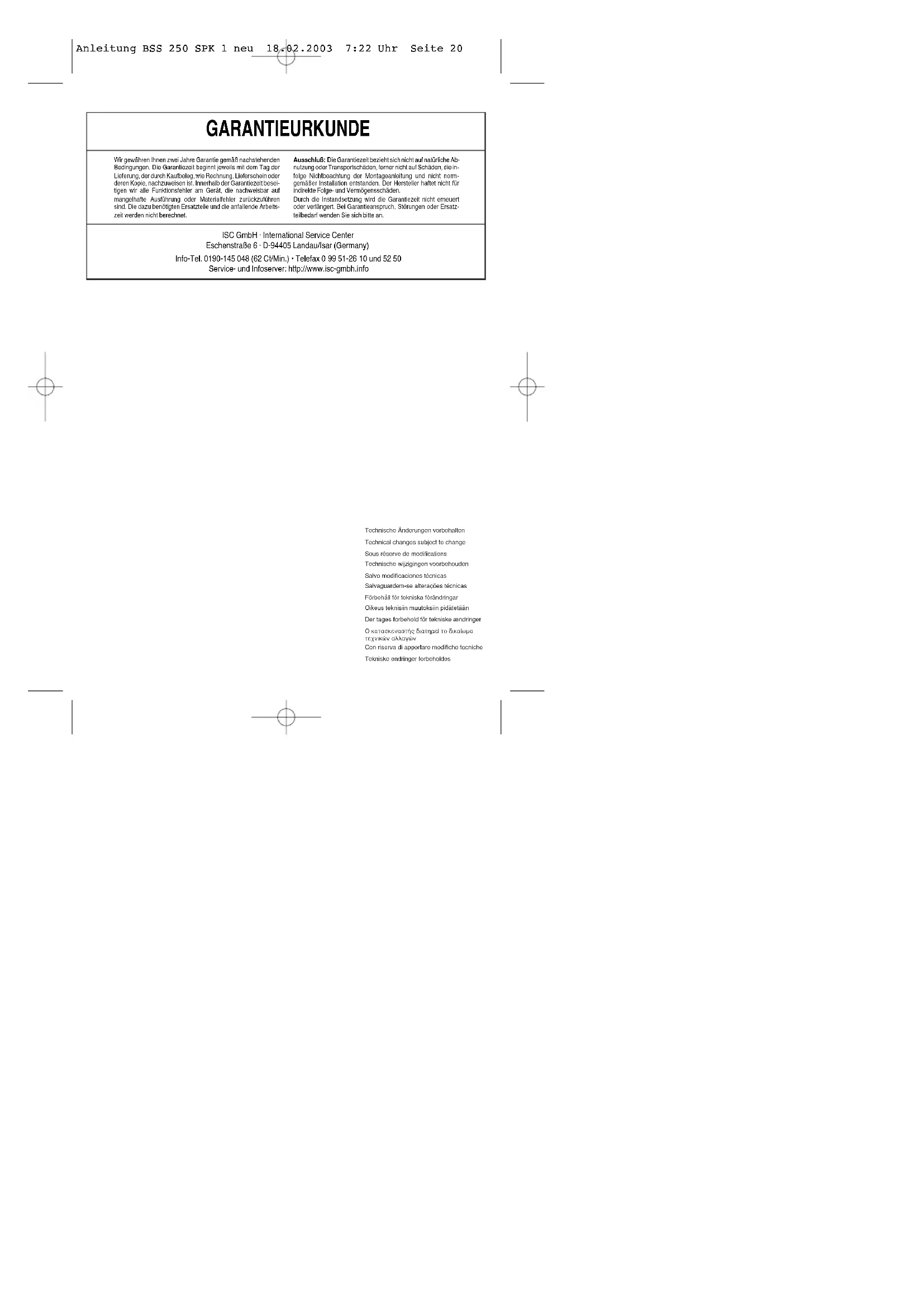 CERTYFIKAT GWARANCJI Okres gwarancji zaczyna się od momentu kupna urządzenia i kończy się po upływie 2 roku. Gwa- rancja obejmuje wadliwe wykonanie wyrobu oraz wady w materiale lub w funkcjonowaniu urządze- nia. Klient nie płaci za potrzebne do usunięcia usterki części zamienne oraz za czas pracy. Producent nie odpowiada za szkody pośrednie. Państwa serwis obsługi klientów Garanciaokmány A garancia idôtartama 24 hónap és a vásárlás napjával kezdôdik. A szavatosság csakis a kivitelezési hiányokra vagy az anyagi és měködési hibákra terjed ki. Az ehhez szükséges pótalkatrészeket és a munkai- dôt nem számítjuk fel. Nem szavatolunk a másodlagos károkért. Az Ön vevôszolgálati partnere. Anleitung BSS 250 SPK 1 neu 18.02.2003 7:22 Uhr Seite 19Technische Änderungen vorbehalten Technical changes subject to change Sous réserve de modifications Technische wijzigingen voorbehouden Salvo modificaciones técnicas Salvaguardem-se alterações técnicas Förbehåll för tekniska förändringar Oikeus teknisiin muutoksiin pidätetään Der tages forbehold för tekniske ændringer √ ηٷÛÎÂÓ·ÛÙ‹˜ ‰È·ÙËÚ› ÙÔ ‰Èη›ˆÌ· Ù¯ÓÈÎÒÓ ·ÏÏ·ÁÒÓ Con riserva di apportare modifiche tecniche Tekniske endringer forbeholdes GARANTIEURKUNDE Wir gewähren Ihnen zwei Jahre Garantie gemäß nachstehenden Bedingungen. Die Garantiezeit beginnt jeweils mit dem Tag der Lieferung, der durch Kaufbeleg, wie Rechnung, Lieferschein oder deren Kopie, nachzuweisen ist. Innerhalb der Garantiezeit besei- tigen wir alle Funktionsfehler am Gerät, die nachweisbar auf mangelhafte Ausführung oder Materialfehler zurückzuführen sind. Die dazu benötigten Ersatzteile und die anfallende Arbeits- zeit werden nicht berechnet. Ausschluß: Die Garantiezeit bezieht sich nicht auf natürliche Ab- nutzung oder Transportschäden, ferner nicht auf Schäden, die in- folge Nichtbeachtung der Montageanleitung und nicht norm- gemäßer Installation entstanden. Der Hersteller haftet nicht für indirekte Folge- und Vermögensschäden. Durch die Instandsetzung wird die Garantiezeit nicht erneuert oder verlängert. Bei Garantieanspruch, Störungen oder Ersatz- teilbedarf wenden Sie sich bitte an. ISC GmbH · International Service Center Eschenstraße 6 · D-94405 Landau/Isar (Germany) Info-Tel. 0190-145 048 (62 Ct/Min.) • Telefax 0 99 51-26 10 und 52 50 Service- und Infoserver: http://www.isc-gmbh.info Anleitung BSS 250 SPK 1 neu 18.02.2003 7:22 Uhr Seite 20Anleitung BSS 250 SPK 1 neu 18.02.2003 7:22 Uhr Seite 21Anleitung BSS 250 SPK 1 neu 18.02.2003 7:22 Uhr Seite 22Anleitung BSS 250 SPK 1 neu 18.02.2003 7:22 Uhr Seite 23 ISC GmbH Eschenstraße 6 D-94405 Landau/Isar Tel. (0190) 145 048, Fax (0 99 51) 2610 u. 5250 Hans Einhell Österreich Gesellschaft m.b.H. Mühlgasse 1 A-2353 Guntramsdorf Tel. (02236) 53516, Fax (02236) 52369 Fubag International Schlachthofstraße 19 CH-8406 Winterthur Tel. (052) 2090250, Fax (052) 2090260 Einhell UK Ltd Morpeth Wharf Twelve Quays Birkenhead, Wirral CH 41 1NG Tel. 0151 6491500, Fax 0151 6491501 Pou toutes informationes ou service après vente, merci de prendre contact avec votre revendeur. Einhell Benelux Veldsteen 44 NL-4815 PK Breda Tel. 0528 232977, Fax 0528 232978 Einhell Benelux Veldsteen 44 NL-4815 PK Breda Tel. 0528 232977, Fax 0528 232978 Comercial Einhell S.A. Antonio Cabezon, N° 83 Planta 3a E-28034 Fuencarral Madrid Tel. 91 7294888, Fax 91 3581500 Einhell Iberica Rua da Aldeia , 225 Apartado 2100 P-4405-017 Arcozelo VNG Tel. 022 0917500 Fax 022 0917527 Einhell Italia s.r.l. Via Marconi, 16 I-22070 Beregazzo (Co) Tel. 031 992080, Fax 031 992084 Einhell Skandinavia Bergsoevej 36 DK-8600 Silkeborg Tel. 087 201200, Fax 087 201203 Sähkötalo Harju OY Korjaamokatu 2 FIN-33840 Tampere Tel. 03 2345000, Fax 03 2345040 Einhell Polska sp. Z.o.o. Ul. Miedzyleska PL-50-554 Wroclaw Tel. 071 3346508, Fax 071 3346503 Einhell Hungaria Ltd. Vajda Peter u. 12 H 1089 Budapest Tel. 01 3039401, Fax 01 2101179 Semak makina ticaret ve sanayi ltd. sti. Altay Cesme Mah. Yasemin Sok. No: 19 TR 34843 Maltepe - Istanbul Tel. 0216 4594865, Fax 0216 4429325 Novatech S.R.L. Bd.Lasar Catargiu 24-26 S.C. A Ap. 9 Sector 1 RO 75 121 Bucharest Tel. 021 4104800, Fax 021 4103568 Poker Plus S.R.O. Areal Vu Bechovice Budava 10B CZ-19011 Praha - Bechovice 911 Tel.+Fax 02579 10204 Einhell Bulgarien 34 A,Stefan Stambolov Str. Apt. 4 BG 9000 Varna Tel. 052 605254, Fax 052 605822 Luma Trading d.o.o. Ljubljanska 39 SLO-4000 Kranj Tel- 064 355330, Fax 064 2355333 Einhell Croatia d.o.o. Velika Ves 2 HR 49224 Lepajci Tel 049/342 444, Fax 049 342-392 MP Trading d.o.o. Cika Ljubina 8/IV YU 11000 Beograd An. Mavrofidopoulos S.A. Technical & Commercial company 12, Papastratou & Asklipiou Str. GR 18545 Piräus Tel 0210 4136155, Fax 0210 4137692 Bermas Altufyevskoye shosse, 2A RUS 127273 Moscowi Tel 095 3639580, Fax 095 3639581 EH 01/2003 Anleitung BSS 250 SPK 1 neu 18.02.2003 7:22 Uhr Seite 24