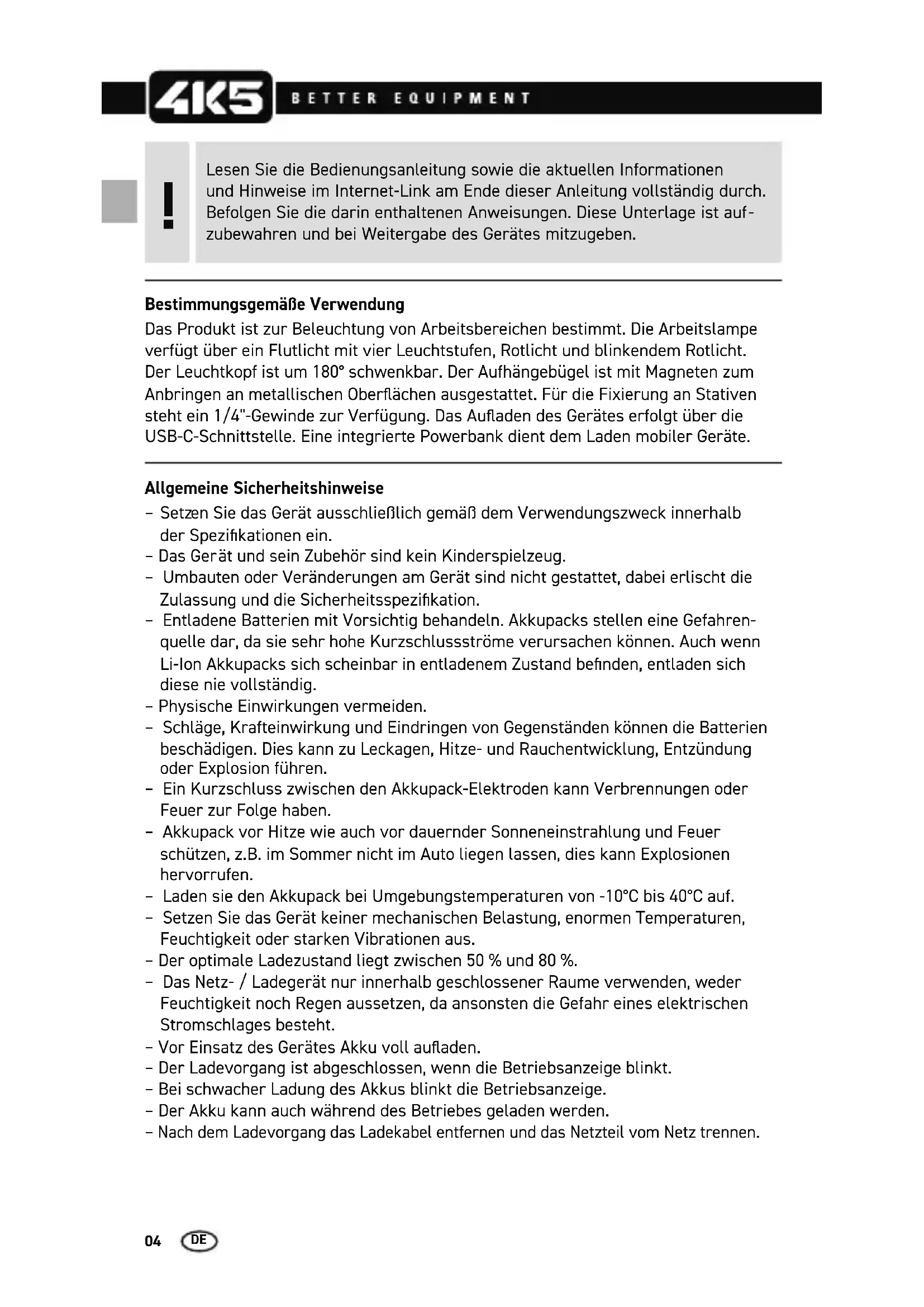 Bestimmungsgemäße Verwendung Das Produkt ist zur Beleuchtung von Arbeitsbereichen bestimmt. Die Arbeitslampe verfügt über ein Flutlicht mit vier Leuchtstufen, Rotlicht und blinkendem Rotlicht. Der Leuchtkopf ist um 180° schwenkbar. Der Aufhängebügel ist mit Magneten zum Anbringen an metallischen Oberächen ausgestattet. Für die Fixierung an Stativen steht ein 1/4"-Gewinde zur Verfügung. Das Auaden des Gerätes erfolgt über die USB-C-Schnittstelle. Eine integrierte Powerbank dient dem Laden mobiler Geräte. Allgemeine Sicherheitshinweise