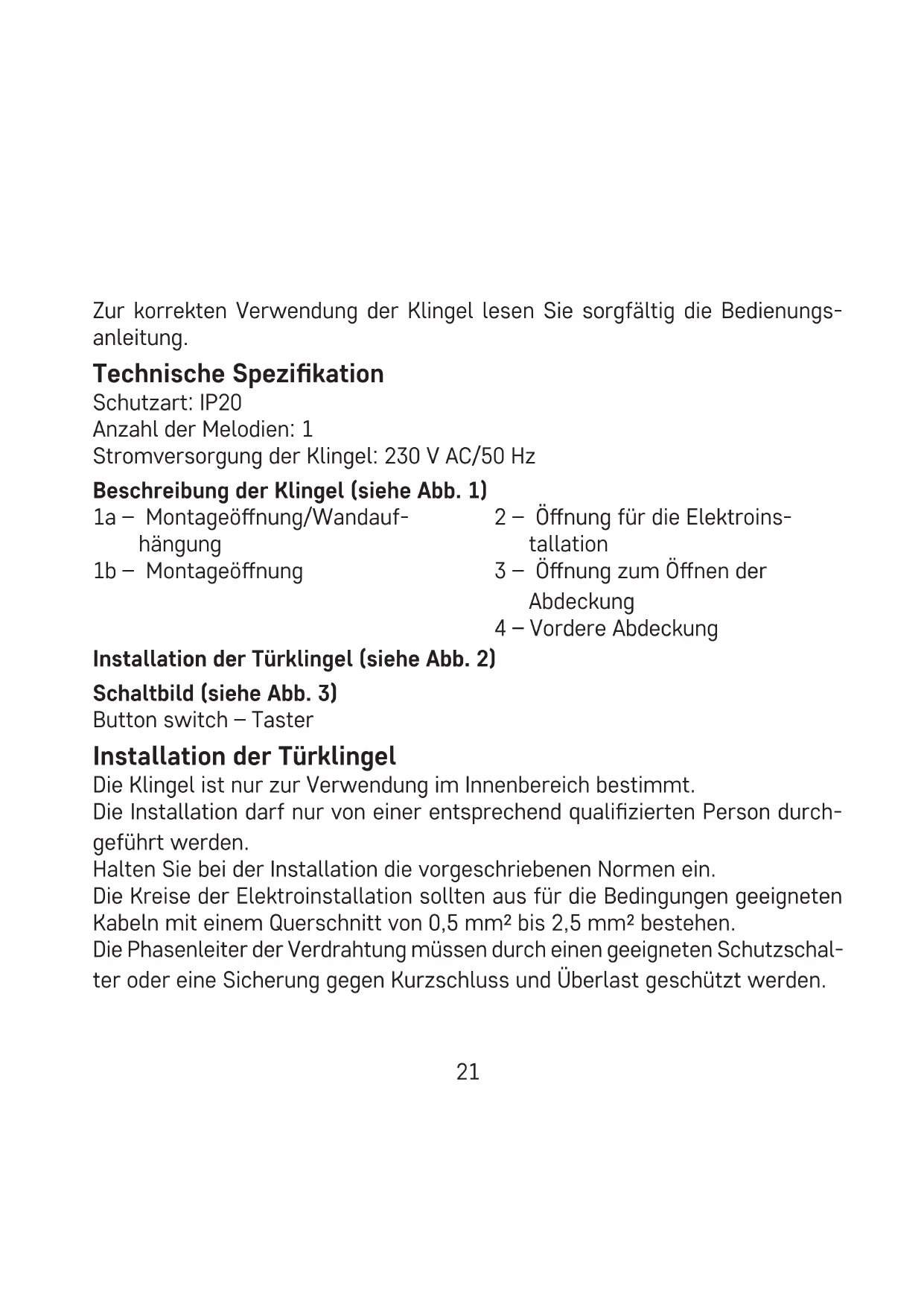 - Za čišćenje uređaja koristite blago navlaženu krpu s malo deterdženta; ne upotrebljavajte agresivna sredstva za čišćenje ili otapala. Nije predviđeno da ovaj uređaj upotrebljavaju osobe (uključujući djecu) smanje- nih zičkih, osjetilnih ili mentalnih sposobnosti koje nemaju iskustva i znanja za njihovu sigurnu upotrebu. Takve osobe treba podučiti kako koristiti uređaj i treba ih nadzirati osoba zadužena za njihovu sigurnost. Djeca uvijek trebaju biti pod nadzorom kako se ne bi igrala s uređajem. DE | Draht-Türklingel Die Klingel ist für den dauerhaften Anschluss an ein Stromnetz mit einer Spannung von 230 V AC/50 Hz bestimmt.21 Zur korrekten Verwendung der Klingel lesen Sie sorgfältig die Bedienungs- anleitung. Technische Spezikation Schutzart: IP20 Anzahl der Melodien: 1 Stromversorgung der Klingel: 230 V AC/50 Hz Beschreibung der Klingel (siehe Abb. 1) 1a – Montageönung/Wandauf- hängung 1b – Montageönung 2 – Önung für die Elektroins- tallation 3 – Önung zum Önen der Abdeckung 4 – Vordere Abdeckung Installation der Türklingel (siehe Abb. 2) Schaltbild (siehe Abb. 3) Button switch – Taster Installation der Türklingel Die Klingel ist nur zur Verwendung im Innenbereich bestimmt. Die Installation darf nur von einer entsprechend qualizierten Person durch- geführt werden. Halten Sie bei der Installation die vorgeschriebenen Normen ein. Die Kreise der Elektroinstallation sollten aus für die Bedingungen geeigneten Kabeln mit einem Querschnitt von 0,5 mm bis 2,5 mm bestehen. Die Phasenleiter der Verdrahtung müssen durch einen geeigneten Schutzschal- ter oder eine Sicherung gegen Kurzschluss und Überlast geschützt werden.22