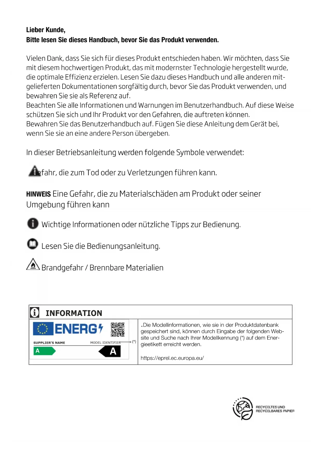 Lieber Kunde, Bitte lesen Sie dieses Handbuch, bevor Sie das Produkt verwenden. Vielen Dank, dass Sie sich für dieses Produkt entschieden haben. Wir möchten, dass Sie mit diesem hochwertigen Produkt, das mit modernster Technologie hergestellt wurde, die optimale Effizienz erzielen. Lesen Sie dazu dieses Handbuch und alle anderen mit-gelieferten Dokumentationen sorgfältig durch, bevor Sie das Produkt verwenden, und bewahren Sie sie als Referenz auf. Beachten Sie alle Informationen und Warnungen im Benutzerhandbuch. Auf diese Weise schützen Sie sich und Ihr Produkt vor den Gefahren, die auftreten können.Bewahren Sie das Benutzerhandbuch auf. Fügen Sie diese Anleitung dem Gerät bei, wenn Sie sie an eine andere Person übergeben. In dieser Betriebsanleitung werden folgende Symbole verwendet: Gefahr, die zum Tod oder zu Verletzungen führen kann. HINWEIS Eine Gefahr, die zu Materialschäden am Produkt oder seiner Umgebung führen kann Wichtige Informationen oder nützliche Tipps zur Bedienung. Lesen Sie die Bedienungsanleitung. Brandgefahr / Brennbare Materialien2 /28 DE Kühlschrank/ Bedienungsanleitung 1-Sicherheitsanweisungen 3