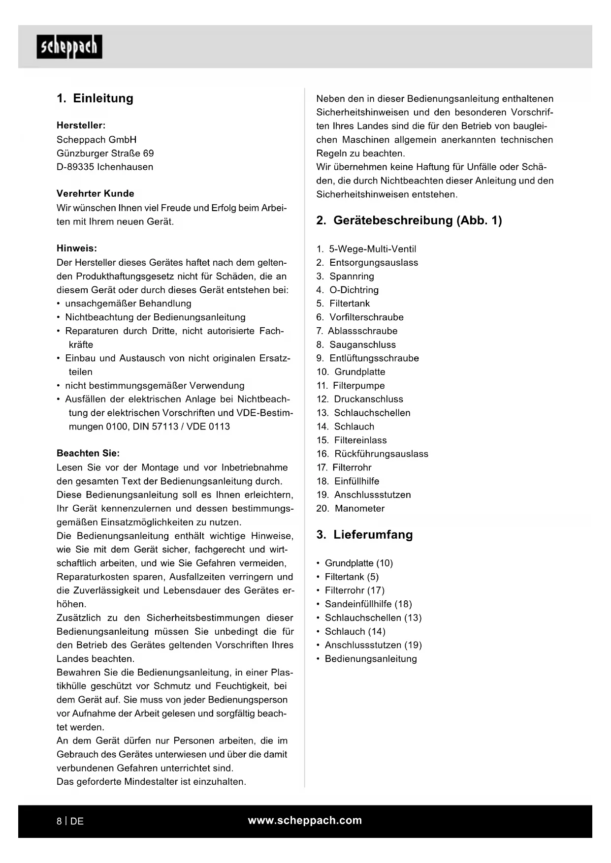 Hersteller: Scheppach GmbH Günzburger Straße 69 D-89335 Ichenhausen Verehrter Kunde Wir wünschen Ihnen viel Freude und Erfolg beim Arbei- ten mit Ihrem neuen Gerät. Hinweis: Der Hersteller dieses Gerätes haftet nach dem gelten- den Produkthaftungsgesetz nicht für Schäden, die an diesem Gerät oder durch dieses Gerät entstehen bei: