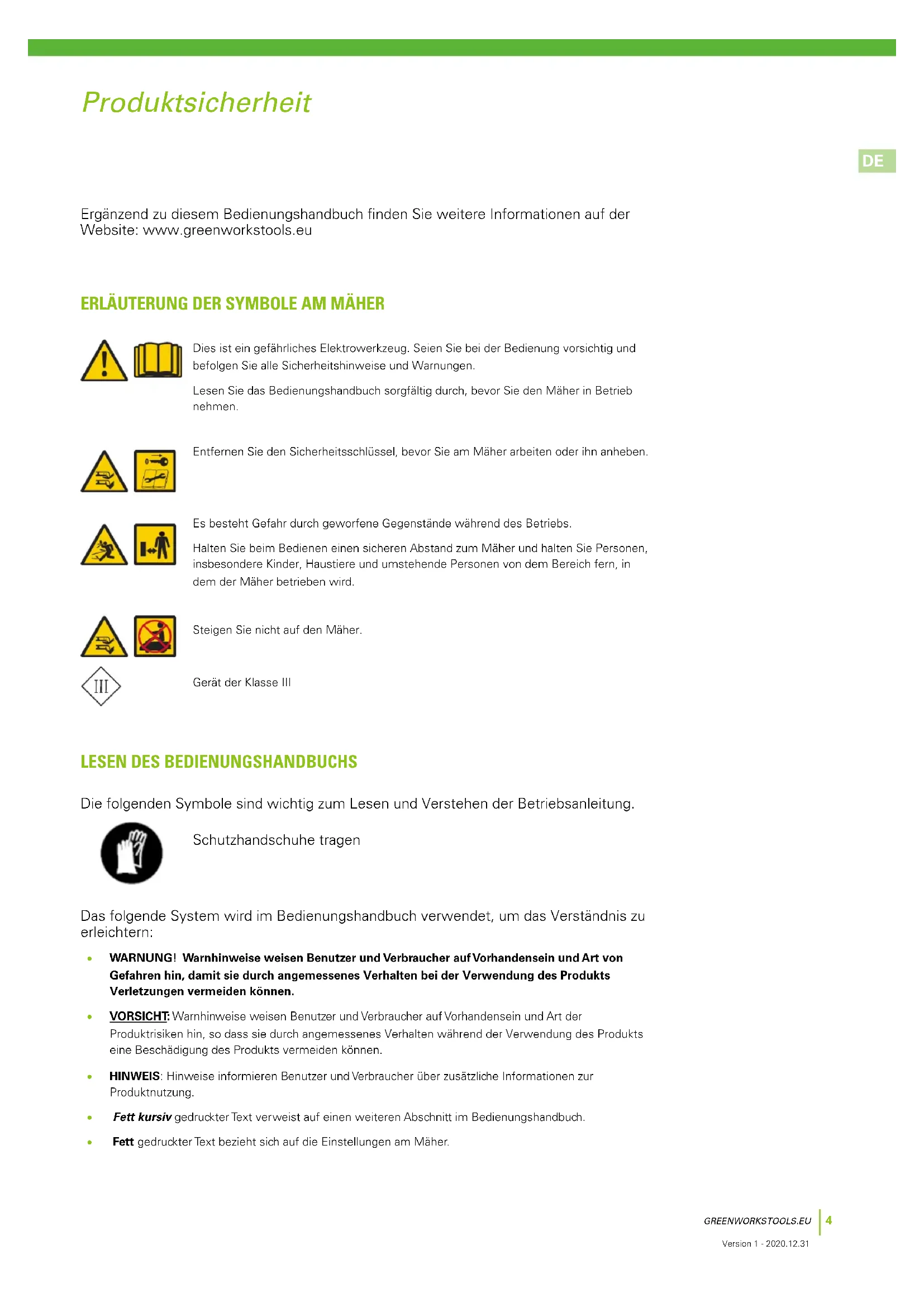 Version 1 - 2020.12.31 ERLÄUTERUNG DER SYMBOLE AM MÄHER Dies ist ein gefährliches Elektrowerkzeug. Seien Sie bei der Bedienung vorsichtig und befolgen Sie alle Sicherheitshinweise und Warnungen. Lesen Sie das Bedienungshandbuch sorgfältig durch, bevor Sie den Mäher in Betrieb nehmen. Entfernen Sie den Sicherheitsschlüssel, bevor Sie am Mäher arbeiten oder ihn anheben. Es besteht Gefahr durch geworfene Gegenstände während des Betriebs. Halten Sie beim Bedienen einen sicheren Abstand zum Mäher und halten Sie Personen, insbesondere Kinder, Haustiere und umstehende Personen von dem Bereich fern, in dem der Mäher betrieben wird. Steigen Sie nicht auf den Mäher. Gerät der Klasse III Ergänzend zu diesem Bedienungshandbuch finden Sie weitere Informationen auf der Website: www.greenworkstools.eu