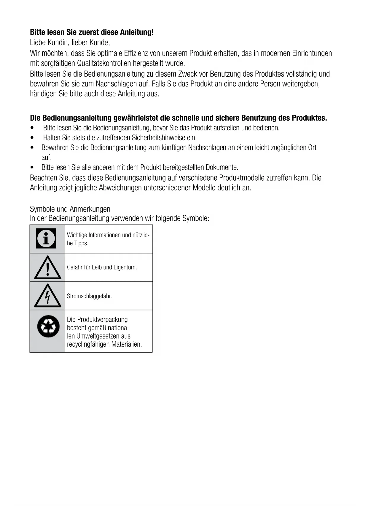 UPOZORNENIE: Ak problém pretrváva aj po vykonaní pokynov v tejto časti, obráťte sa na svojho predajcu alebo na autorizovaný servis. Nepokúšajte sa opraviť produkt.Bitte lesen Sie zuerst diese Anleitung! Liebe Kundin, lieber Kunde, Wir möchten, dass Sie optimale Effizienz von unserem Produkt erhalten, das in modernen Einrichtungen mit sorgfältigen Qualitätskontrollen hergestellt wurde. Bitte lesen Sie die Bedienungsanleitung zu diesem Zweck vor Benutzung des Produktes vollständig und bewahren Sie sie zum Nachschlagen auf. Falls Sie das Produkt an eine andere Person weitergeben, händigen Sie bitte auch diese Anleitung aus. Die Bedienungsanleitung gewährleistet die schnelle und sichere Benutzung des Produktes. t Bitte lesen Sie die Bedienungsanleitung, bevor Sie das Produkt aufstellen und bedienen. t Halten Sie stets die zutreffenden Sicherheitshinweise ein. t Bewahren Sie die Bedienungsanleitung zum künftigen Nachschlagen an einem leicht zugänglichen Ort auf. t Bitte lesen Sie alle anderen mit dem Produkt bereitgestellten Dokumente. Beachten Sie, dass diese Bedienungsanleitung auf verschiedene Produktmodelle zutreffen kann. Die Anleitung zeigt jegliche Abweichungen unterschiedener Modelle deutlich an. Symbole und Anmerkungen In der Bedienungsanleitung verwenden wir folgende Symbole: