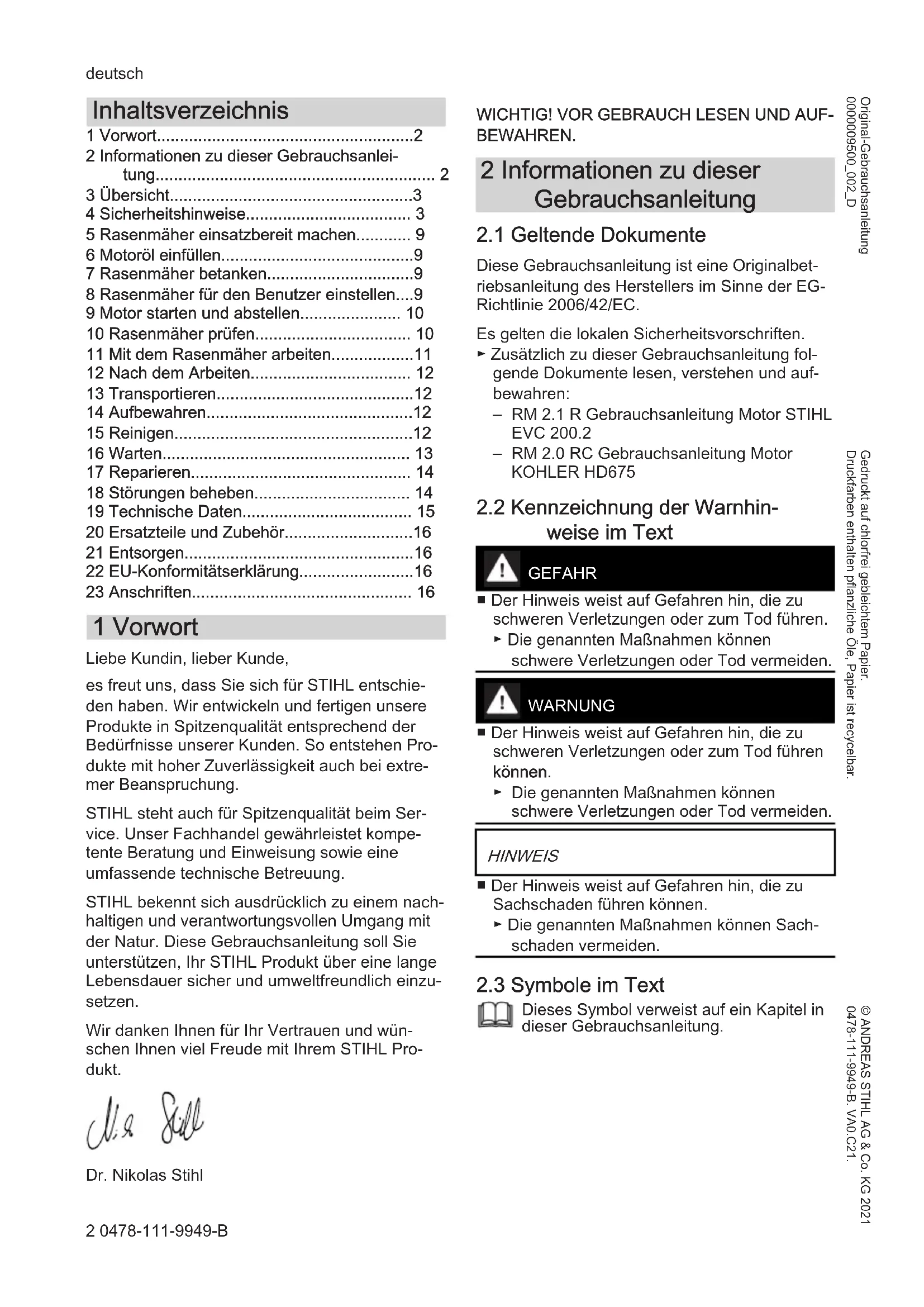 Dieses Symbol verweist auf ein Kapitel in dieser Gebrauchsanleitung. deutsch 2 0478-111-9949-B © ANDREAS STIHL AG & Co. KG 2021 0478-111-9949-B. VA0.C21. Gedruckt auf chlorfrei gebleichtem Papier. Druckfarben enthalten pflanzliche Öle, Papier ist recycelbar. Original-Gebrauchsanleitung 0000009500_002_D3 Übersicht
