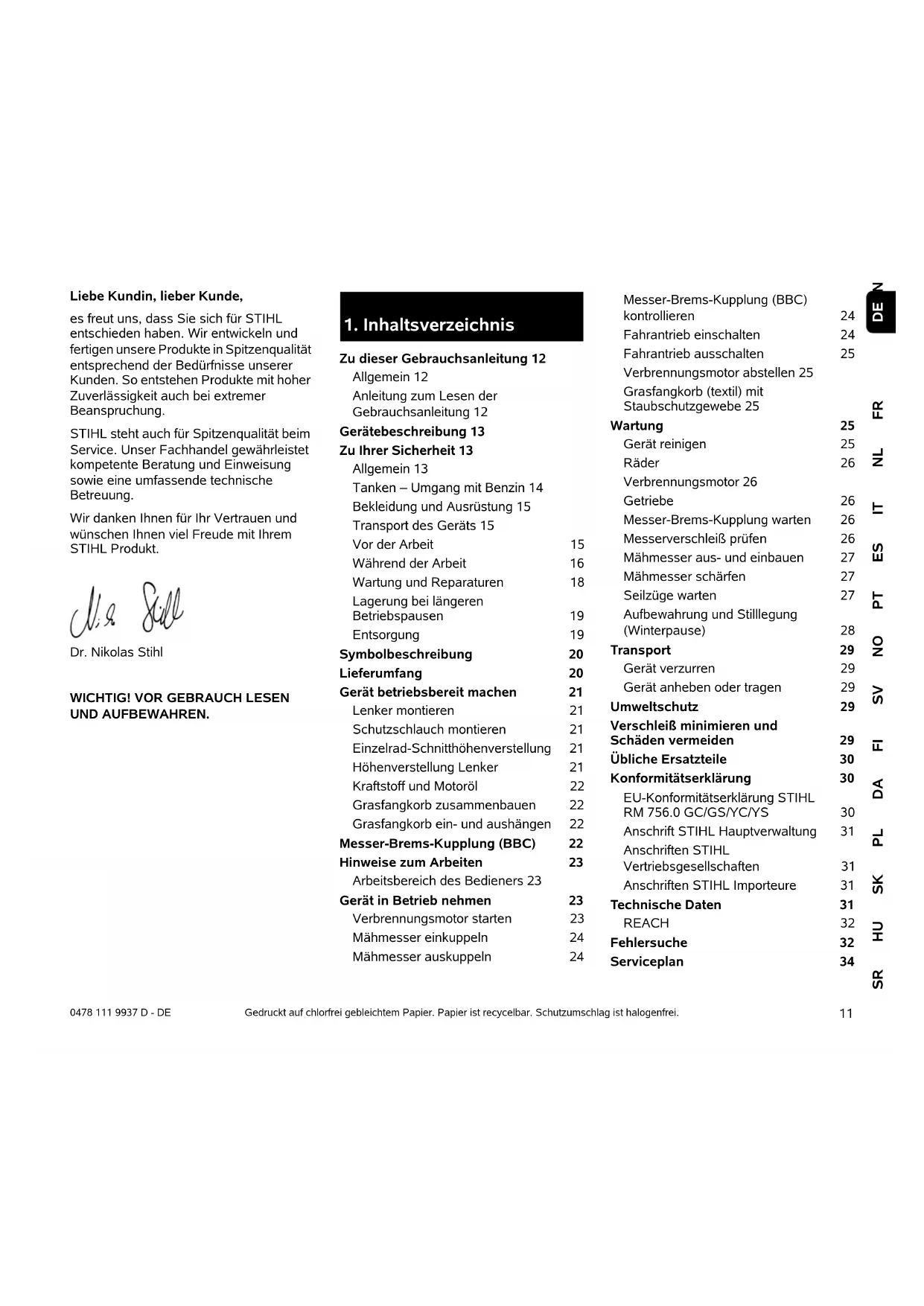 Zu dieser Gebrauchsanleitung 12 Allgemein 12 Anleitung zum Lesen der Gebrauchsanleitung 12 Gerätebeschreibung 13 Zu Ihrer Sicherheit 13 Allgemein 13 Tanken – Umgang mit Benzin 14 Bekleidung und Ausrüstung 15 Transport des Geräts 15 Vor der Arbeit 15 Während der Arbeit 16 Wartung und Reparaturen 18 Lagerung bei längeren Betriebspausen 19 Entsorgung 19 Symbolbeschreibung 20 Lieferumfang 20 Gerät betriebsbereit machen 21 Lenker montieren 21 Schutzschlauch montieren 21 Einzelrad-Schnitthöhenverstellung 21 Höhenverstellung Lenker 21 Kraftstoff und Motoröl 22 Grasfangkorb zusammenbauen 22 Grasfangkorb ein- und aushängen 22 Messer-Brems-Kupplung (BBC) 22 Hinweise zum Arbeiten 23 Arbeitsbereich des Bedieners 23 Gerät in Betrieb nehmen 23 Verbrennungsmotor starten 23 Mähmesser einkuppeln 24 Mähmesser auskuppeln 24 Messer-Brems-Kupplung (BBC) kontrollieren 24 Fahrantrieb einschalten 24 Fahrantrieb ausschalten 25 Verbrennungsmotor abstellen 25 Grasfangkorb (textil) mit Staubschutzgewebe 25 Wartung 25 Gerät reinigen 25 Räder 26 Verbrennungsmotor 26 Getriebe 26 Messer-Brems-Kupplung warten 26 Messerverschleiß prüfen 26 Mähmesser aus- und einbauen 27 Mähmesser schärfen 27 Seilzüge warten 27 Aufbewahrung und Stilllegung (Winterpause) 28 Transport 29 Gerät verzurren 29 Gerät anheben oder tragen 29 Umweltschutz 29 Verschleiß minimieren und Schäden vermeiden 29 Übliche Ersatzteile 30 Konformitätserklärung 30 EU-Konformitätserklärung STIHL RM 756.0 GC/GS/YC/YS 30 Anschrift STIHL Hauptverwaltung 31 Anschriften STIHL Vertriebsgesellschaften 31 Anschriften STIHL Importeure 31 Technische Daten 31 REACH 32 Fehlersuche 32 Serviceplan 340478 111 9937 D - DE