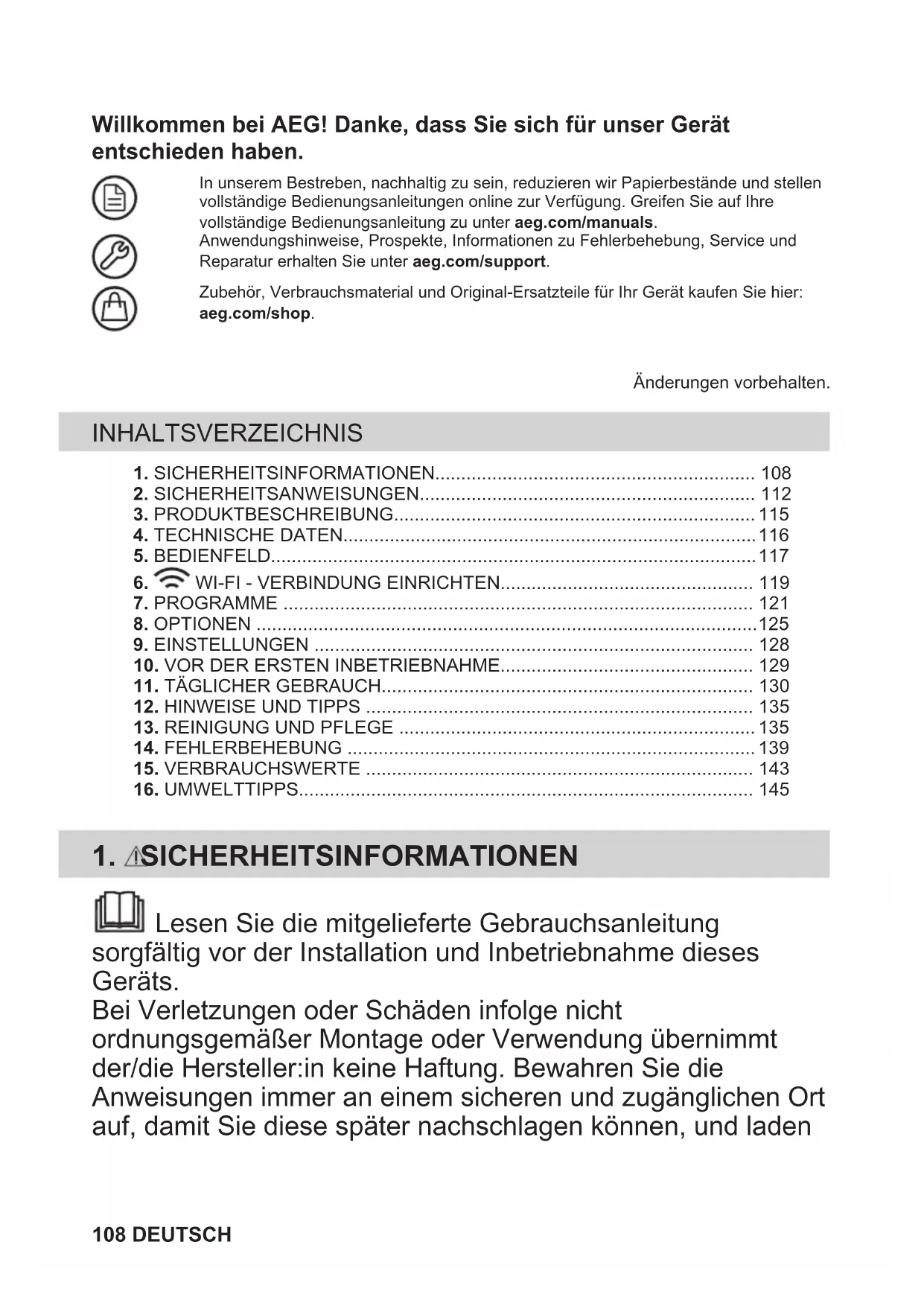 - Recyclez les matériaux portant le symbole . Déposez les emballages dans les conteneurs prévus à cet effet. Contribuez à la protection de l'environnement et à votre sécurité, recyclez vos produits électriques et électroniques. Ne jetez pas les appareils portant le symbole avec les ordures ménagères. Emmenez un tel produit dans votre centre local de recyclage ou contactez vos services municipaux. FRANÇAIS 107Willkommen bei AEG! Danke, dass Sie sich für unser Gerät entschieden haben. Table title.In unserem Bestreben, nachhaltig zu sein, reduzieren wir Papierbestände und stellenvollständige Bedienungsanleitungen online zur Verfügung. Greifen Sie auf Ihrevollständige Bedienungsanleitung zu unter aeg.com/manuals.Anwendungshinweise, Prospekte, Informationen zu Fehlerbehebung, Service undReparatur erhalten Sie unter aeg.com/support.Zubehör, Verbrauchsmaterial und Original-Ersatzteile für Ihr Gerät kaufen Sie hier: aeg.com/shop.Änderungen vorbehalten. INHALTSVERZEICHNIS 1. SICHERHEITSINFORMATIONEN p. 1082
