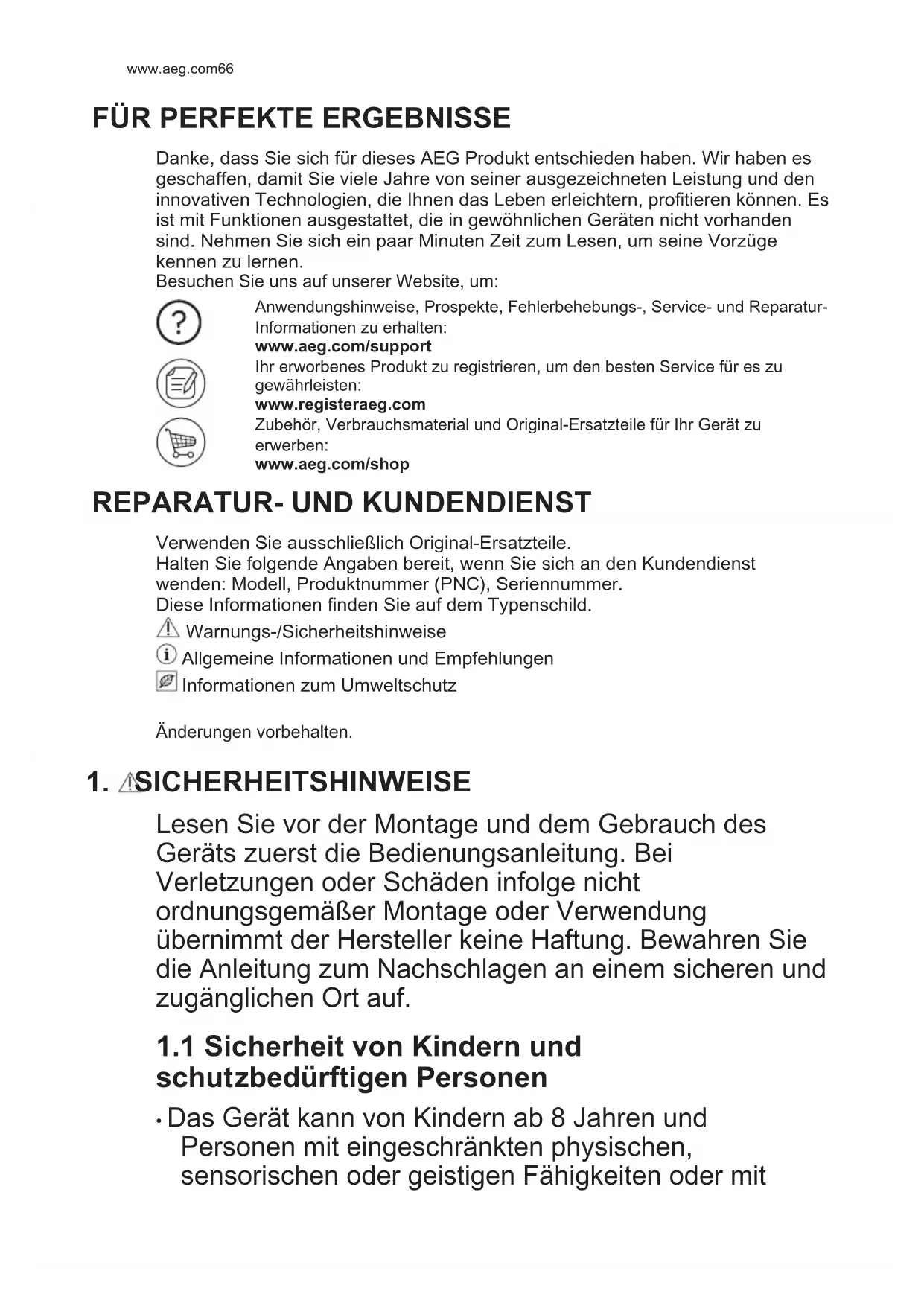 Danke, dass Sie sich für dieses AEG Produkt entschieden haben. Wir haben es geschaffen, damit Sie viele Jahre von seiner ausgezeichneten Leistung und den innovativen Technologien, die Ihnen das Leben erleichtern, profitieren können. Es ist mit Funktionen ausgestattet, die in gewöhnlichen Geräten nicht vorhanden sind. Nehmen Sie sich ein paar Minuten Zeit zum Lesen, um seine Vorzüge kennen zu lernen. Besuchen Sie uns auf unserer Website, um: Anwendungshinweise, Prospekte, Fehlerbehebungs-, Service- und Reparatur- Informationen zu erhalten: www.aeg.com/support Ihr erworbenes Produkt zu registrieren, um den besten Service für es zu gewährleisten: www.registeraeg.com Zubehör, Verbrauchsmaterial und Original-Ersatzteile für Ihr Gerät zu erwerben: www.aeg.com/shop